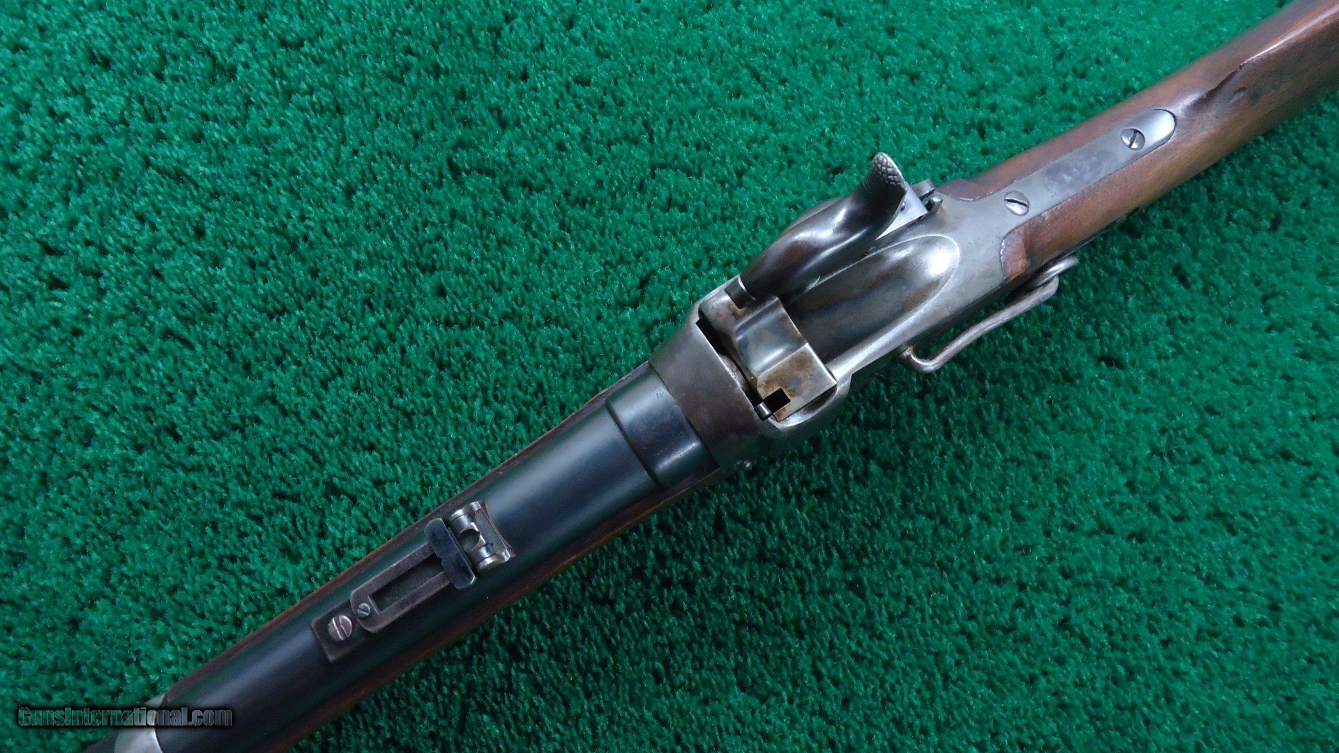 Description: 22 inch round three-groove rifling barrel with an excellent bright shiny bore chambered in 50-70 caliber. Barrel retains most all of it's arsenal refurbished blue. Original sights. Receiver and lockplate have some good case colors in the protected areas with the balance a mix of gray/brown patina. Markings are good but soft on the left side. Saddle ring bar is slightly bent in the middle. Walnut stocks are in fine condition with oil finish and light handling mars. A nice crisp "DFC" inspector cartouche on the left side of the buttstock. Good crisp action. A good looking cartridge- converted Sharps carbine for your collection. Leroy Merz Antique Firearms specializes in antique and vintage Winchesters and other fine American firearms. Since 1965 Mr. Merz has taken part in the world of firearms and has been a contributor to many well known reference books. We have hundreds of additional guns in every price range at our home online. Search for Merz Antiques in google. SOLD Antique: Yes Rifle Caliber: .50-70 Government |