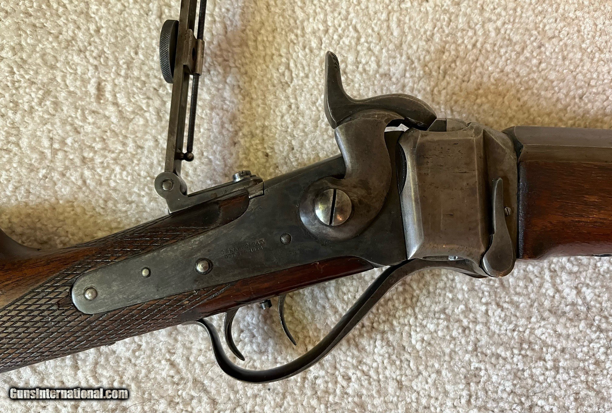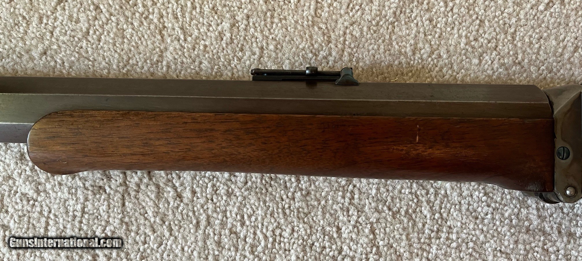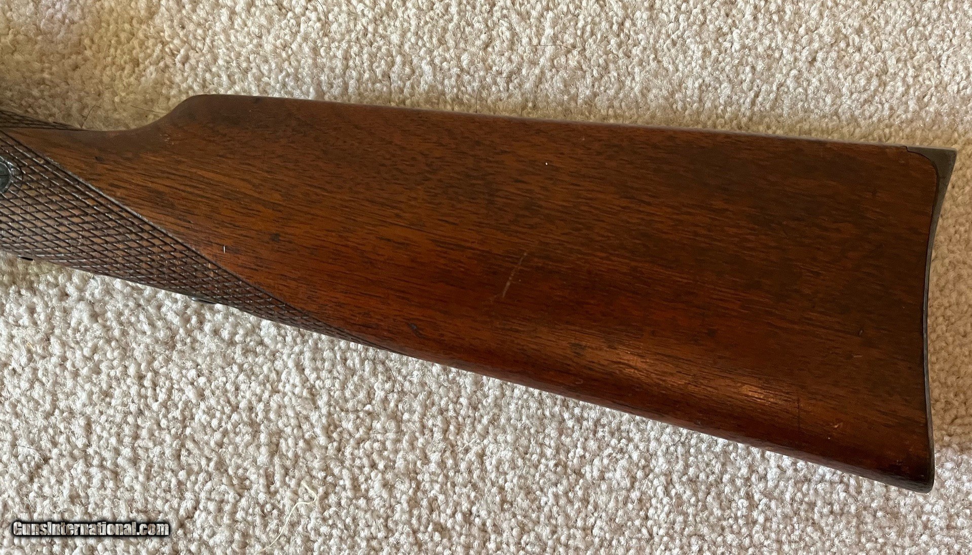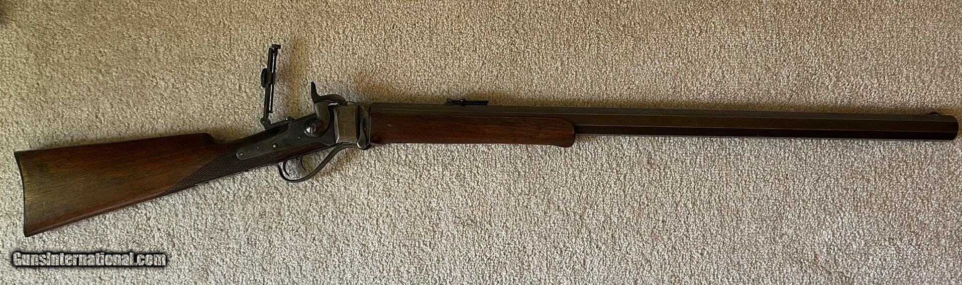 Description: This is a massive Sharps 1863 that was converted in the period into what can only be described as a buffalo rifle. My best guess would be that this was done in the early 1880s after Sharps had closed, as the barrel is mostly unmarked aside from a couple proof marks and the number "18". Just as well, the trend of the day seems to be that the markings were hit and miss, with some guns getting all of them, and some none. Who knows. The condition of this rifle is excellant in my opinion, with original case colors still being visible, and the wood remaining largely undamaged with the exception of a hairline crack in the forearm. The serial number is visible under the tang sight - it is 98472. The action works flawlessly, as do the set triggers. The barrel measures in at 30 inches and 1 1/2 inches across flats. As can be found in old Meacham catalogs, this spec of rifle would have been ordered as a "45-90 to 120". Essentially, it was up to the buyer as to how big of a cartridge they wanted. The barrel is confirmed to be .45 cal., however I am not sure of the exact cartridge. A 45-90 does fit, though with such a heavy gun, I would not be surprised if it was closer to 45-120. This lines up with other examples that I have seen sell at in recent years - a couple rifles exactly like this one have sold at Morphy's, and can be viewed by searching their . The Vernier tang site appears to have been added in the period, as it has a similar level of wear to it. The sights on the barrel appear to be in good condition, however just as well, there is evidence that this rifle previously had a scope on it. All in all, a very cool extra heavy Sharps that is not often seen. If you have any questions, or would like any additional pictures, do not hesitate to ask. The payment methods listed are the only ones that I will accept. SOLD Antique: Yes Rifle Caliber: .45 Manufacturer: Sharps Model: 1863 Serial Number: 98472 Barrel Length: 30 |