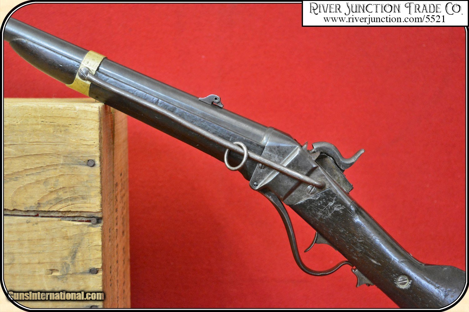 Description: “BLEEDING KANSAS” Slant Breech SHARPS Carbine Famous for the Free-Staters v. Border Ruffians. While John Browns body lies a-molderng in his grave. Sharps Model 1853 Slant Breech Saddle Ring Carbine manufactured in Hartford, Connecticut, circa 1854. Only about 10,500 of these carbines were made. They were purchased by civilians and the U.S. military. The Sharps, had a rate of fire of at least 18 shots per minute in the 1857 US Ordnance Trials. It is estimated that over 1,200 Sharps Model 1853 Carbines were smuggled into Kansas by “Abolitionists” such as John Brown and preacher Henry Ward Beecher. These were known as “Beecher’s Bibles” as they were shipped in crates marked “BOOKS”. On the other side were the pro-slavery “Border Ruffians”. There is record of at least 300 going to a St. Louis dealer, for the Border Ruffians. This carbine is serial # 13586. The overall condition is very smooth with almost no external pitting. The markings are clear. The numbers match. The walnut stock is in good shape with a chip out of the toe. The bore is shinny bright with strong rifling. The action is excellent. Barrel is 21-1/2 inches. Caliber: .52 This is an ANTIQUE and can be shipped directly to you in the USA. We do ship antique arms INTERNATIONALLY. Adult signature required, know your customs requirements. Sold as an Antique ~ no guarantees, warranties, or liabilities for any actual usage. If any firearms are to be used for shooting purposes, a qualified gunsmith should inspect them first We always answer questions and entertain offers. Payment: Item, can be ordered with a credit card or paypal on our sight. Just Google (riverjunction) and type in the River Junction Trade Co. item number (5521) in the search box. Before you checkout you will see shipping cost and total. OR If you prefer: Pay by cash, postal money order, cashiers check, personal & business checks. We wait for checks to clear. Have questions? Call me 563-880-4588. Jim LAYAWAY PROGRAM. We accept Bank Check, Money order, Personal checks or wire transfer. Items over $1000.00 can layaway at 1/3 down and 1/3 in 30 days and balance in the following 30 days. No discount is offered on layaway items. We are open to offers at any other time. SOLD |