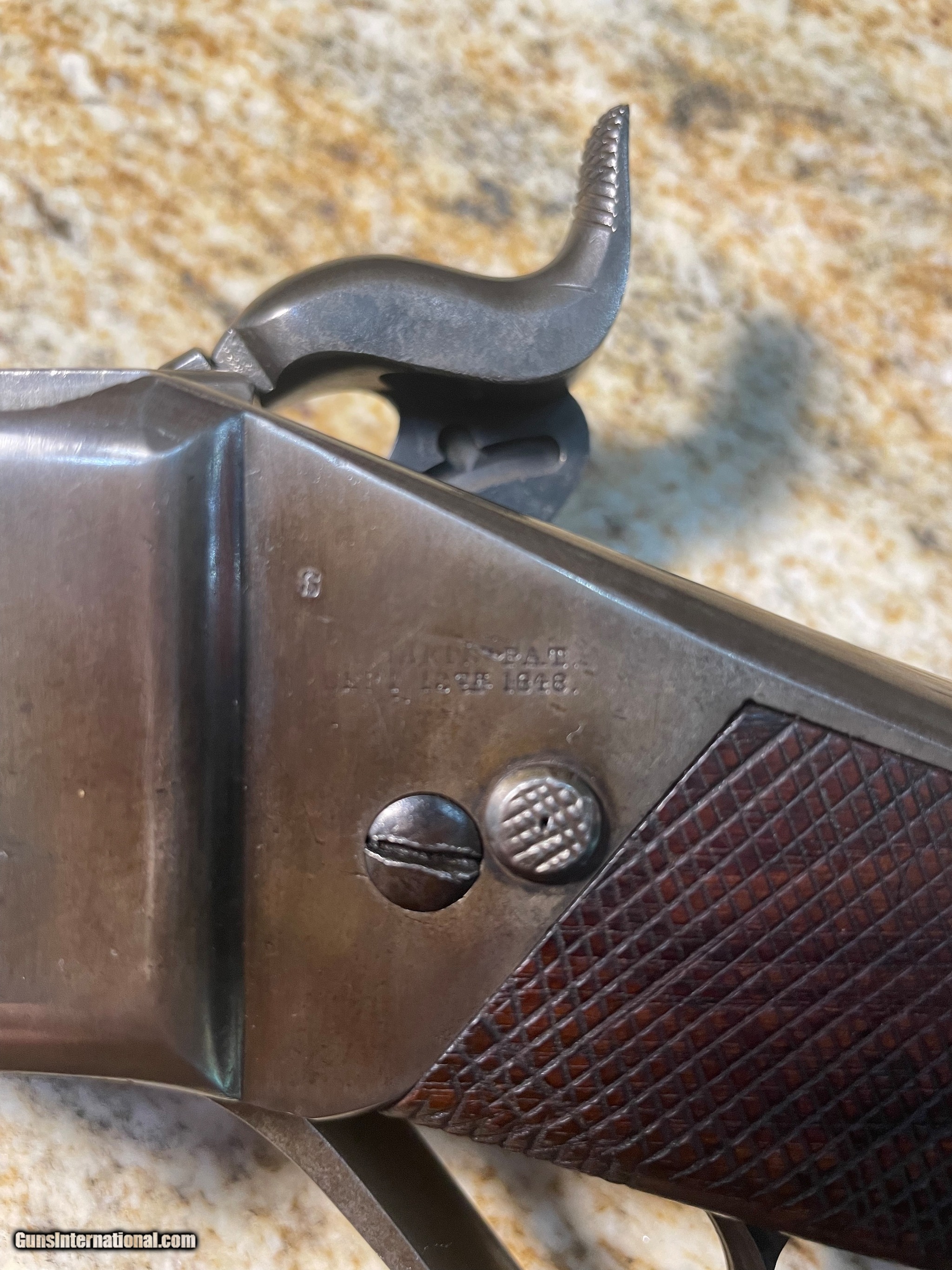 Description: Guns Listing ID: 532935 This Sharps New Model 1859 Carbine is in very good condition with the .52 caliber 22” barrel bore in bright shiny shape. The saddle ring and it’s holder is missing and a previous owner at some time has embellished the stock representing possibly the only reductions in value to this fine weapon. The stock cartouche is present as well as are each of the normal imprinted dates. SOLD Antique: Yes Manufacturer: C. SHARPS ARMS, INC. Model: 1859 Caliber Info: 52 CAL Condition: Used - Non-Certified Barrels: 22 BARREL Finish: BLUE |