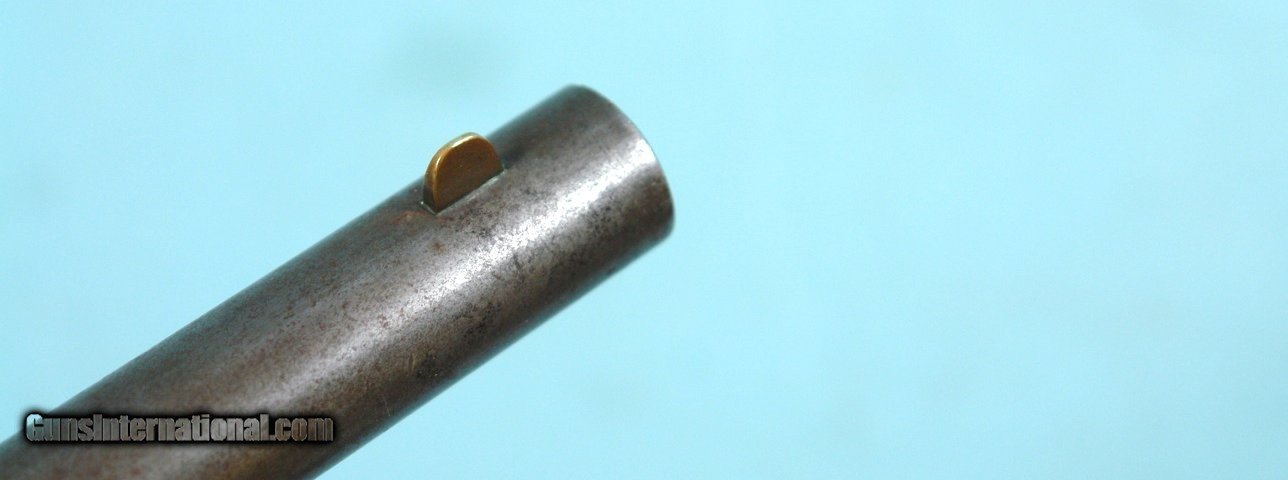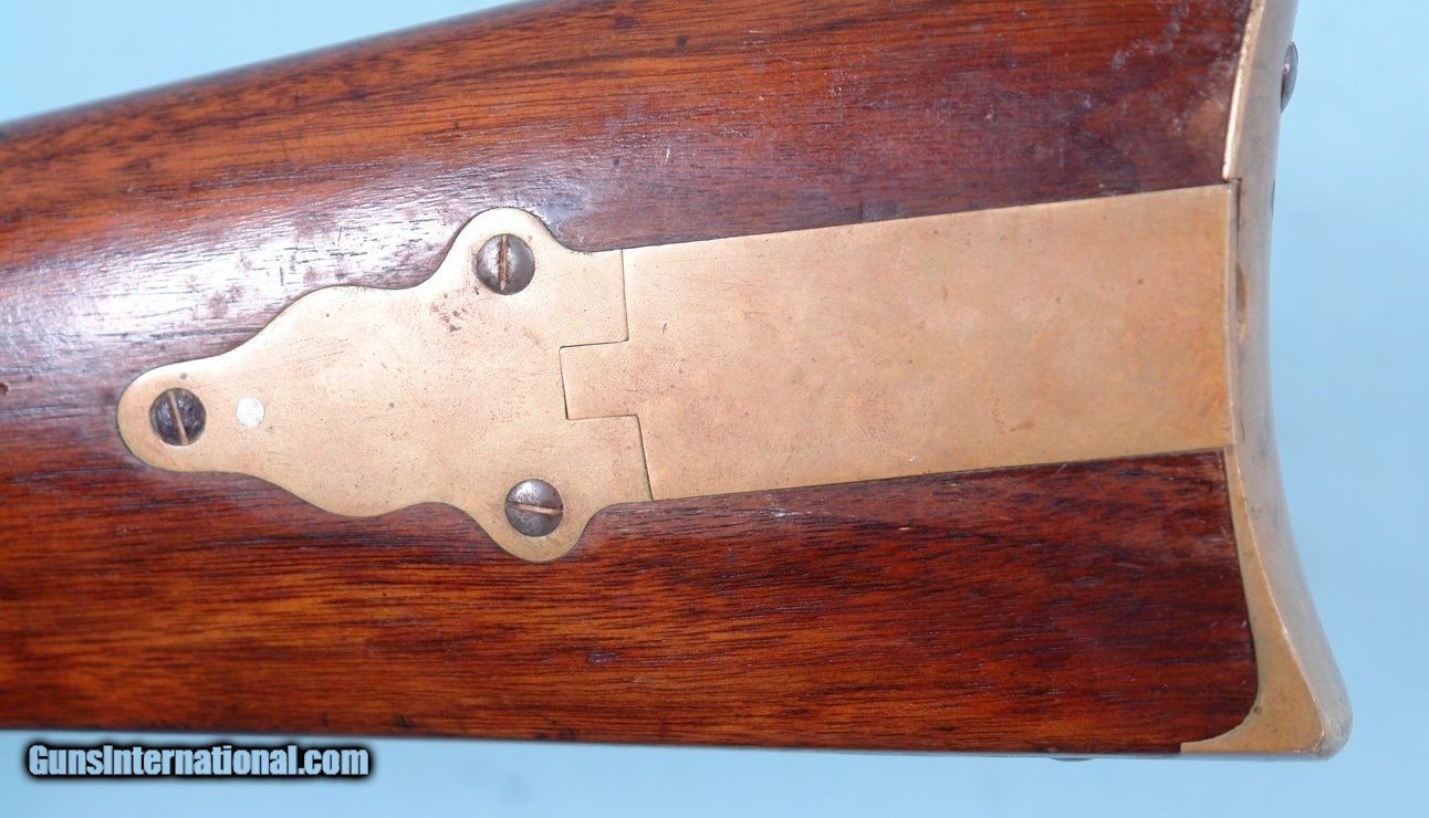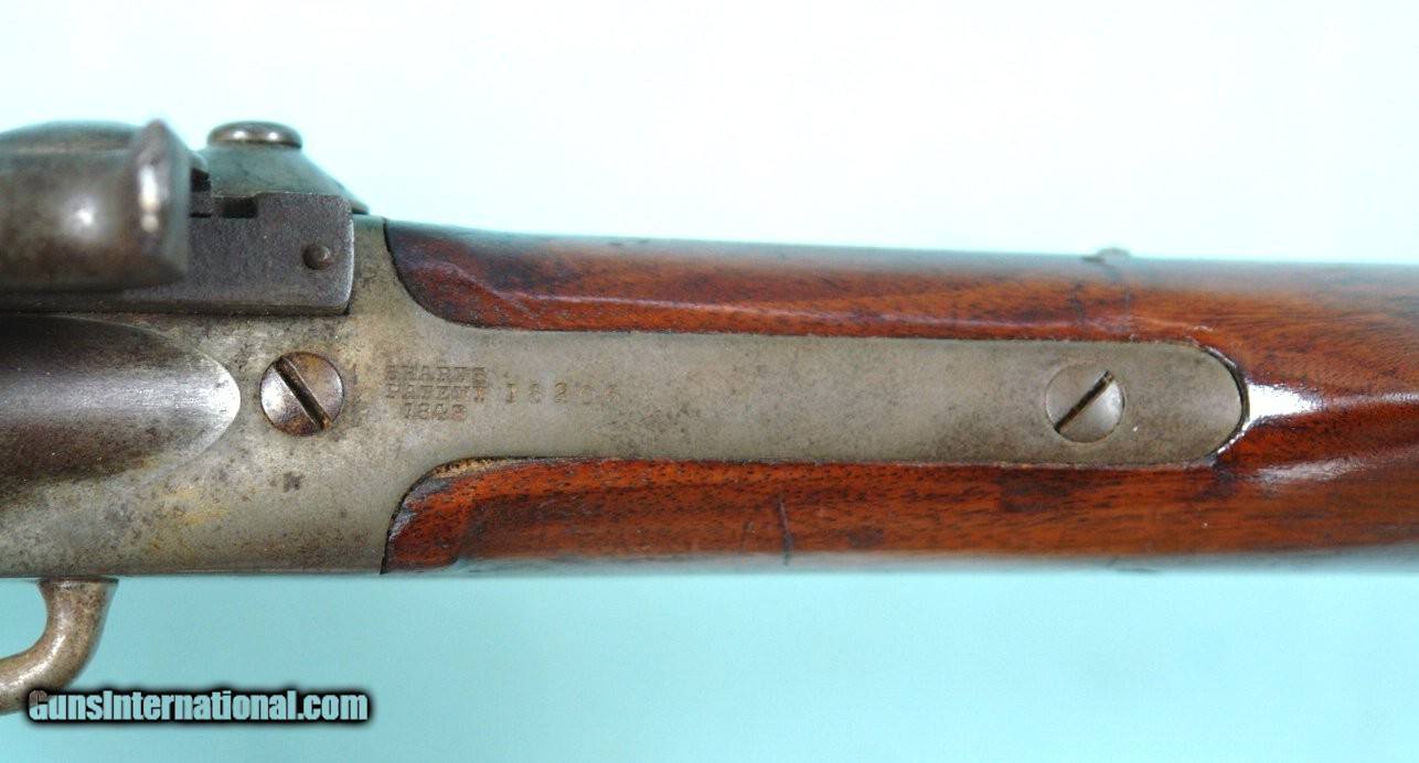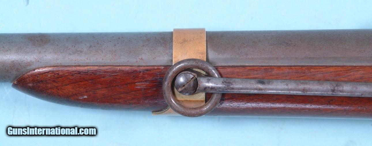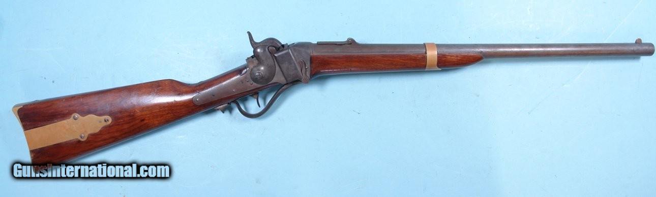Description: 32556- CIVIL WAR EXCELLENT SHARPS MODEL 1853 SLANT BREECH “JOHN BROWN” CAVALRY CARBINE. .52 caliber rifled 21 ½” barrel with the original Sharps factory front and rear sights.. 100% original and all matching including the barrel and forend. Serial number 16206 only 5 numbers away from one of the 1st California Volunteer Cavalry carbines listed in the Springfield Research Service, Vol. 2 and close in number to many other of the same unit which were shipped from Springfield Armory in 1862 and saw extensive service during the Civil War in the West as well as against Apache Indians. Perfect Sharps markings and patent date stamps. Perfect screws with some of the original blue. Mellow unpolished brass. Excellent with mousey grey case-hardened frame and barrel with a grey patina and the original polished finish under the forend. Has all the original finish on the stock and forend. Forend with small chip at rear on underside abutting the frame. Excellent bore and tight working order. Desirable early model with long ring bar referred to as the John Brown model and the type used in the raid on Harpers Ferry. Superior example of one of these scarce Sharps carbines. $4950. SOLD Antique: Yes Rifle Caliber: .52 |