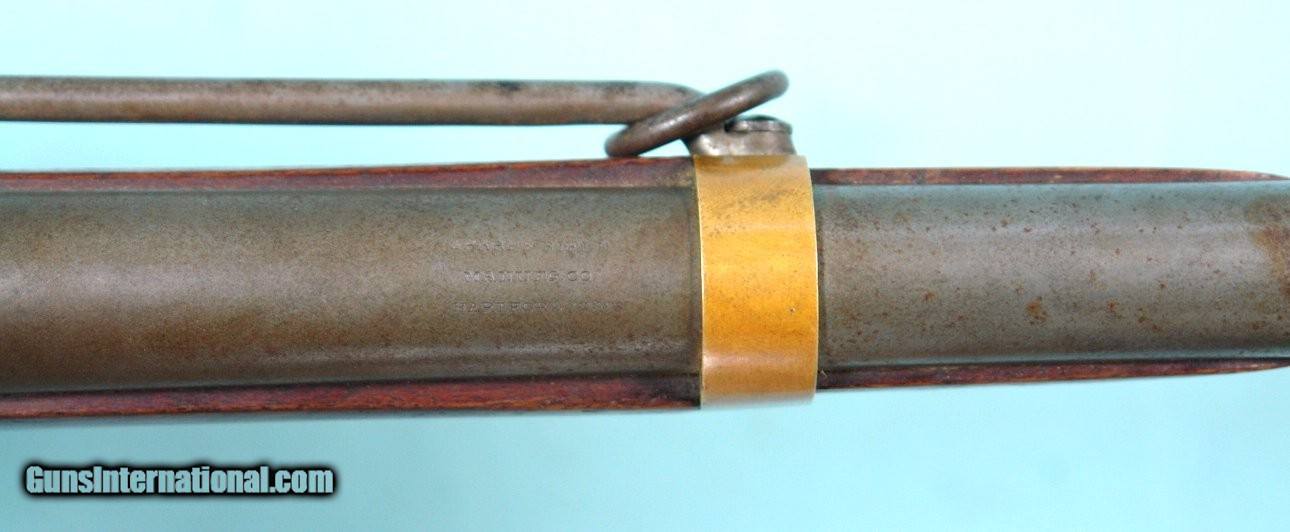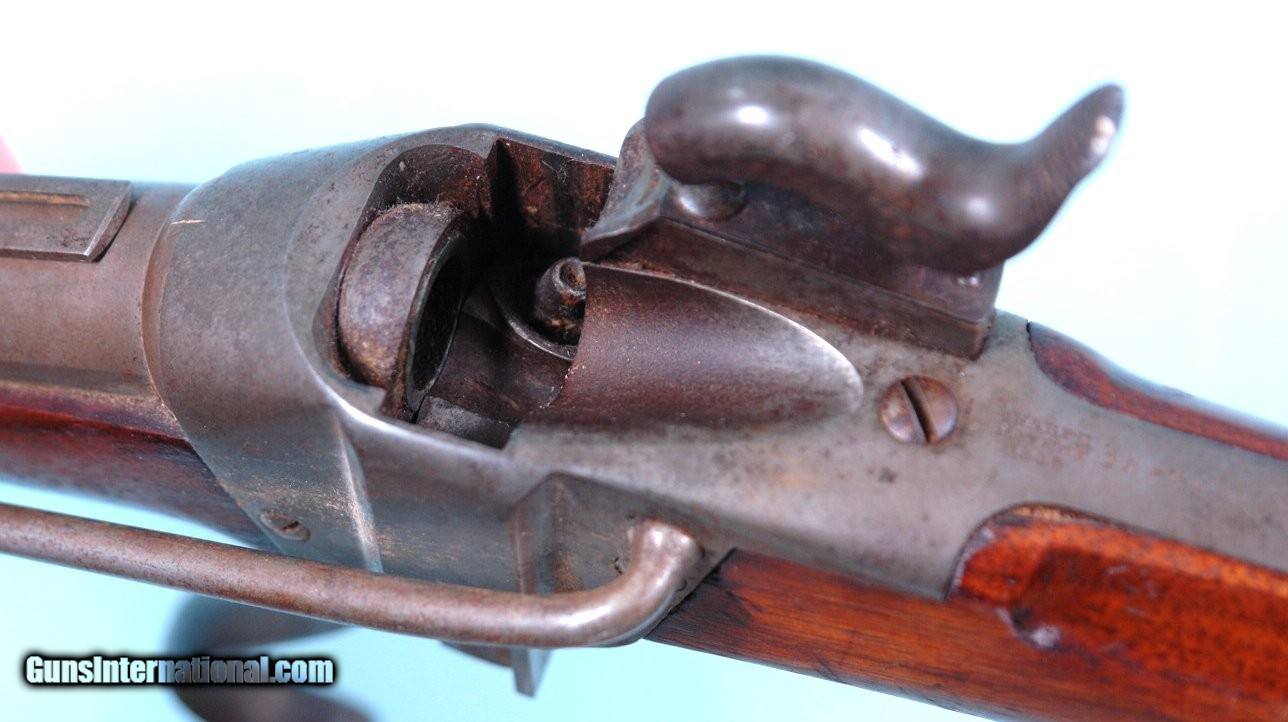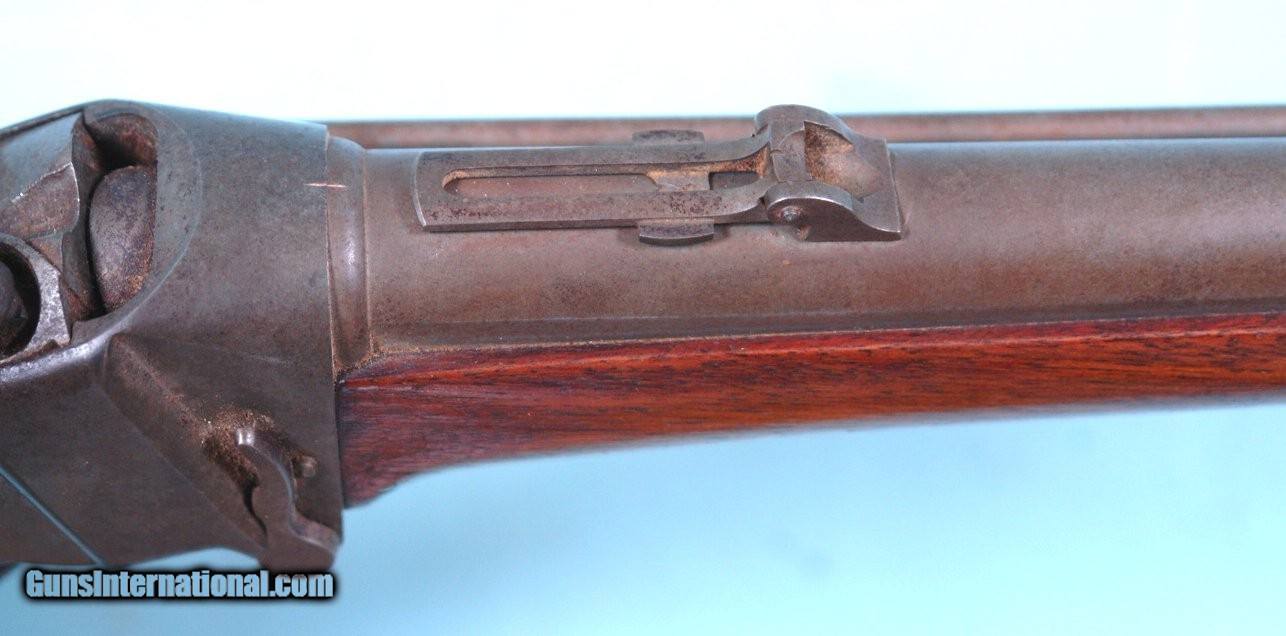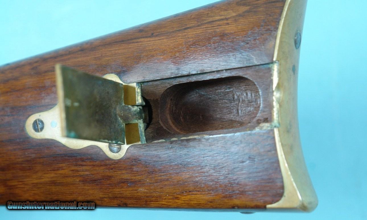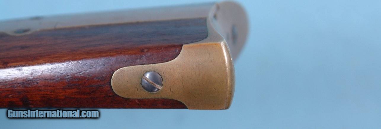 Description: 32556- CIVIL WAR EXCELLENT SHARPS MODEL 1853 SLANT BREECH “JOHN BROWN” CAVALRY CARBINE. .52 caliber rifled 21 ½” barrel with the original Sharps factory front and rear sights.. 100% original and all matching including the barrel and forend. Serial number 16206 only 5 numbers away from one of the 1st California Volunteer Cavalry carbines listed in the Springfield Research Service, Vol. 2 and close in number to many other of the same unit which were shipped from Springfield Armory in 1862 and saw extensive service during the Civil War in the West as well as against Apache Indians. Perfect Sharps markings and patent date stamps. Perfect screws with some of the original blue. Mellow unpolished brass. Excellent with mousey grey case-hardened frame and barrel with a grey patina and the original polished finish under the forend. Has all the original finish on the stock and forend. Forend with small chip at rear on underside abutting the frame. Excellent bore and tight working order. Desirable early model with long ring bar referred to as the John Brown model and the type used in the raid on Harpers Ferry. Superior example of one of these scarce Sharps carbines. $4950. SOLD Antique: Yes Rifle Caliber: .52 |