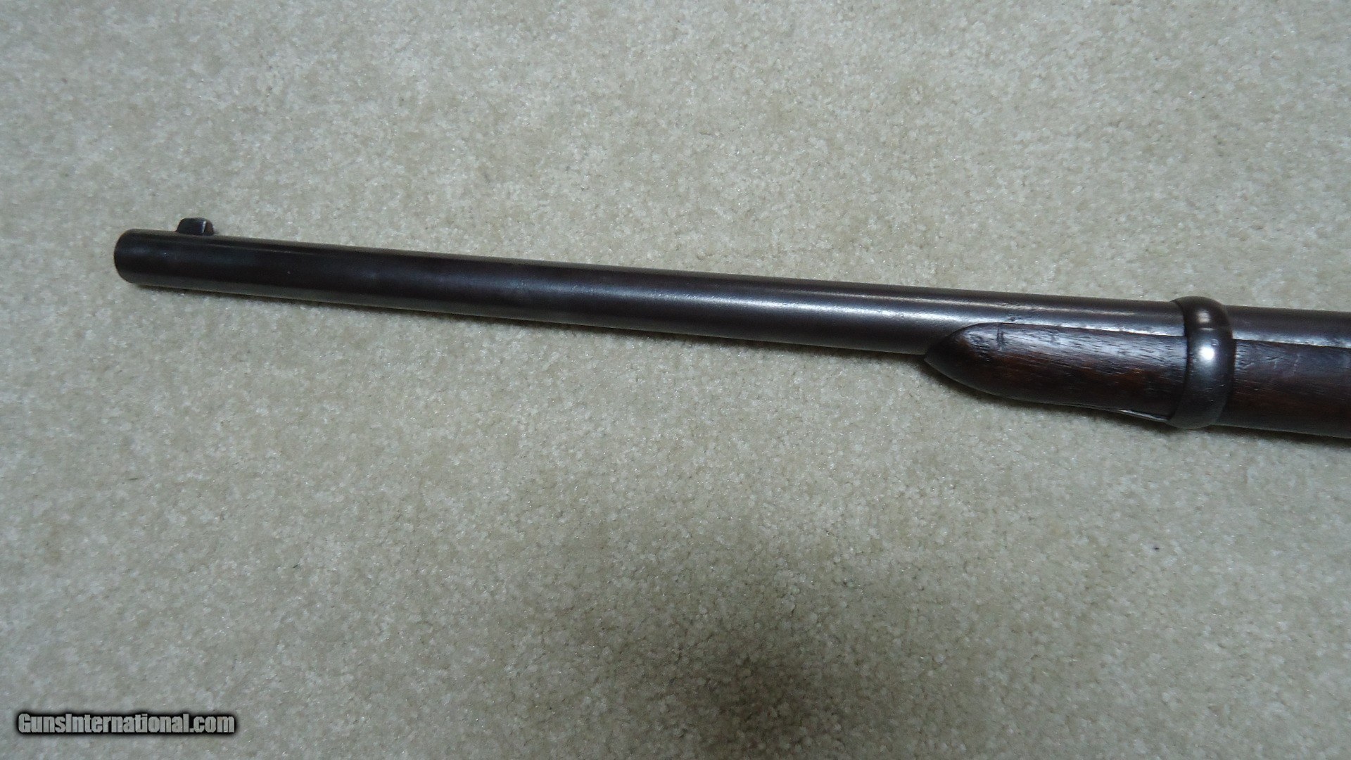 Description: HEAVILY FRONTIER USED SHARPS 1859 CIVIL WAR CARBINE CONVERTED TO .50-70 FOR INDIAN WAR USAGE. This carbine with serial number 44XXX started out as a percussion cavalry carbine issued to the Union Forces in the Civil War where almost all saw heavy battle use. After the war, around 1867-68, most of these surplus guns were overhauled and converted to the then standard government round .50-70 and reissued for Indian War usage. These were reliable and powerful weapons that were used with great success (along with Spencer Carbines) by the cavalry units in the west until being replaced with the new Springfield 1873 rifles and carbines in .45-70. Once again surplus, many of these Sharps .50-70s found their way back to the frontier where they were effective on all game from antelope to grizzly and bison as well as against two legged adversaries. So, these Sharps carbines are loaded with history from Civil War to Indian Wars to civilian frontier service. Usually a quick visual inspection will detect which of this type weapon remained in store houses and which saw hard use. This is one of the latter and exudes history and adventure! Metal surfaces are an even very aged dark patina with a few minor scattered areas of light rust pitting. Receiver markings are all visible and fairly clear. The barrel retains the correct Lawrence ladder rear sight with small carbine front blade front sight. The wood is the most interesting in that it displays heavy sling ring wear above the retaining ring bar. Further, there is the worn in vertical wear line in the left side of the middle of the stock where the metal sling swivel attached to the leather shoulder strap rubbed. The forend shows saddle wear especially ahead of the barrel band on the right side. The wood shows heavy wear overall, but is solid and not chipped. The action is crisp and surprisingly the three groove rifled bore is still bright and was obviously well maintained! This Sharps has "been there and done that!" A wonderful piece of American history through several time periods! SOLD Antique: Yes Manufacturer: SHARPS Model: 1859 SRC CONVERSION Serial Number: 44XXX Condition: VG Bore Condition: FINE+ |