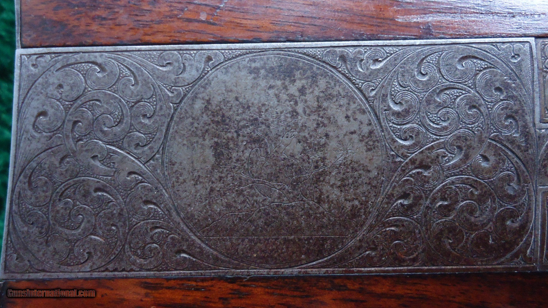 Description: Caliber 44. Octagon heavy weight 26 inch barrel. Features a globe front sight, flip up Sharps rear sight and folding tang sight. This gun is in beautiful condition with fancy wood. Most original varnish remains. The silver presentation plaque on the side of the stock says "Presented by the Students in the Col. &Institute to their Military Instr. Lieut. Inman Bissell U.S.A. 1855"". Very elaborately engraved. Entire receiver is covered with beautiful scroll engraving. There is a panel seen of a hunter on one side and a panel scene on the patch box on the opposite side. Gun has been engraved by Gustave Young in his typical style. Double set triggers. Fine bore. Rifle style buttplate. Inman Bissell was highly decorated and gun comes with an abundance of information on him and his career. The provenance lists several well known collectors such as Norm Flayderman and Tom Seymore. Gun has excellent markings and sharp corners. Engraving is sharp. Wood has a few minor dings. No splits or cracks. I believe this represents the finest engraving that Sharps offered. Just beautiful. This is a real piece of Americana. Leroy Merz Antique Firearms specializes in antique and vintage Winchesters and other fine American firearms. Since 1965 Mr. Merz has taken part in the world of firearms and has been a contributor to many well known reference books. We have hundreds of additional guns in every price range at our home online. Search for Merz Antiques in google. SOLD Antique: Yes |