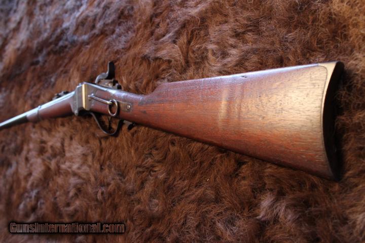 Description: Rare Sharps 1859 New Model Military Carbine in original percussion configuration. Orig patch box stock with faded cartouches. Good amount of original blue and excellent bore on 1859 marked barrel. hammer marks (see photos) on both sides of framr where lever pin was knocked in and out. Overall a fine and rare 1859 Sharps SOLD Antique: Yes |