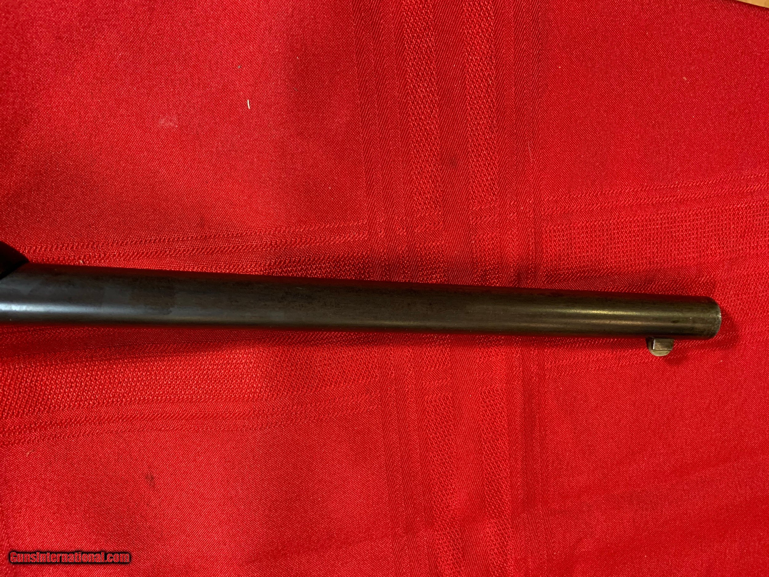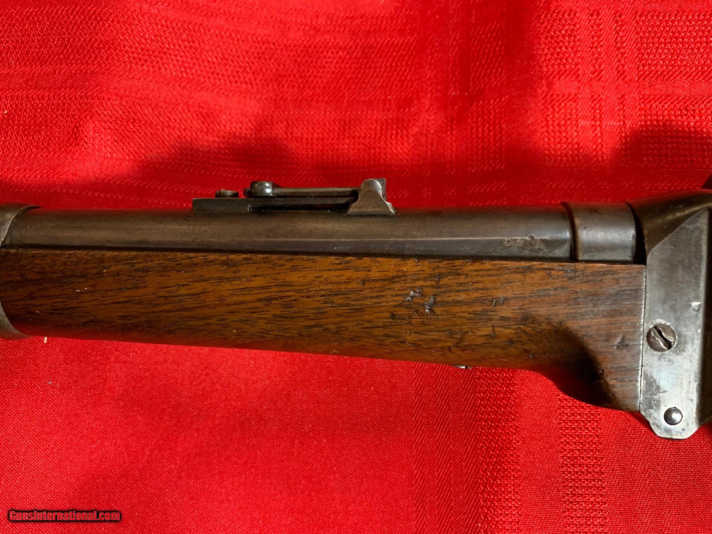 Description: Sharp's New Model SRC. Barrel marked "SHARPS RIFLE/ MANUFG CO/ HARTFORD CONN" and "NEW MODEL 1863". Rear sight marked "R.S. LAWRENCE/ PATENTED/ FEB 15TH 1859". Witness marks on barrel and action. Left side receiver marked "SHARPS PAT./ SEPT. 12TH 1848". Cartouche under saddle ring. Saddle ring slide retainer marked " EAW". Lock plate marked " R S LAWRENCE PAT/ APRIL 12TH 1859" and "C SHARPS' PAT./ OCT 5TH 1852" Serial number C, 8777. Very nice bore, good mechanics. NOT CONVERTED TO CARTRIDGE. GREAT BORE SOLD Antique: Yes |