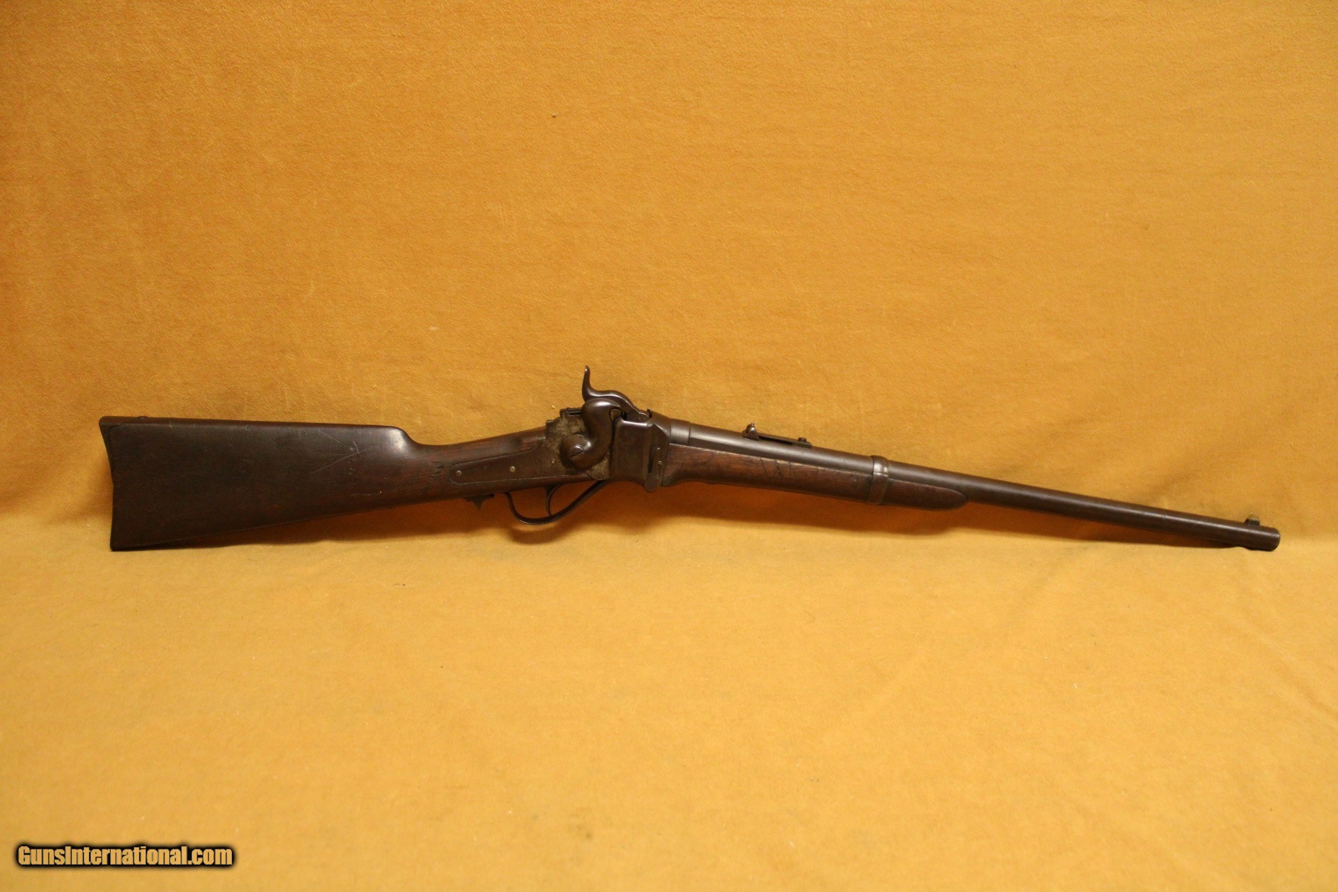 Description: In 1867, the U.S. Ordnance Department contracted with the Sharps Rifle Company for conversion of over 30,000 Sharps percussion carbines and 1,000 rifles to either the .52-70 rimfire or the .50-70 GOVT centerfire configuration. Some of these arms retained their original six-groove rifling, while the bores of others were re-lined with three-groove rifling, as is this example. New buttstocks without cartridge boxes were used in all cases where replacement was required, regardless of the original configuration. The converted Carbines were stamped DFC for inspector David F. Clark in a banner cartouche on the side of the stock. These carbines were issued to the regular cavalry regiments on the western frontier and remained in service until they were replaced by the Springfield Model 1873 Carbine. The carbine has a blued barrel with casehardened barrel band, receiver, loading lever and butt plate.The folding rear sight leaf is missing. The stock and forearm are oil-finished black walnut and has a sling bar and ring mounted on the left side of the stock and receiver. The right side of the receiver is stamped with the two-line Sharps patent marks and the Lawrence and Sharps patent markings. They went on to experience some of the most exciting times in American history during the Indian Wars, the settling of the Western Frontier, and the connecting of the coasts with the railroad. The overall condition is about good. This one has patches of discoloration throughout the exterior. The action is excellent. The bore is bright with sharp rifling and some freckling. The stock shows signs of heavy use with chips and small repairs throughout. Own the original! This is a legitimate antique and not a reproduction. Barrel is 22 inches. All items are also available for sale in our brick & mortar store and are subject to prior sale. Think long, think wrong. Payment On firearms, we typically only accept credit cards or money orders/cashier's checks.