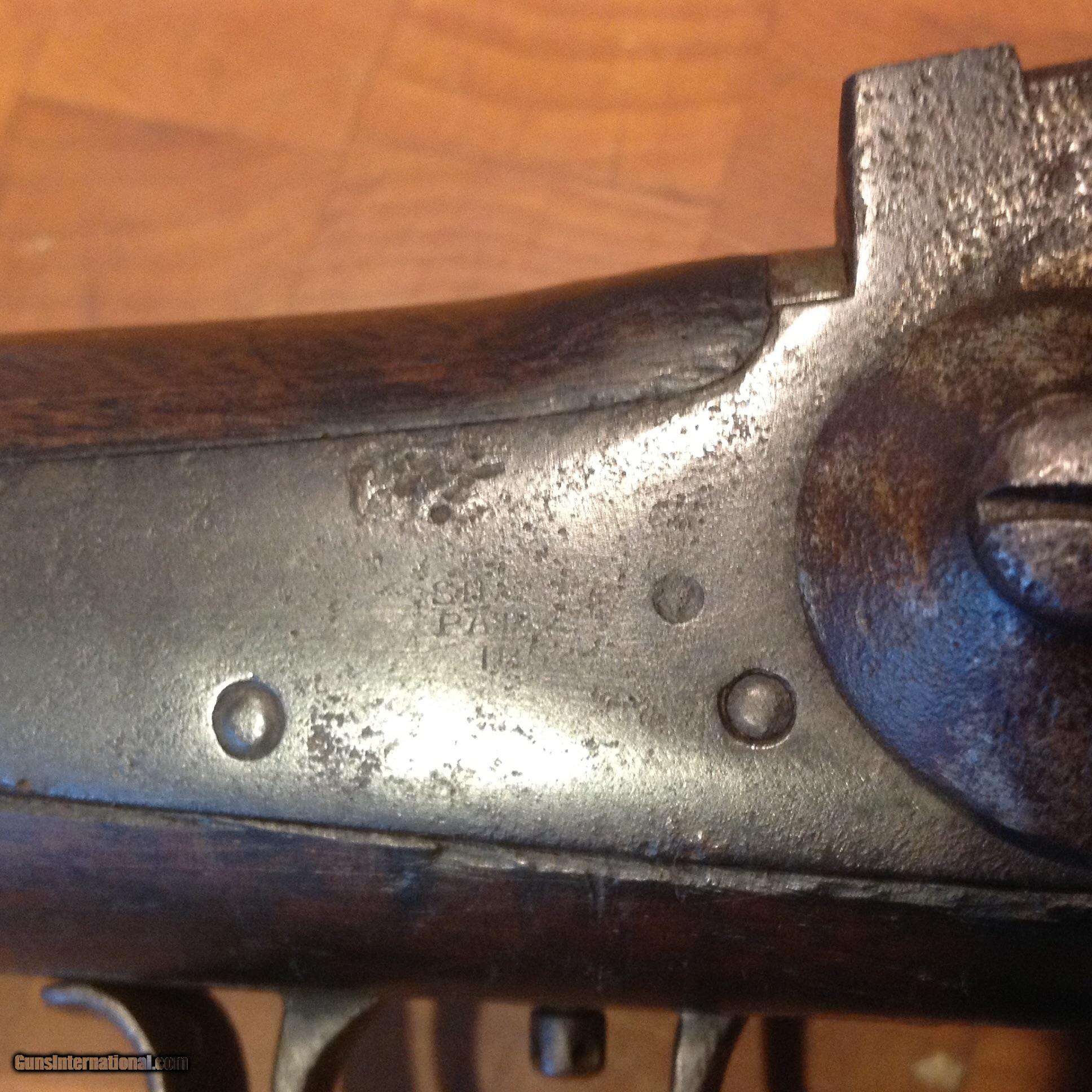 Description: SOLD. Sharps 1853 Sporting Rifle. SN 8375. Rare and original model 1853 Sharps rifle known as the "Slanting Breech” Sharps. Has the distinctive angled breech block which is where the nickname comes from. According to Flayderman's guide there were only 2,240 of these sporting rifles made with full octagonal barrels and that they were only made between 1854 and 1857. It is in the original .40 caliber barrel bore size and you can still see the lands and grooves inside the barrel. At the breech of the barrel you can see the traces of the Sharps Rifle Manufacturing Company maker's Mark as well as the Hartford, Connecticut production location. It has the stud style rear sight intact. On the tang of the barrel, you can no longer read the serial number but it is visible below the barrel. The action works on all positions. It is designed with the double trigger system to help aid in target shooting. You can still see traces of the ‘SHARPS PATENT 1852” on the lockplate. This particular version was constructed without using the saddle ring and bar. These guns have a great display because of the brass that was used on the patchbox. This one has the pewter nose cap on the end of the forestock. This gun was used but never abused. This is a nice honest 1853 Sharps pattern heavy barrel sporting rifle that will not break the bank. SOLD Antique: Yes |