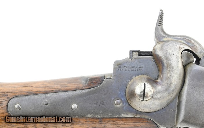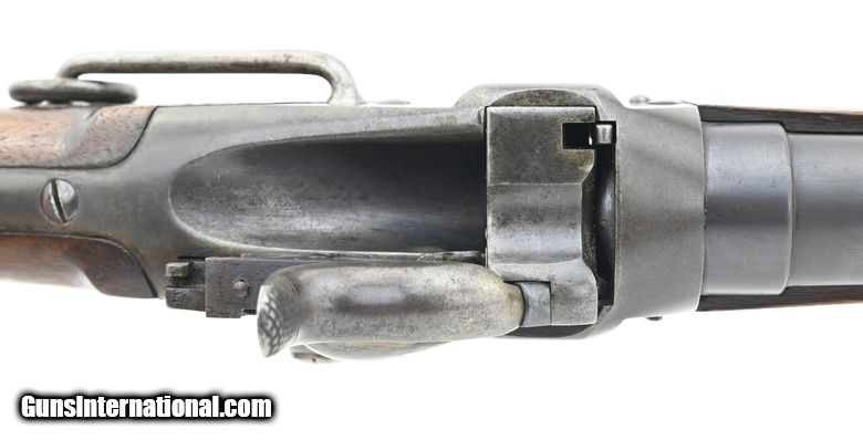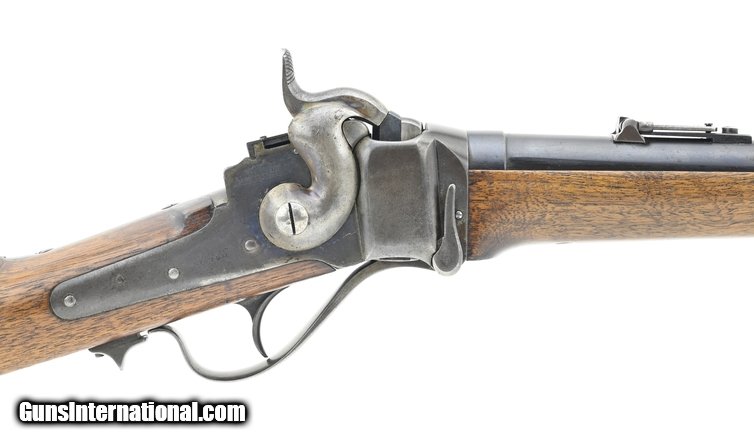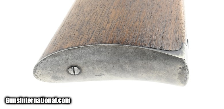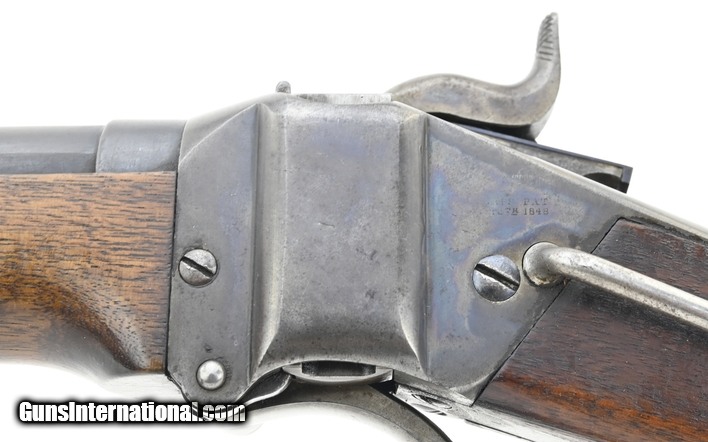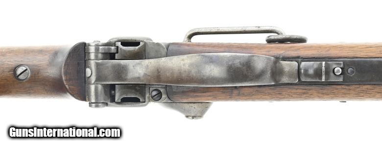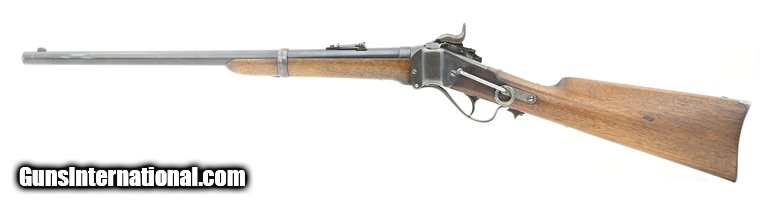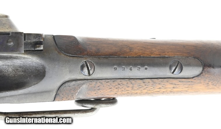 Description: U.S. military .50-70 conversion of a Civil War Sharps New Model 1863 carbine. This is an excellent example of the 3-groove lined barrel, cam type firing pin conversion (AKA Model 1868). This gun retains nearly all its conversion refinish. The barrel and band have approximately 98% blue. The approximately 50% case colors with the remainder being a smooth blue/brown. The wood is excellent with no crack or chip. The “DFC” banner cartouche is on the left butt stock. The action functions correctly and the bore is excellent. This would be a hard carbine to find in better shape. A key Indian Wars piece! SOLD Antique: Yes |