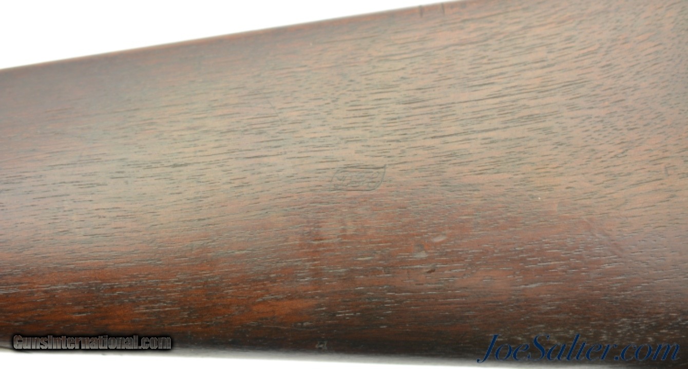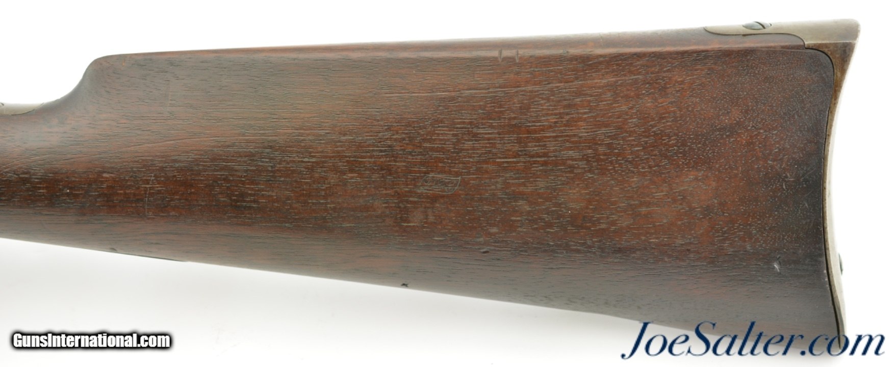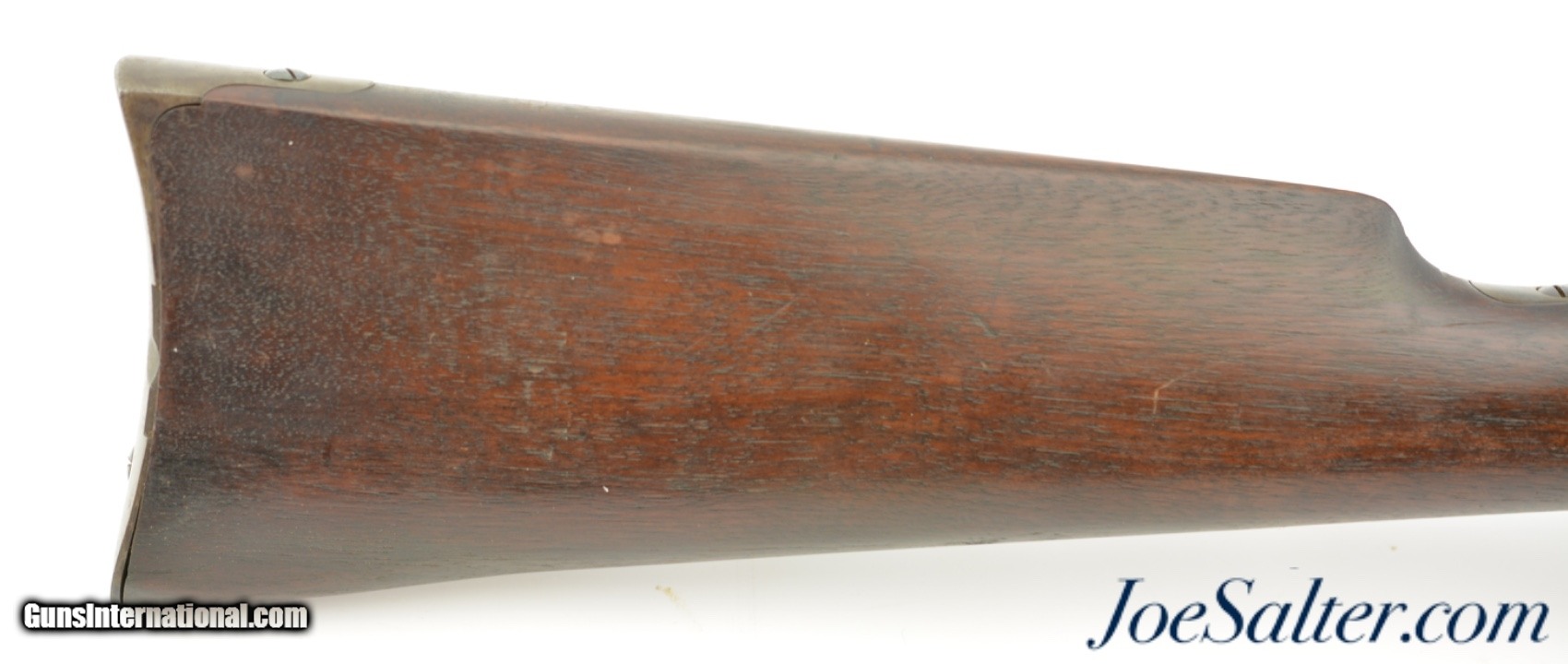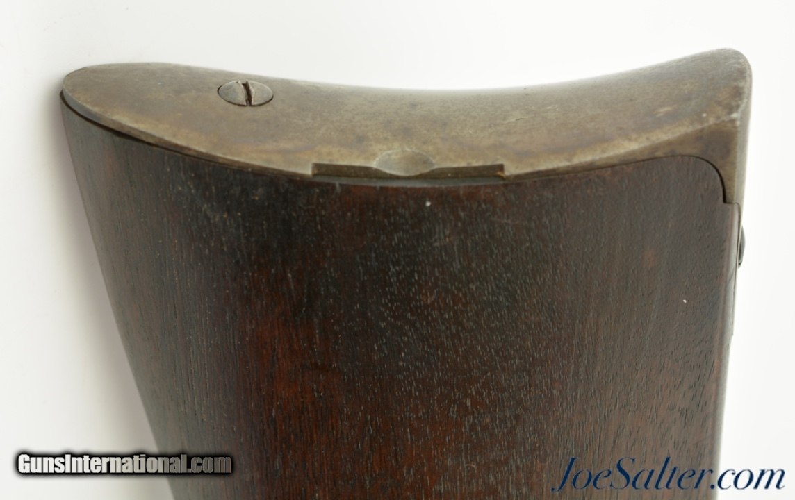 Description: Serial #C12222, .50-70, 22" barrel with a fine, bright bore that has a small amount of freckling within the grooves. This was an original Civil War carbine, converted to metallic cartridge by the US government after the war had ended. The carbine has matching numbers on the receiver and barrel, with the barrel retaining 70-75% of the conversion blue, and a commensurate amount of color case-hardening on the frame, breech-block, hammer, and lockplate. The breech-block is fitted with the late, inertia firing pin, and the original bore was left intact, unlike later conversions that had three-groove liners installed. The walnut forend and buttstock have several small handling marks and minor blemishes scattered about the reapplied military oil finish. The buttstock itself was replaced during the conversion, does not have the original patchbox, and has the "DFC" rework cartouche in the center of the stock on the left side. Additionally, an extremely well-done repair was performed at the toe to replace a large chip. The sling ring is no longer present, but the action locks up tightly, and is fully functional. This is a very good-near fine example of a desirable post-Civil War Sharps conversion. Antique; SOLD Antique: Yes |