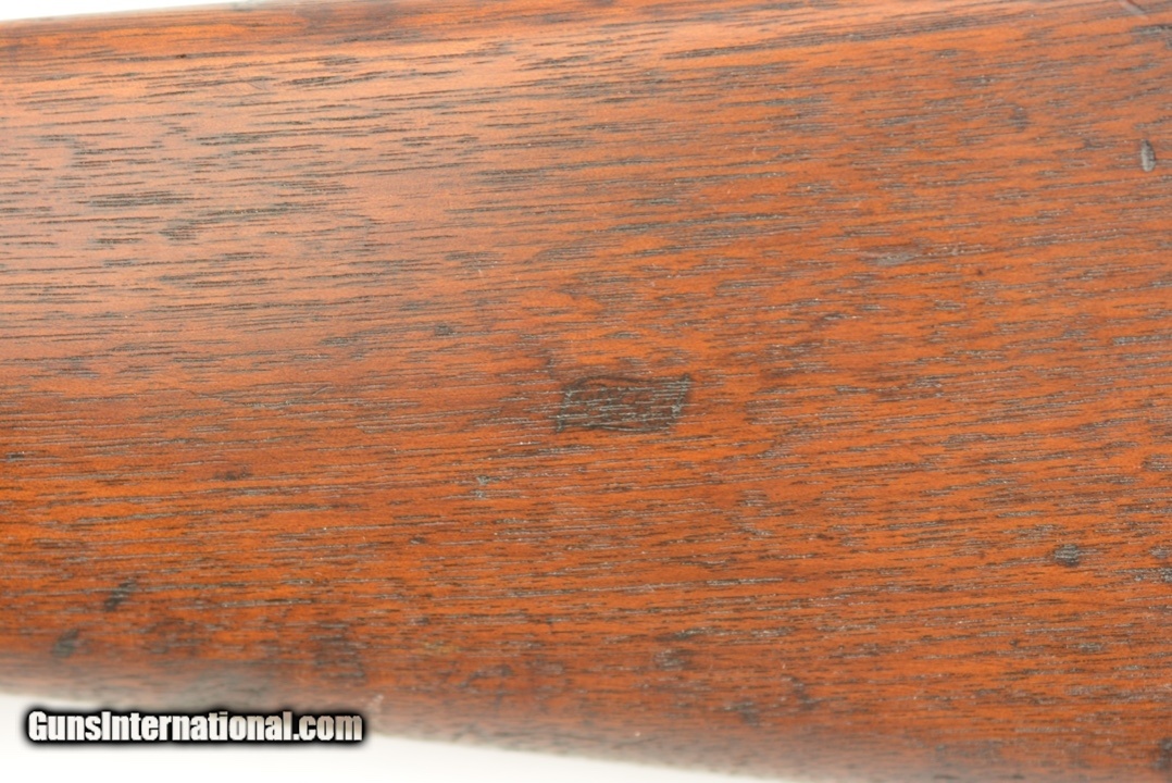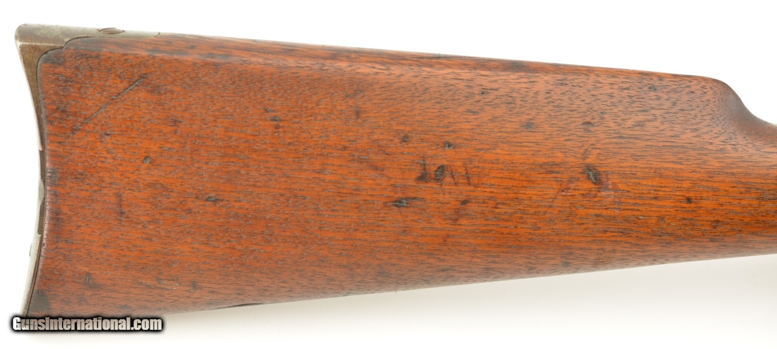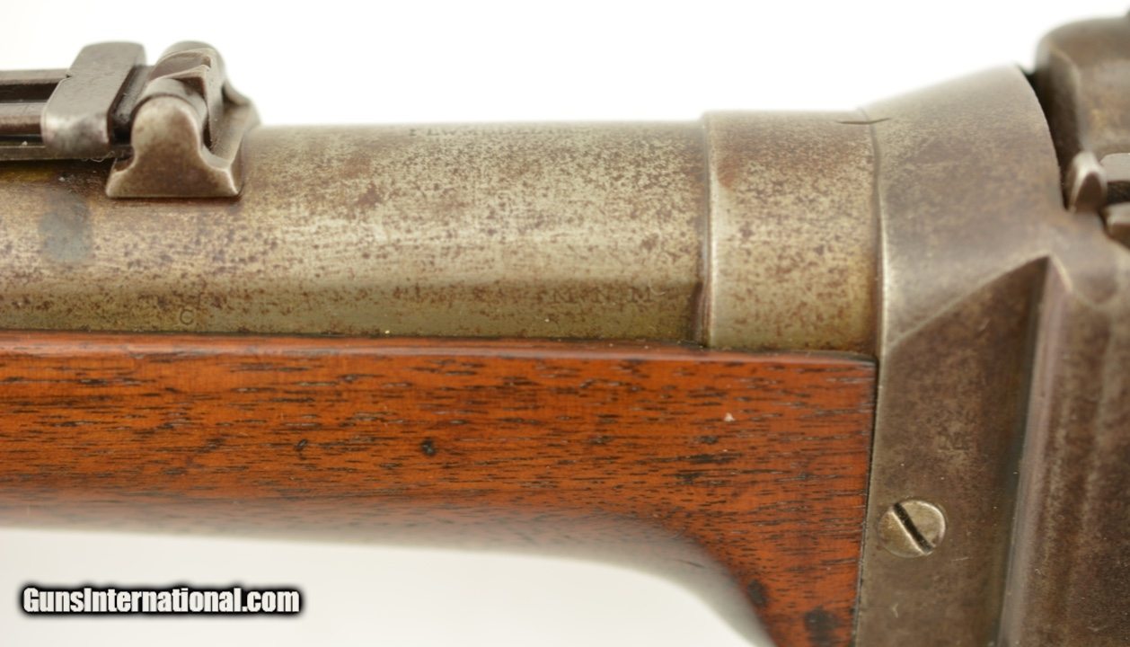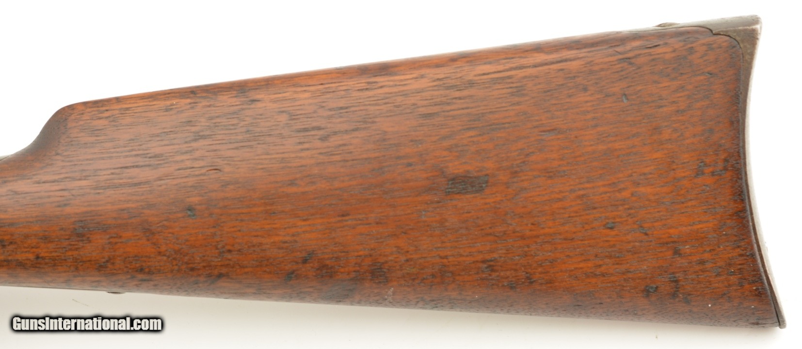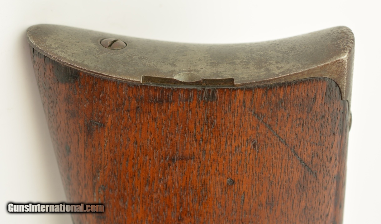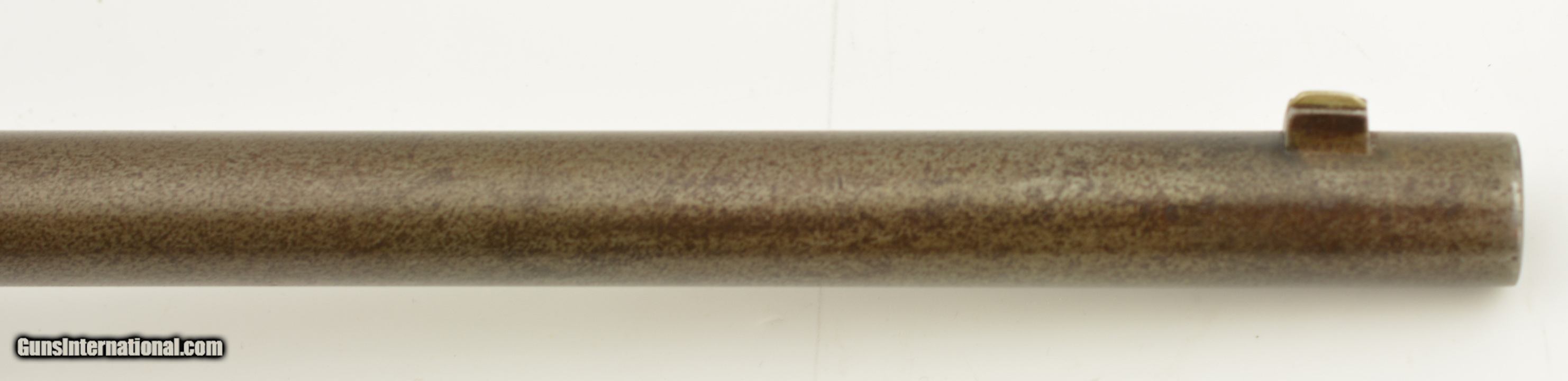 Description: Serial #C30506, .50-70, 22" barrel with an excellent, bright bore. This was an original Civil War carbine, converted to metallic cartridge by the US government after the war had ended. The carbine has matching numbers on the receiver and barrel, with the metal having an overall plum-brown and mottled gray patina. The breech-block was fitted with the early, spring-loaded firing pin, and the original bore was left intact, unlike later conversions that had three-groove liners installed. The walnut forend and buttstock have numerous small handling marks and minor blemishes scattered about the reapplied military oil finish. The buttstock itself was replaced during the conversion, does not have the original patchbox, and has the "DFC" rework cartouche in the center of the stock on the left side. The sling ring is no longer present, but the action locks up tightly, and is fully functional. This is a very good-near fine example of the most desirable version of the post-war Sharps conversion. Antique SOLD |