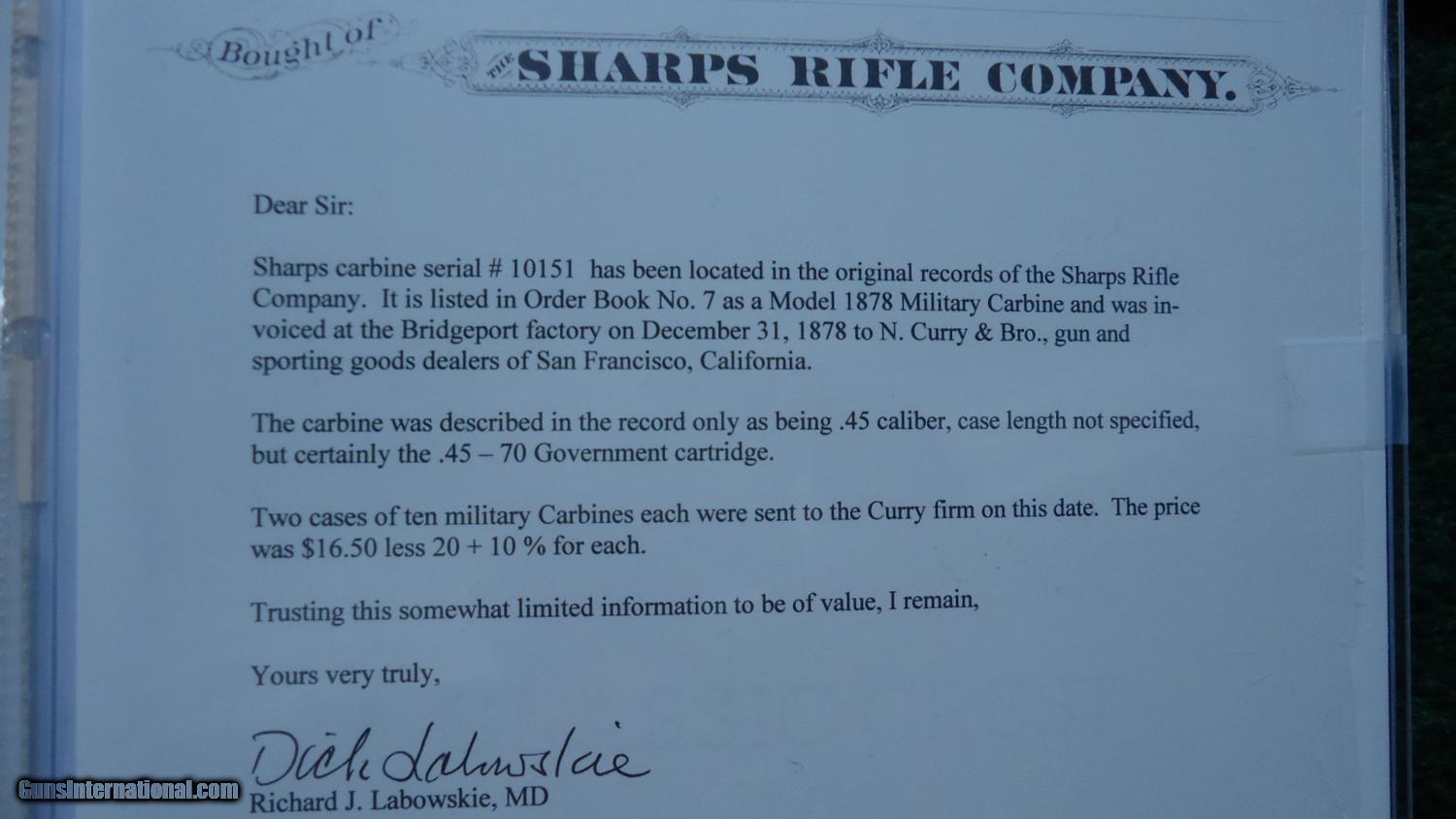 Description: This is the Borchardt design Sharps carbine which was also the last carbine that Sharps ever made. Very rare in the fact that only about 384 of these were ever made. Most likely you have never seen one of these and very likely you will ever see one again. It does have the standard Sharps marking including "Old Reliable" and "Sharps Rifle Co" on the bbl. On the side is "Borchardt Patent" and "Sharps Rifle Co". The Borchardt design was a narrower slim trim well balanced hammerless design. Cal is the always popular 45-70. Very nice cond gun with ample blue remaining. Some wear towards the muzzle. Thinning in a few spots. Very good markings. Receiver retains 60-70% finish. Faded case colors on lever and breech block. Wood couldn't be much nicer either. A few mars and scratches but for being 135+ years old a fine condition stock. An added bonus is the VG+ to excellent bore. Sharps Letter accompanies this gun which states that this gun was sent to Curry and Bro in San Francisco. Sharps Letters are very good and very informative. Excellent collectable gun! Leroy Merz Antique Firearms specializes in antique and vintage Winchesters and other fine American firearms. Since 1965 Mr. Merz has taken part in the world of firearms and has been a contributor to many well known reference books. Just recently we mailed the 125th edition of our privately-published catalog. We have hundreds of additional guns in every price range at our home online. Search for Merz Antiques in google. SOLD Antique: Yes |