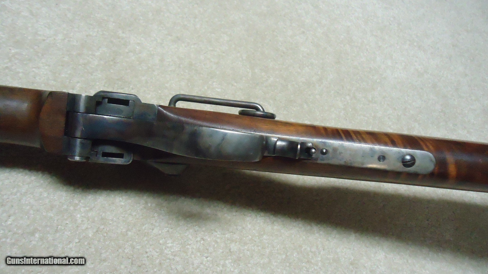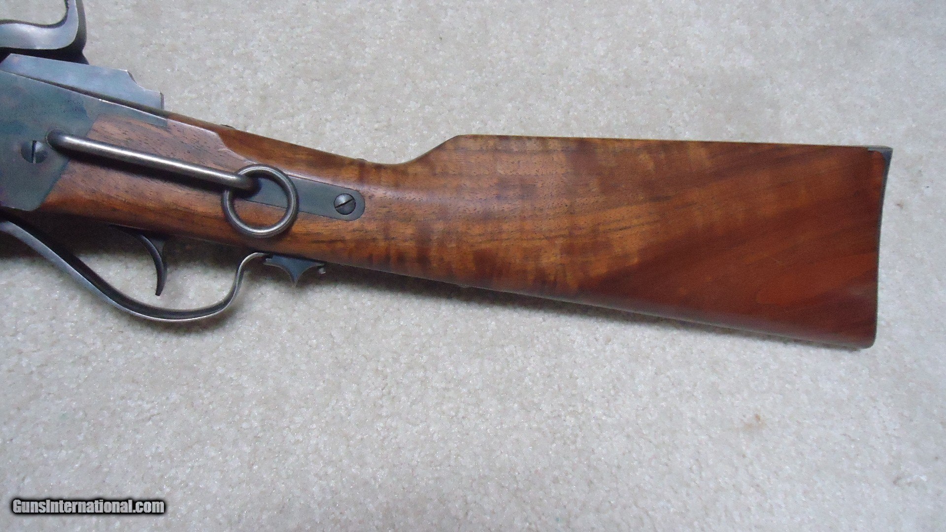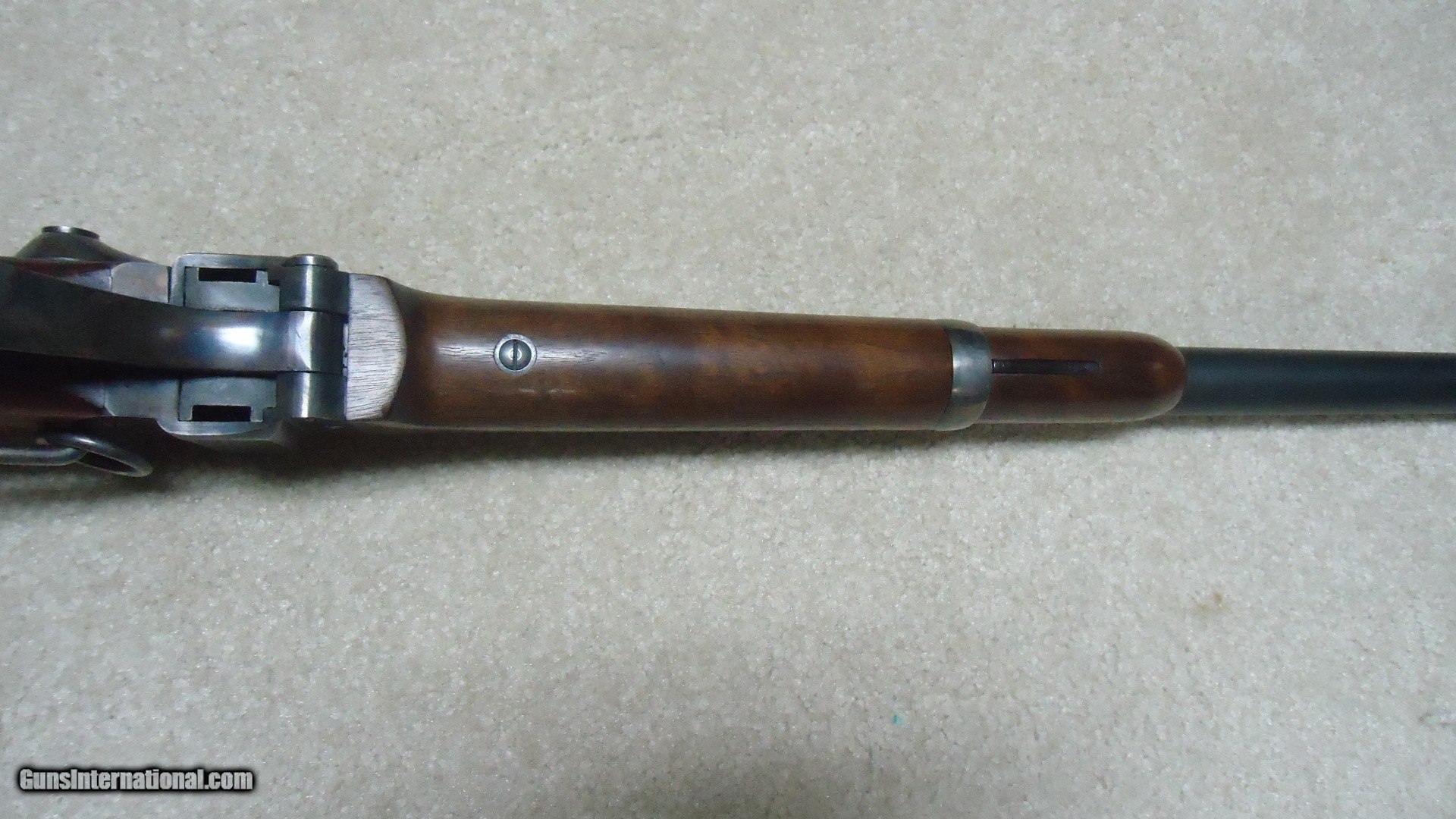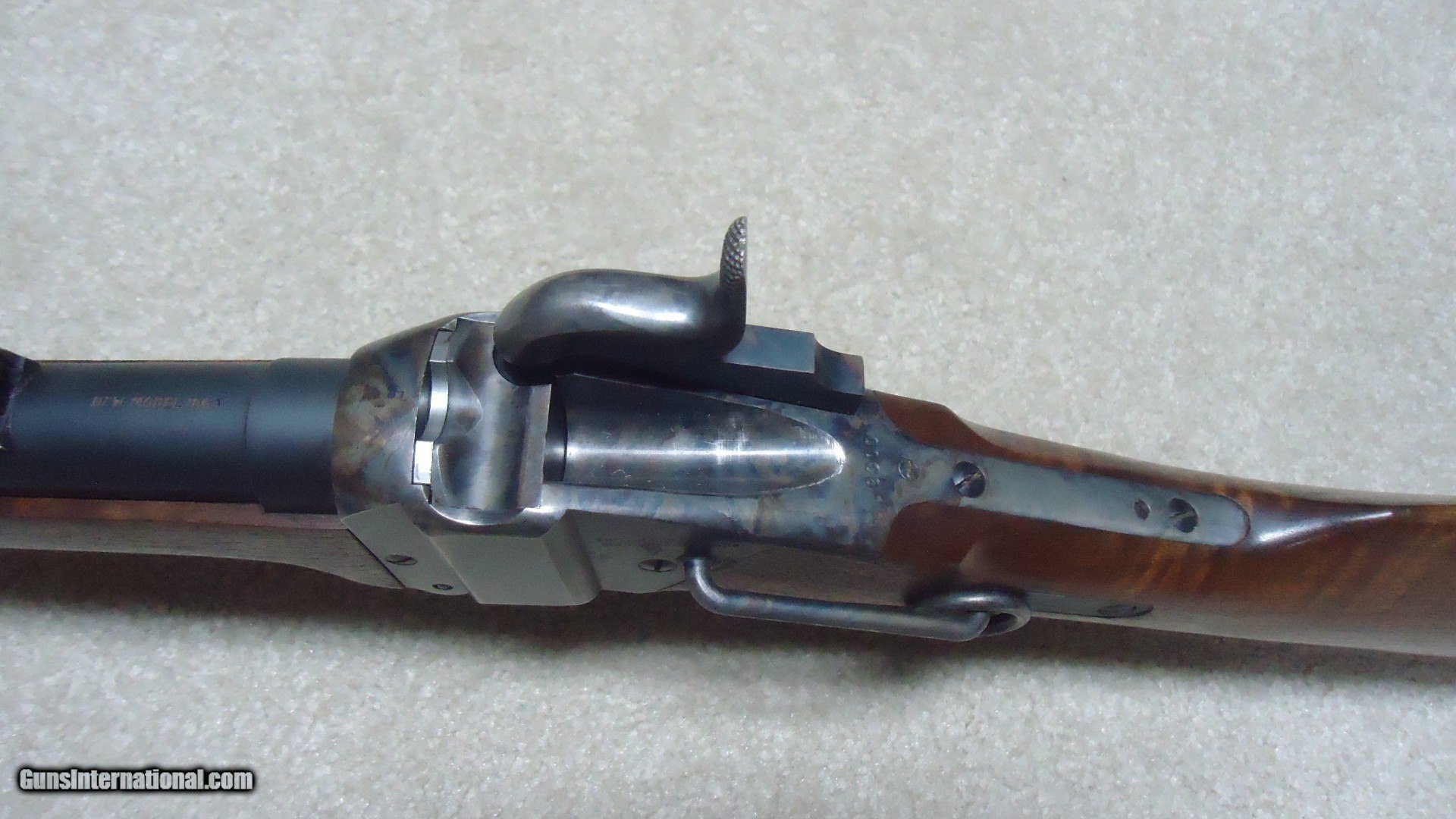 Description: SHILOH SHARPS MADE IN BIG TIMBER, MONTANA SCARCE NEW MODEL 1863 .54 CALIBER PERCUSSION SADDLE RING CARBINE, #9XXX. This upgraded carbine has a rich color deep brown semi-fancy walnut stock and forend. It was also special ordered with the saddle ring and bar. Overall, aside from a couple of very small handling marks in the bottom of the stock, this rifle seems to have seen very little use and appears near new. Nice case colored lock, hammer, receiver, butt plate, lever and barrel band. Comes with a semi-buckhorn ladder rear sight plus an extra full buckhorn ladder sight. Shiloh has not made these for some time and this one is a particularly attractive special order example. Superb quality inside and out. Catalog price for one like this would be over $2600. My price $2250. SOLD Antique: Yes Manufacturer: SHILOH RIFLE Model: 1863 CARBINE Serial Number: 9XXX Barrel Length: 22 Condition: EXCELLENT |