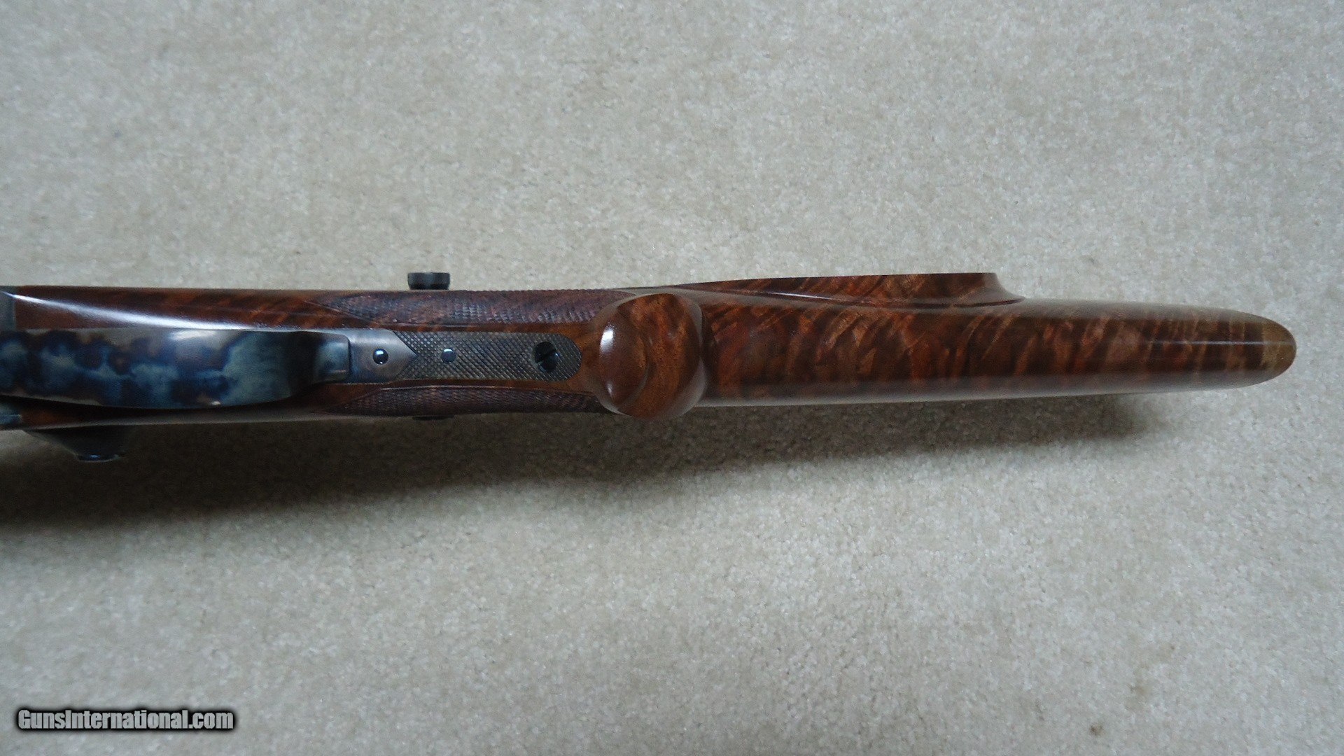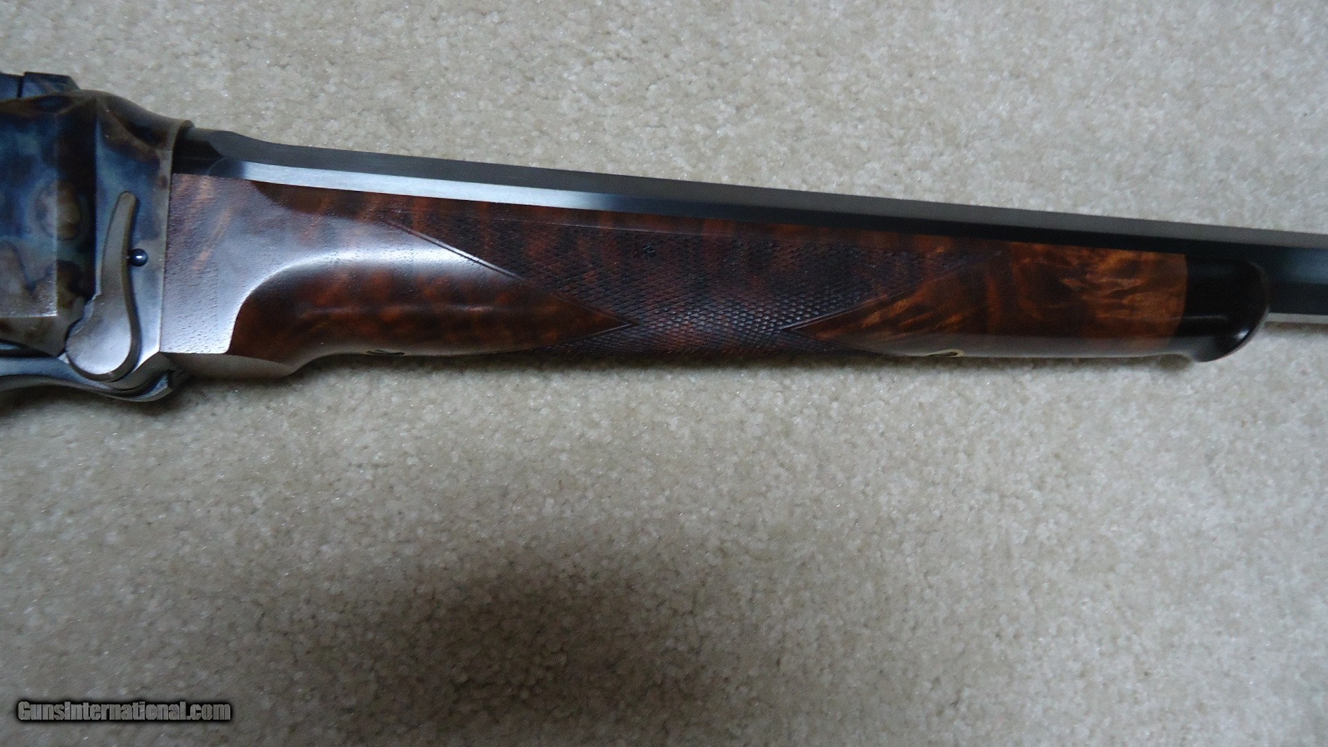 Description: UNFIRED, SUPER FANCY SHILOH SHARPS WITH ABOUT EVERY OPTION AVAILABLE, #85XX B, MADE LATE 2019. I special ordered this amazing rifle for a customer who lost interest, never got around to shooting it and finally sold it back to me! I shipped it to him in December of 2019. It is a Long Range Express, 45-70 caliber, 34" standard octagon barrel (weighs 11 1/2 lbs), no rear dovetail on the barrel, PRESENTATION WALNUT WITH AAA FINISH, traditional checkered steel butt plate, checkered stock and forend, schnable on pistol grip, polished barrel, polished fire blued screws, brass escutcheons, bone and charcoal pack harden case colors, accent line on the cheek piece, custom bed forearm, ebony schnable forend tip, drilled and tapped with filler screws for MVA scope with standard 17" spacing, factory mounted Montana Vintage Arms (MVA) Extra Long Range Soule tang sight paired with MVA #113 globe and spirit level front sight with inserts. One of the most beautiful Shilohs I've ordered/shipped in over 25 years of being a Shiloh dealer! This one is unfired in the original shipping case/box with all paperwork and warranty card (life time warranty for whoever fills it out and returns it to Shiloh). Even through me, this one took almost 2 years to complete. If I ordered this rifle today, after a very long wait, my price would be approx. $6,600 plus shipping. This rifle is brand new with full lifetime warranty, and ready to ship with no wait time or price increases along the way. A spectacular Shiloh! I will sell it for $6200. SOLD Rifle Caliber: .45-70 Government Manufacturer: Shiloh Rifle Model: 1874 Long Range Exp. Serial Number: 8XXX B Barrel Length: 34 Condition: NEW IN BOX |