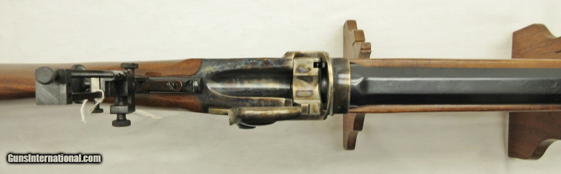 Description: This 45-70 Pedersoli 1874 “Silhouette” Sharps has a blued tapered octagon 31” x 1-3/16 to 7/8” barrel with a 1:18 twist. It is fitted with a spirit level globe front sight with extra inserts and flip-up ladder rear sight plus a midrange tang sight with windage & elevation. The bore is very good with clean sharp rifling. The P grade European Walnut buttstock with a pistol grip and forend are mounted to the color case hardened action with double set triggers. The action locks up tight & functions as it should. Length of pull is 14-1/4”, Overall Length is 49”, Weight is 10.4 lbs. Factory wood to metal fit – Made by Pedersoli. Condition: Good to Very Good. Our stock number is C577. Will ship to any FFL in the United States, buyer pays freight and insurance. Rifle Caliber: .45-70 Government Manufacturer: Pedersoli Model: 1874 - Silhouette Barrel Length: 31 Bore Info: Rifled Condition: Good to Very Good Metal Condition: Very Good Wood Condition: Very Good Bore Condition: Very Good Barrels: 1 Barrel Type: Taperd Octagon Action: Single Shot Triggers: Double Set Stock: European Walnut LOP: 14-1/4 Finish: Blued Weight: 10.4 lbs Sights: Tang Peep, Adj Rear, Spirit Level Front Item Location: Oregon Price: $2,300.00 Buy Now Contact Seller |