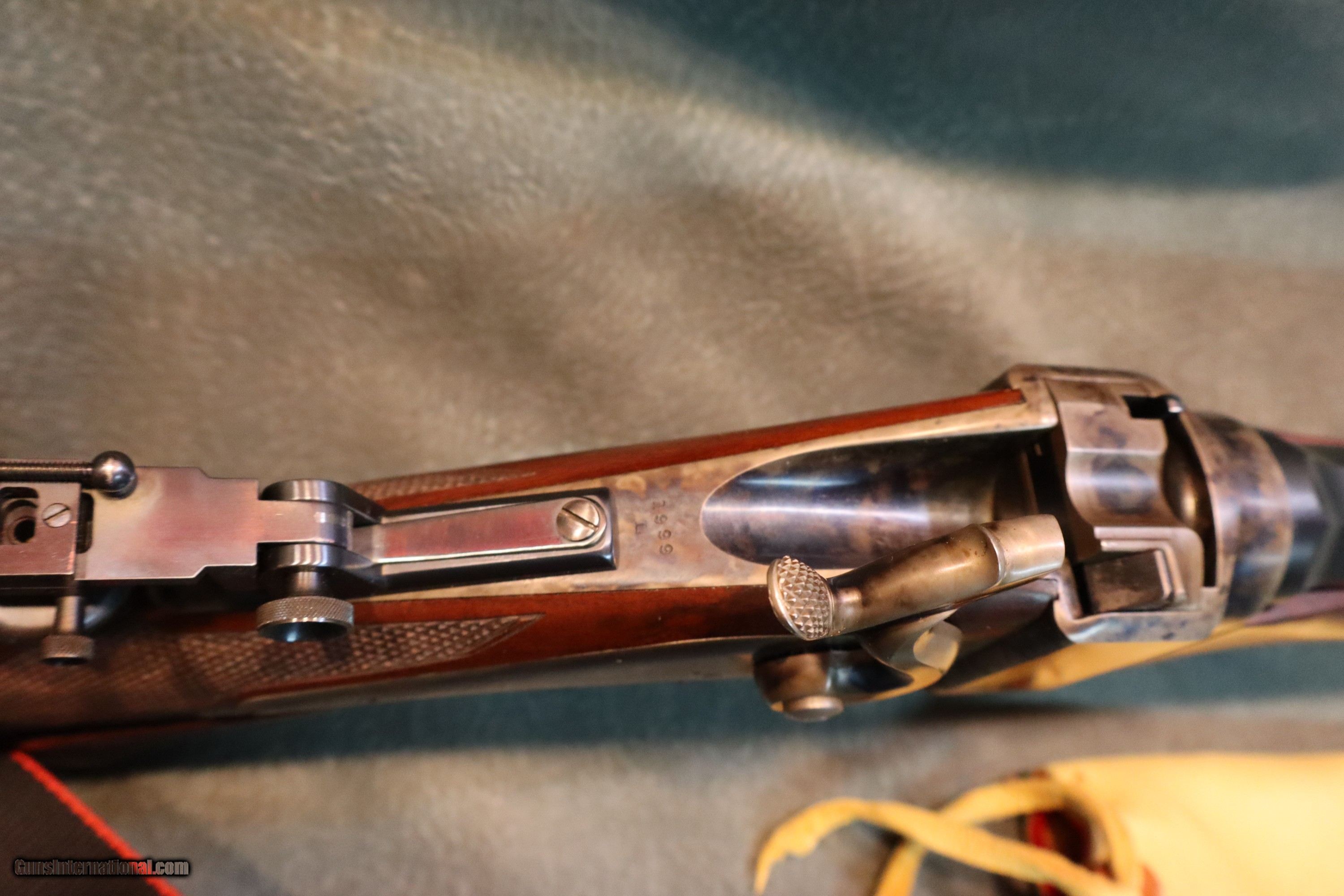 Description: Axtell Sharps 1877 Presentation Rifle 45-70,30" octagon barrel,double set triggers,casecolored receiver,checkered stock with pistol grip,made as an "Exhibition Award for the 1999 Colorado Gun Collectors Association" Denver Gun Show with an engraved plaque in the stock,special serial #1999L,one of a kind. GUN COLLECTIONS WANTED FOR CASH! We buy, sell, consign and trade new and used firearms.We travel for large collections,finders fee available. This is our 49th year in business. We offer 90 day layaways with 20% down. No return on layaways. Firearms will need to be transferred through a FFL dealer. Prices reflect a cash discount. There will be 3% added to credit card sales. We trade for gold and silver. THANK YOU! SOLD |