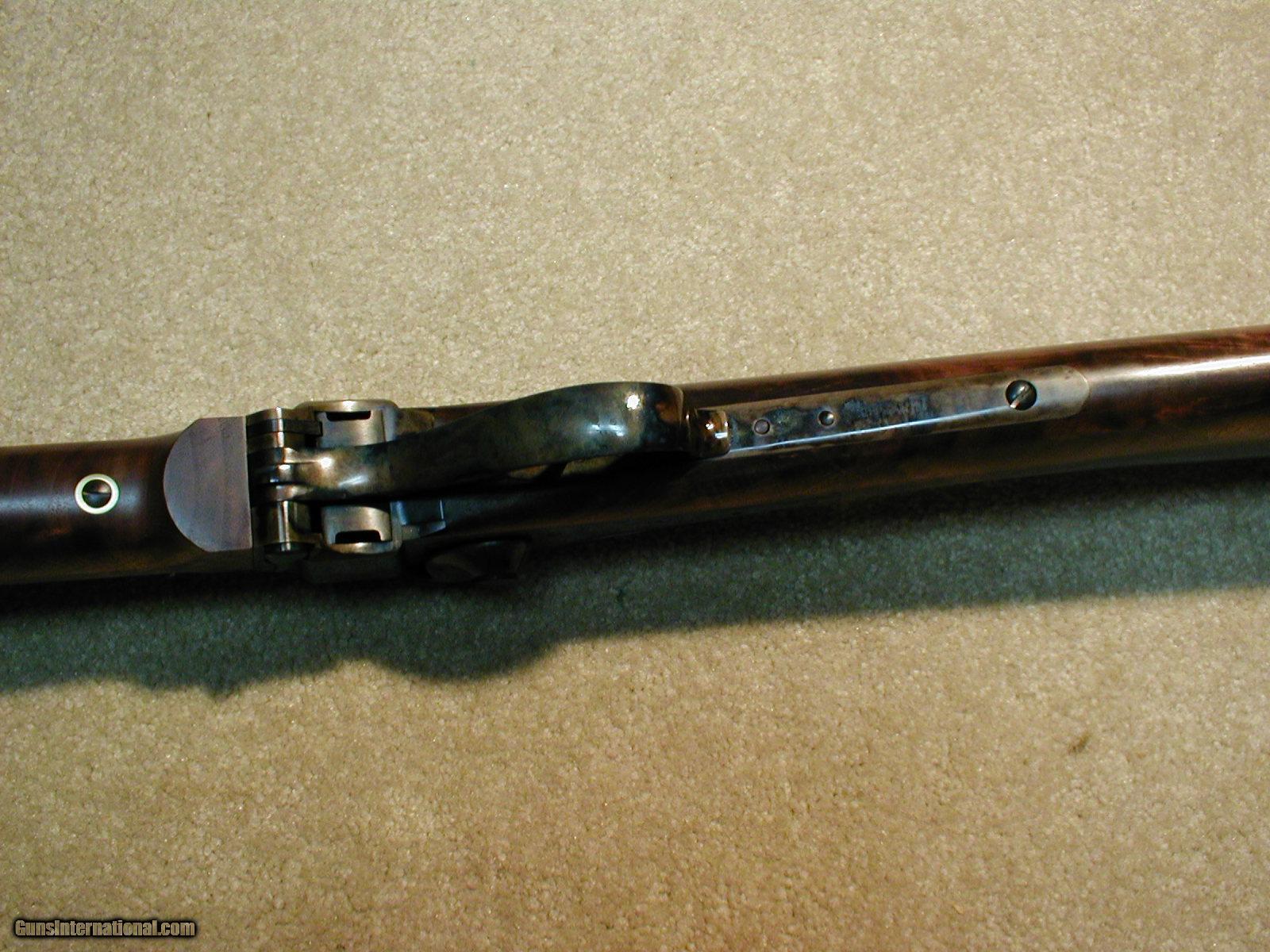 Description: Very unusual Hartford sporter (Hartford Collar and pewter tip standard on this model), .45-70, 34" heavy oct. barrel, full buckhorn rear sight, this one has extra fancy hand select walnut that is dark in color and very burl and dense- highly figured forend with butt stock that changes color/grain depending on the light! Traditional checkered steel shotgun butt plate, brass escutcheons, bone & charcoal pack harden case colors, I've shipped about two thousand of these and very few have had wood to compare with this one, truly a stunning Shiloh! Just picked this one up, brand new in box with all papers etc. $3754.19 (Includes shipping/insurance etc.) NOTE: I have been about the only constant stocking dealer of Shiloh rfles since 1993. SOLD Manufacturer: Shiloh Rifle Mfg. Co. Model: 1874 HARTFORD SPORTER Serial Number: 78XX B Caliber Info: .45-70 Condition: New In Box Barrels: 34" heavy |