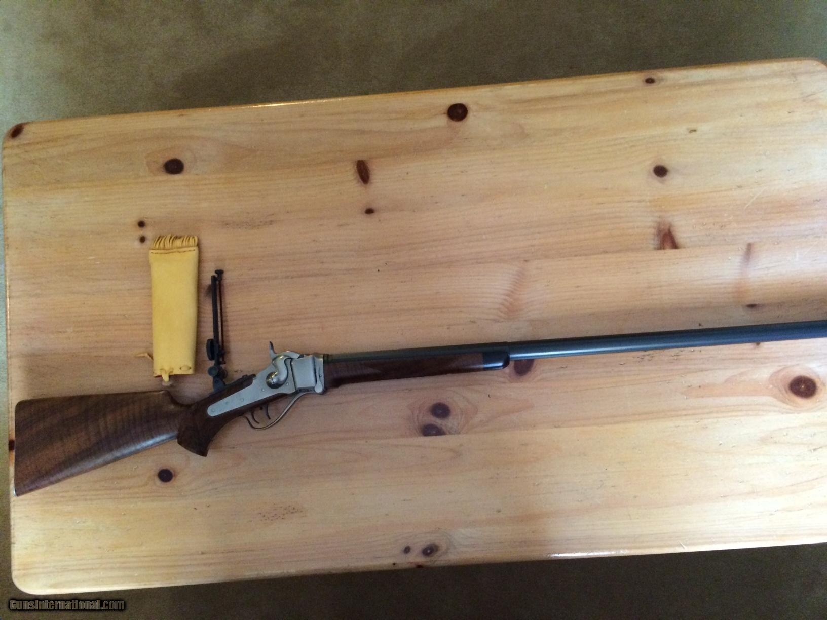 Description: This is a C.Sharps Arms Custom Shop Model 1874 Long Range Target Rifle. caliber 45/70 (aka 45 2-1/10"). French Gray Receiver and Smooth Steel Shotgun buttplate. 32" barrel with Hartford Collar. Extra fancy Fiddleback walnut, ebony forearm tip and "Carved" pistol grip Extra Long Range Soule Tang Sight with leather sight sack and Spirit Level globe front. Rifle is unfired but no box or papers. Absolutely MINT condition throughout. Retail is $3900.00 Shipping: $50.00 SOLD |
