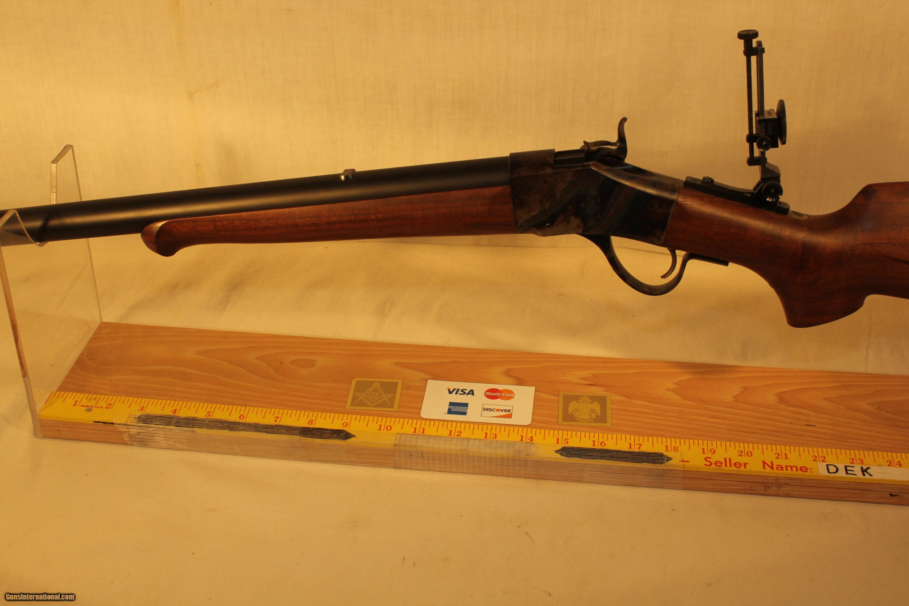 Description: New in the box Sharps Model 1875 custom made by C. Sharps using a unused new Sharps Rifle Company, Bridgeport, Conn. "Old Reliable" barrel. Outstanding case colors on all parts. Upgraded nicely figured wood with a shadow cheek piece, pistol grip stock and schnable fore arm. 32" barrel with globe front sight. Mid range tang sight with windage and elevation adjustment. Weight is 10 pounds. A really beatiful mix of the old and the new. New in the box. Never fired. FFL required $50.00 Shipping and insurance via Priority Mail I take plastic for 5% SOLD |
