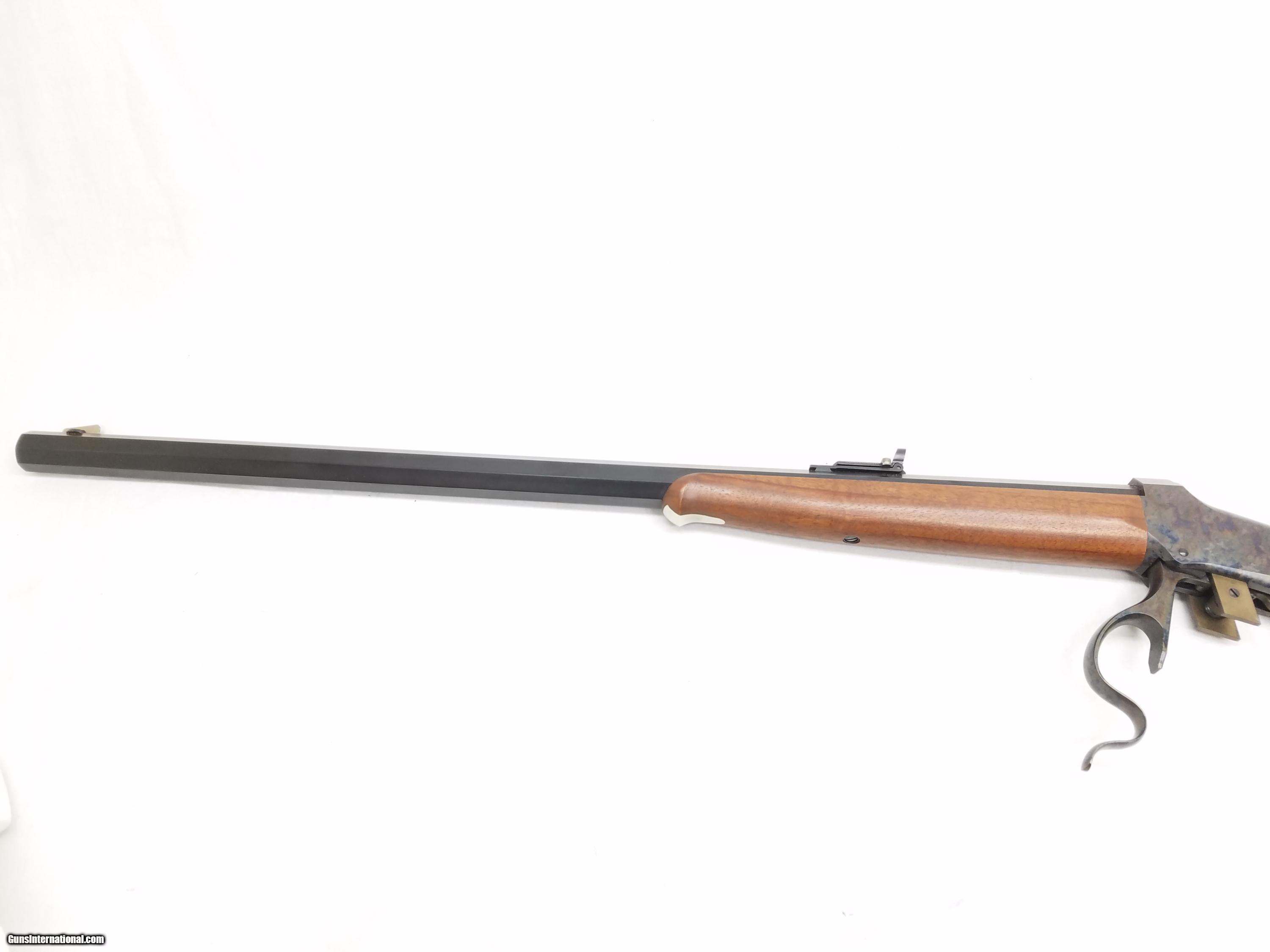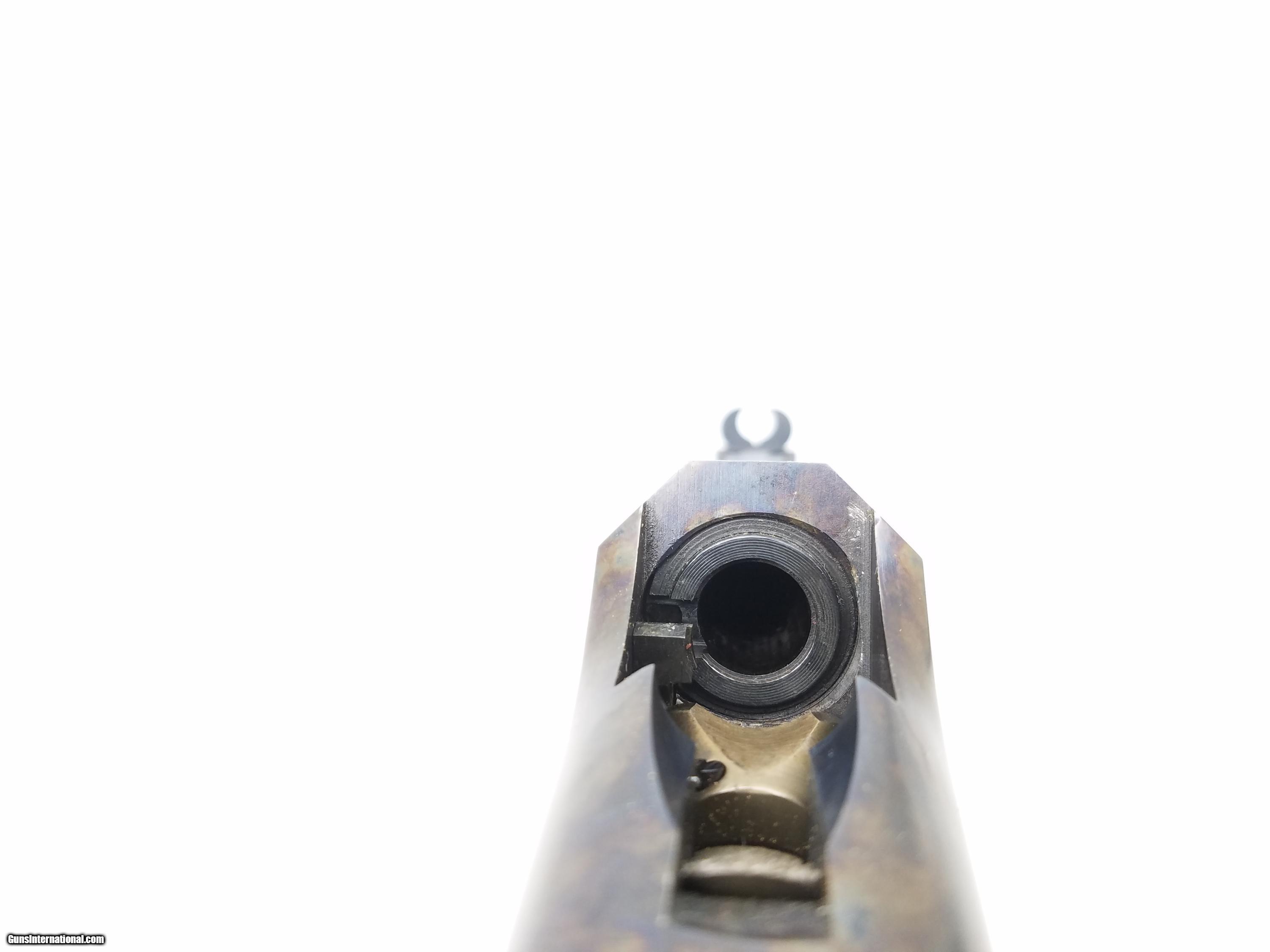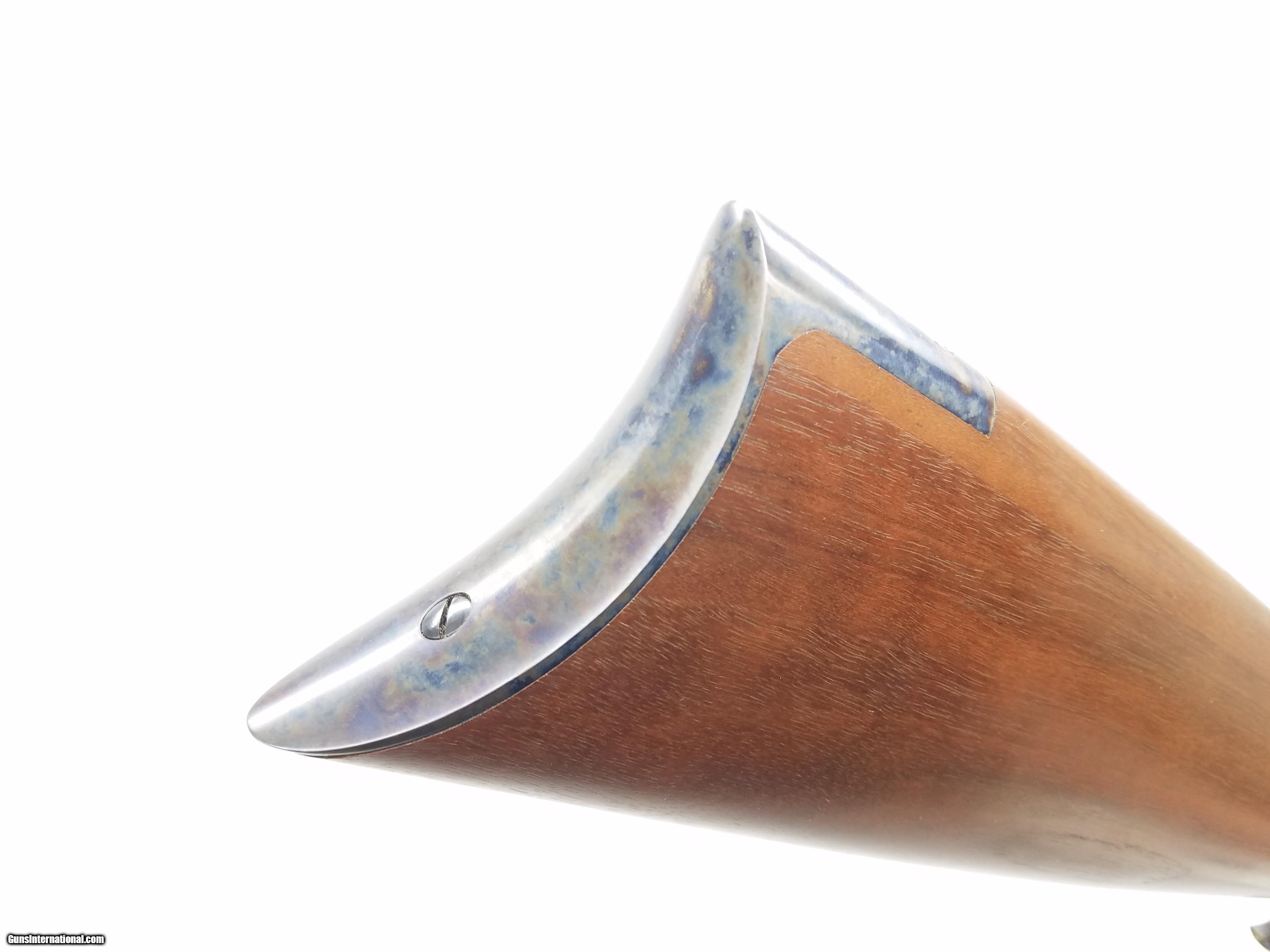 Description: This is a C. Sharps low wall falling block rifle chambered for 45 Colt. It has a 25-¼” blued octagonal barrel that tapers from 1-1/16” at the receiver to ?” at the muzzle. The finish is in good condition, as is the bore. Mounted in the front dovetail is a fixed blade sight and mounted in the rear dovetail is a folding buckhorn sight. The rear sight can be folded to be used as a ladder sight with adjustment for elevation. “Old Reliable” is stamped into the barrel between the sights and “C. Sharps Arms Co Inc / Big Timber Montana, USA” is stamped behind the rear sight. The color cased receiver, lever, and adjustable trigger are all in excellent condition with no corrosion or scratches. The walnut buttstock and forend are in similar condition. There are no noticeable dents or scratches on the forend and a German silver inlay on the schnabel. The buttstock has no blemishes, a raised cheekrest, and a color cased crescent buttplate. Length of pull is 14”, overall length is 43”, and weight is 8.6 lbs. Our stock number is #A285. Willing to ship anywhere in the US to your FFL, buyer pays freight and insurance. SOLD Manufacturer: C. Sharps Arms Co. Model: Old Reliable Caliber Info: 45 Colt Metal Condition: very good Wood Condition: very good Bore Condition: very good Barrel Type: tapered octagonal Action: falling block Stock: walnut LOP: 14 Finish: blued Sights: open |