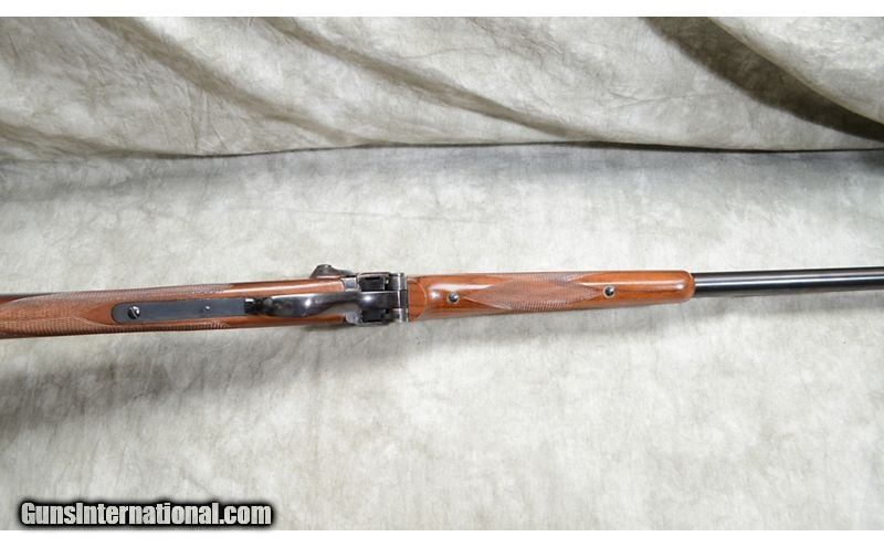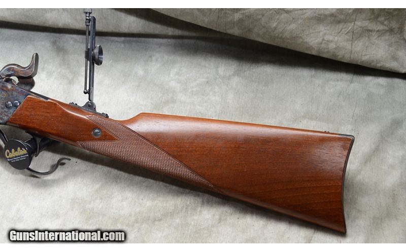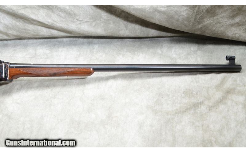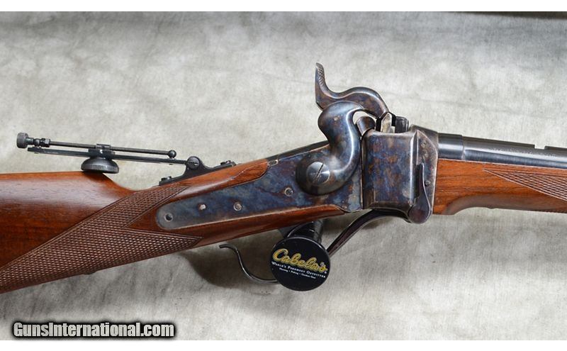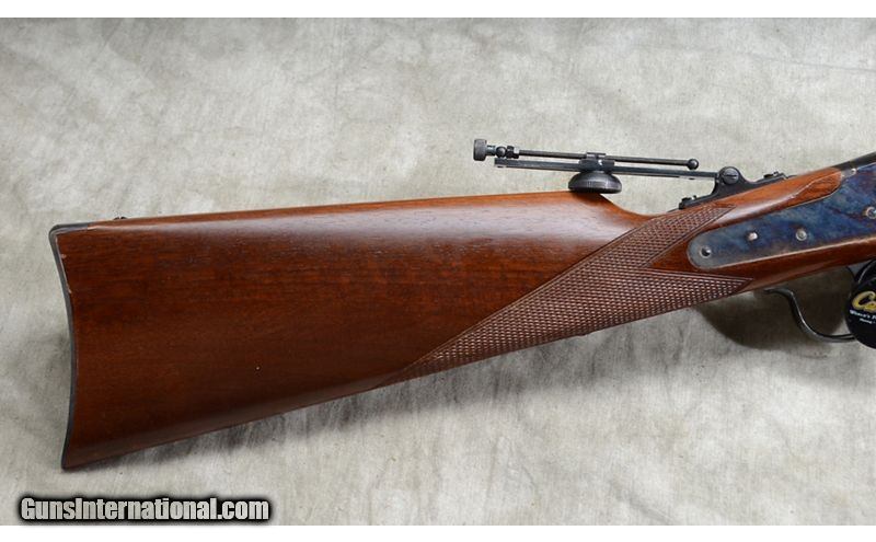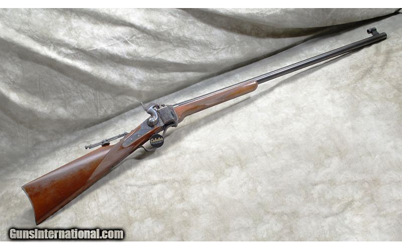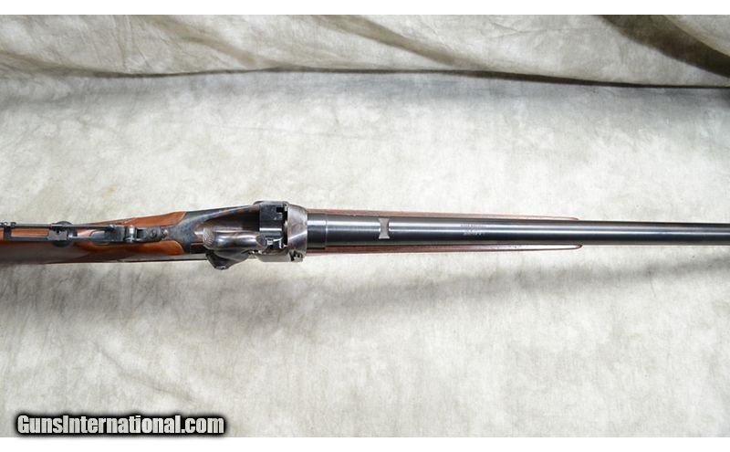 Description: Nice reproduction of the Sharps falling block with a tang-mounted vernier peep. Note: the factory sight was removed to allow use of the vernier. .45-70 Government SOLD Chambers: ONE Metal Condition: Very good. Wood Condition: Very good. There are a couple of light handling marks. Bore Condition: Shiny and bright. Barrels: 28-1/2 INCH Triggers: Factory trigger. Stock Dimensions: 14-inch LOP. Fore End: Splinter of walnut. Butt Pad: Slightly curved steel plate. Weight: 9 lb Sights: """Y"" post and vernier tang mount peep. Item Location: Rogers |