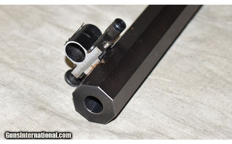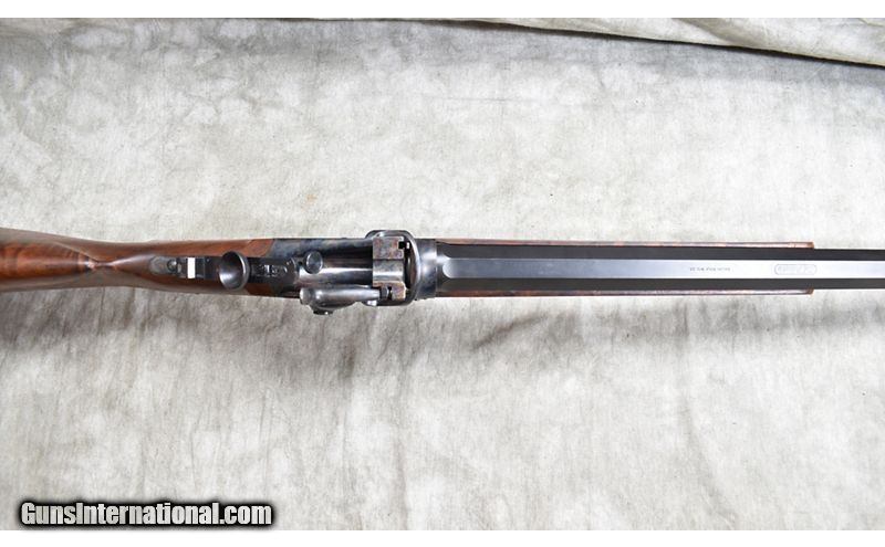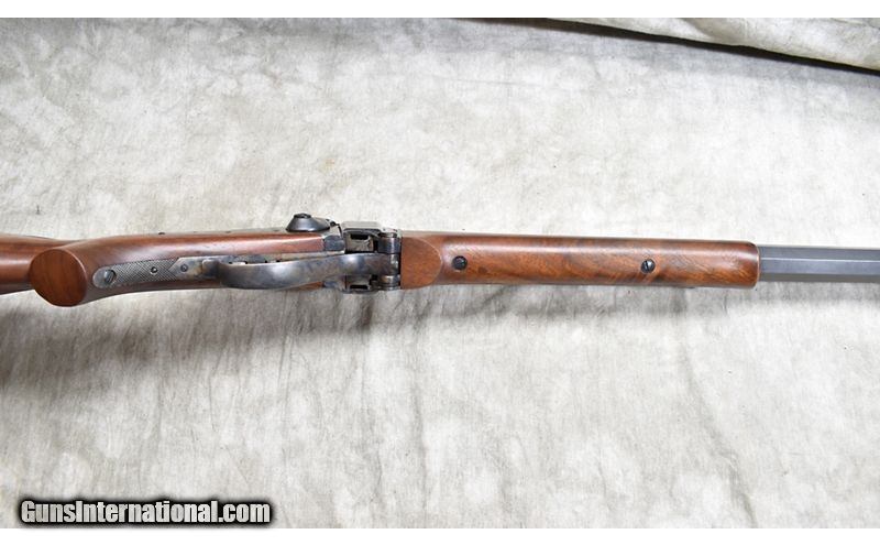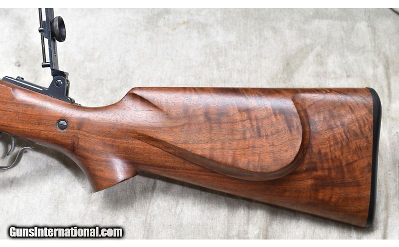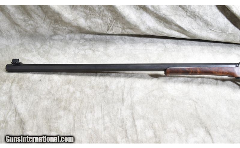 Description: This reproduction of the 1874 Sharps is faithful to the original "Old Reliable," buffalo and target rifle. It has nice case color, figured walnut with cheek piece, long range precision sights, and double set triggers. It is furnished with 96 cartridge cases and loading dies. .45-120 Sharps SOLD Chambers: Single Shot Metal Condition: Excellent. Wood Condition: Excellent. Bore Condition: Shiny and bright with good rifling. Barrels: 34-inch hexagonal. Triggers: Factory double set trigger. Stock Dimensions: 14-inch LOP. Fore End: Splinter of walnut with Schnabel. Butt Pad: Black plate. Weight: 11 lb - 13 oz. Sights: "Globe type front sight with cross-hairs, tang mounted vernier peep. Item Location: Rogers |