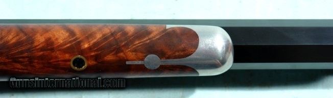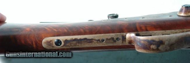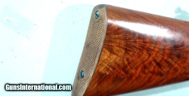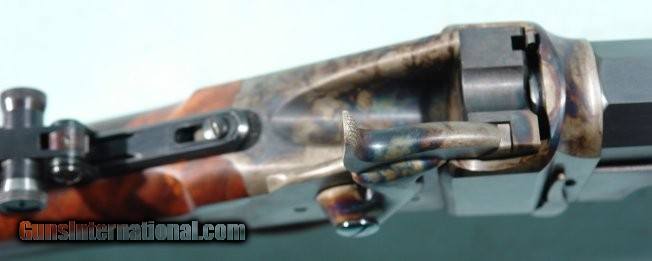 Description: SHILOH RIFLE MFG. CO. SHARPS .50-2 ½” (.50-90) SHARPS CAL. MODEL 1874 HEAVY WEIGHT BARREL RIFLE. 30” extra heavy octagon barrel measuring 1 ¼” across the flats at the muzzle and weighs 15 pounds. Vernier tang sight and globe insert front. Double set triggers. Extra fancy walnut stock and forend and pewter forend cap. Case colored receiver, lever and checkered butt plate. Superb new condition. Appears unfired. Has nicest case colors and wood we have seen on one of these. SOLD Rifle Caliber: .50-90 Sharps |