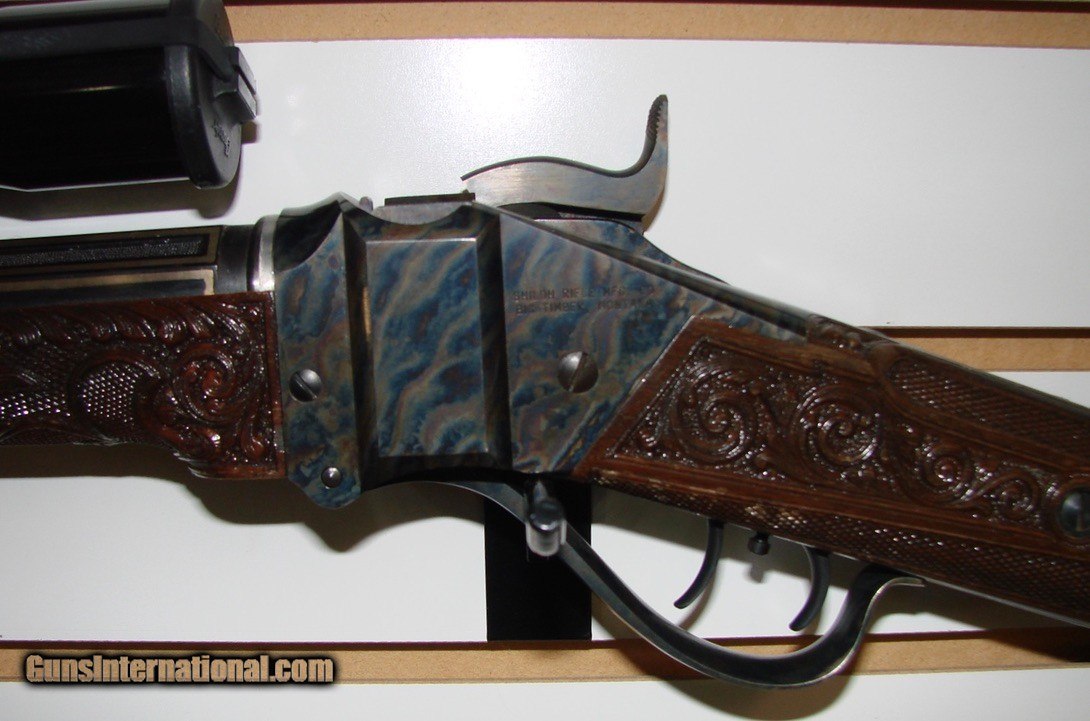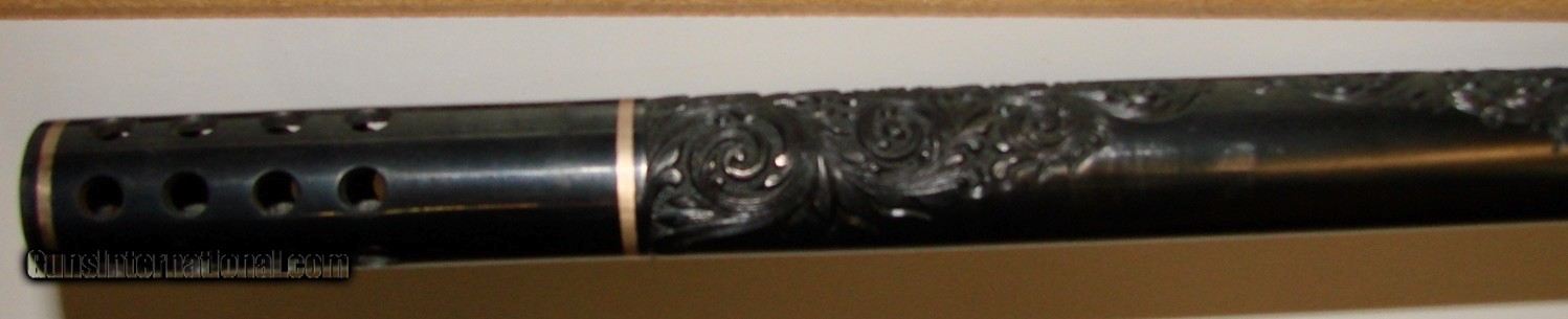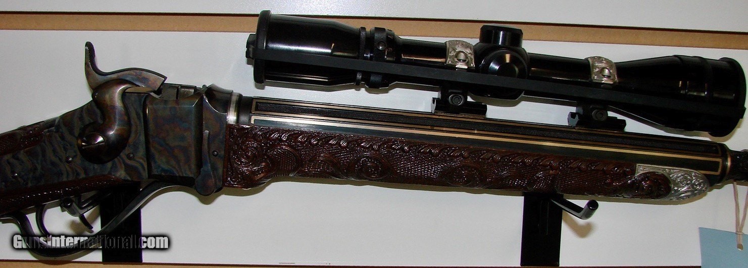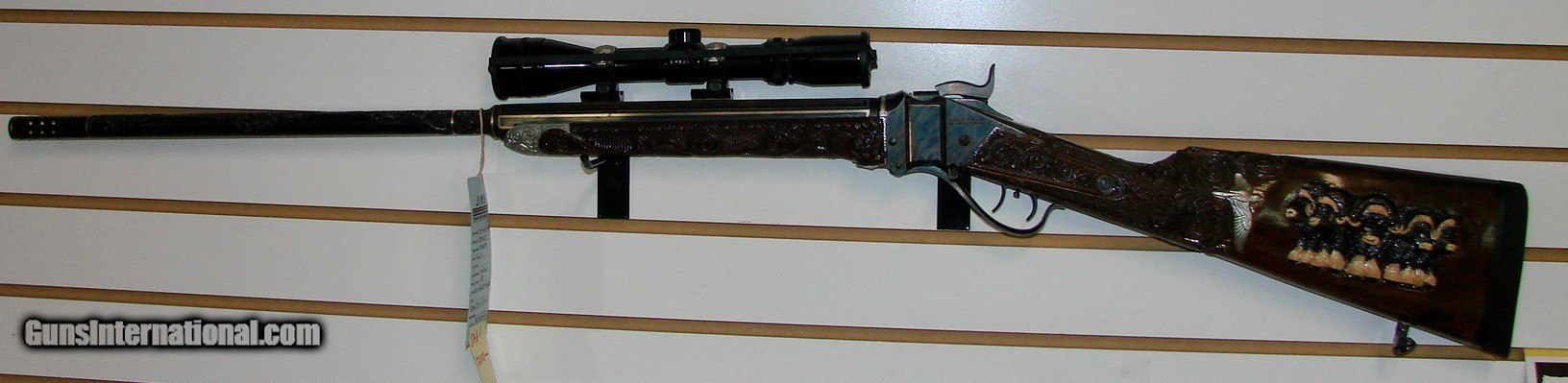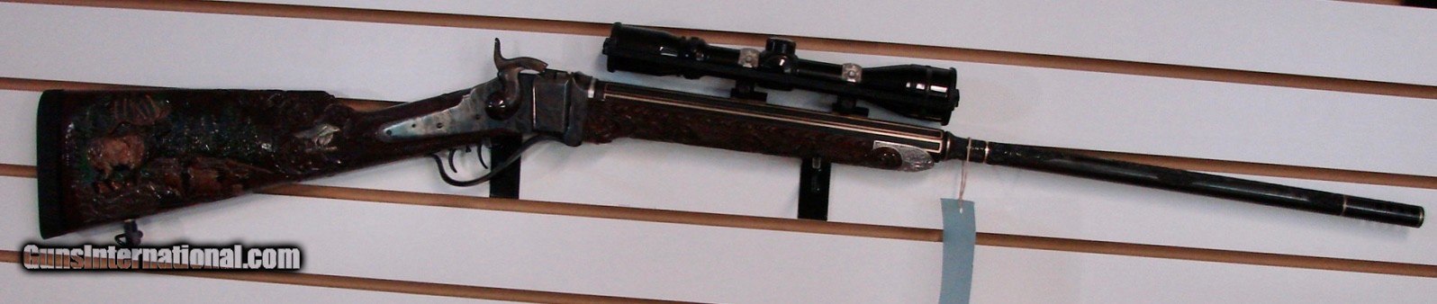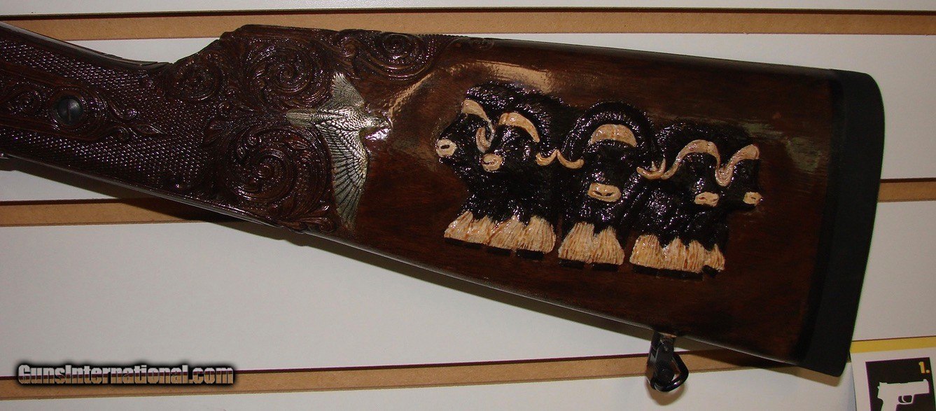 Description: This amazing rifle is a Shiloh Sharpes in 45/120 caliber. It has a custom contoured 1/2 round 1/2 octagon barrel which is engraved and gold wire inlayed. It is fitted with a Burris EER-3-9X scope and an intergral compensator. It has a double trigger. The stock is custom hand checkered and carved with an Elk scene on one side and an Artic Musk Oxen on the other. The engraver took over 1000 hours to complete this work and it was all done by hand. Don't miss out on this collectable piece. SOLD |