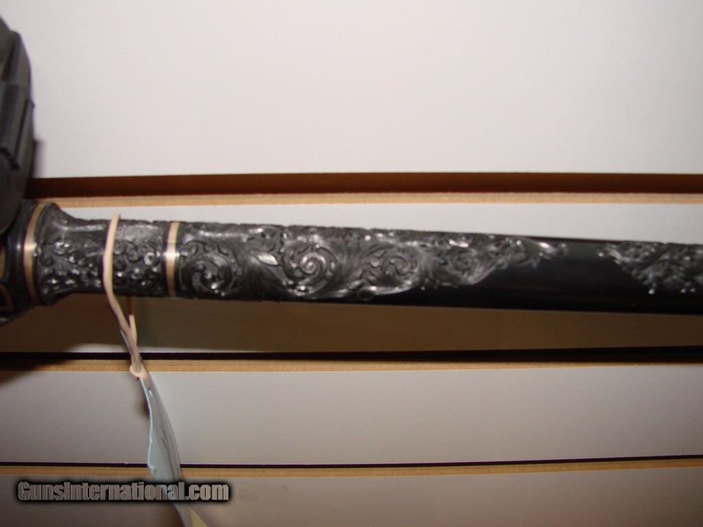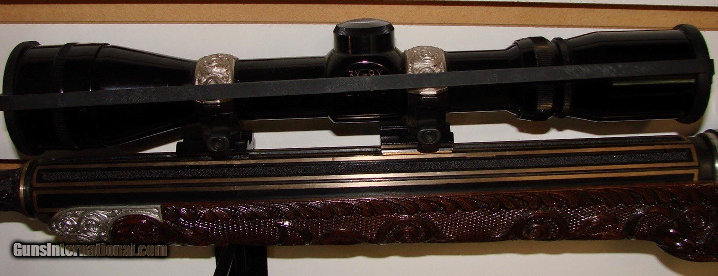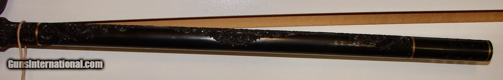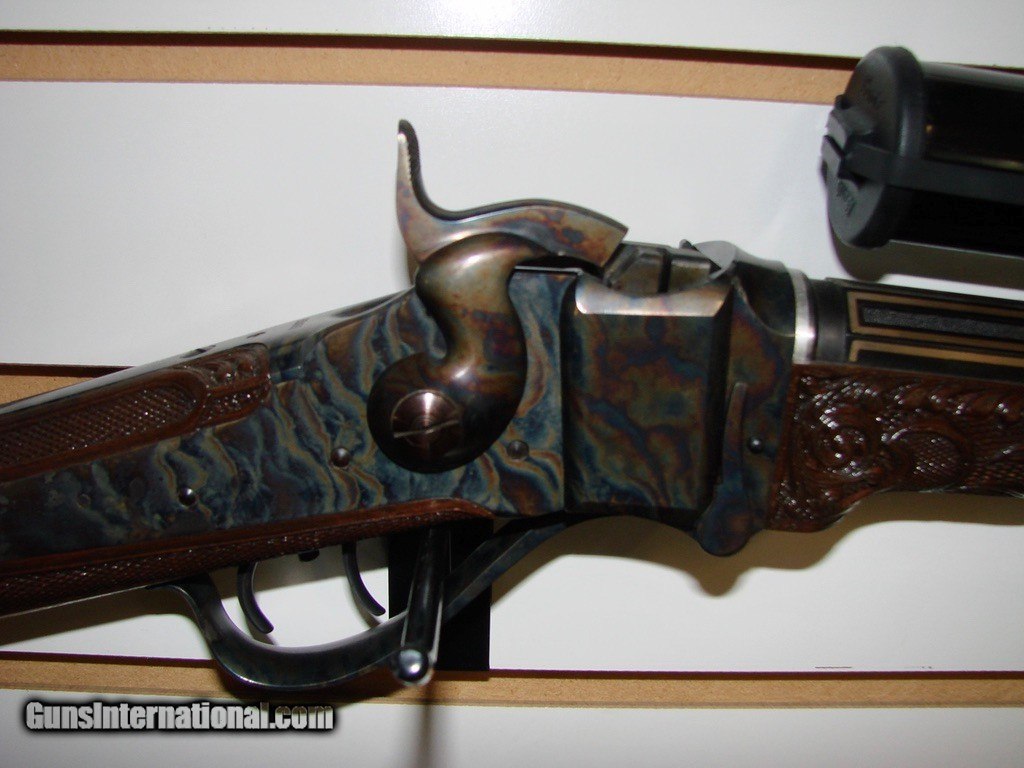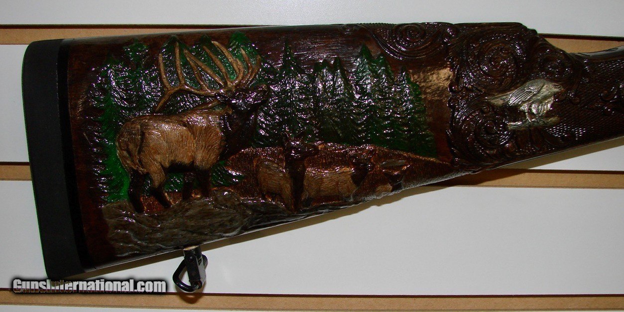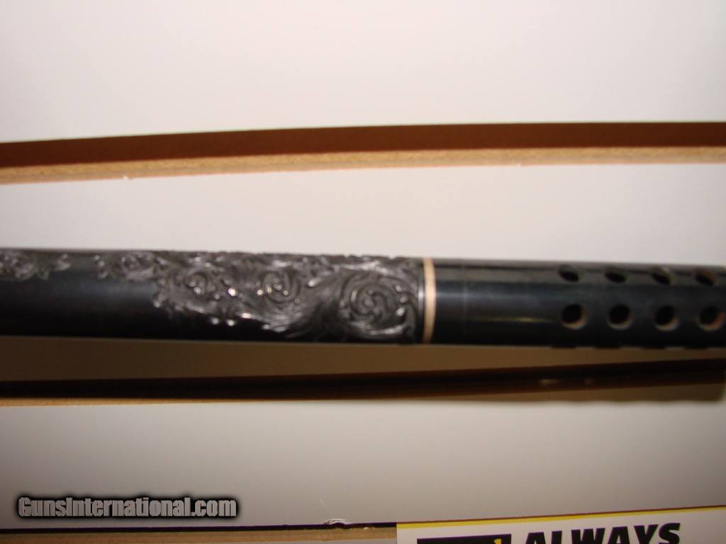 Description: This amazing rifle is a Shiloh Sharpes in 45/120 caliber. It has a custom contoured 1/2 round 1/2 octagon barrel which is engraved and gold wire inlayed. It is fitted with a Burris EER-3-9X scope and an intergral compensator. It has a double trigger. The stock is custom hand checkered and carved with an Elk scene on one side and an Artic Musk Oxen on the other. The engraver took over 1000 hours to complete this work and it was all done by hand. Don't miss out on this collectable piece. SOLD |