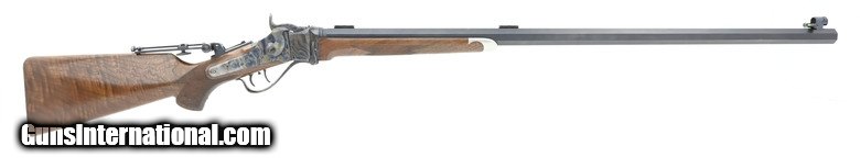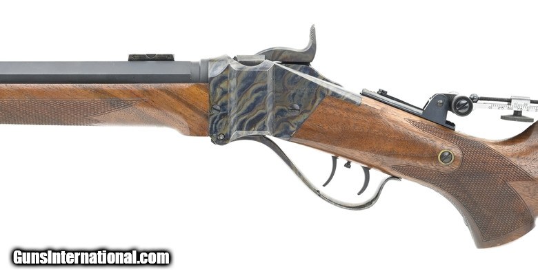 Shiloh Sharps 1874 .45-70 caliber rifle. Long range Sharps rifle with 34” heavy octagon barrel, double set triggers, semi-fancy checkered walnut stock, checkered steel butt plate, Vernier tang sight and Spirit level front sight. A great looking rifle, in excellent condition.