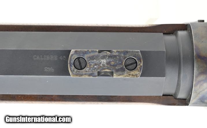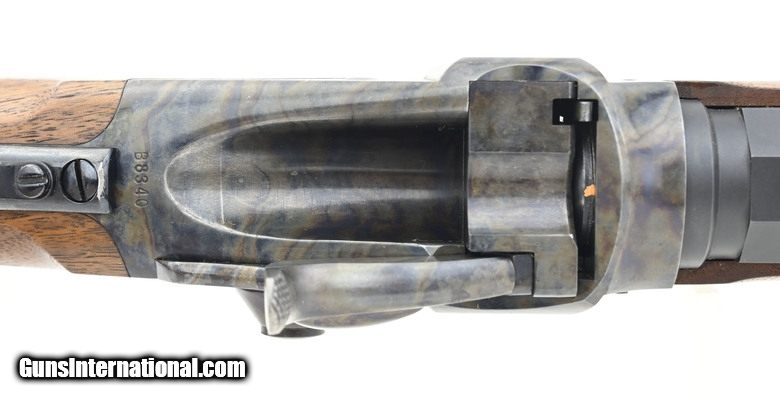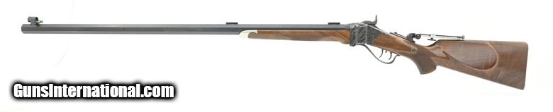 Description: Shiloh Sharps 1874 .45-70 caliber rifle. Long range Sharps rifle with 34” heavy octagon barrel, double set triggers, semi-fancy checkered walnut stock, checkered steel butt plate, Vernier tang sight and Spirit level front sight. A great looking rifle, in excellent condition.