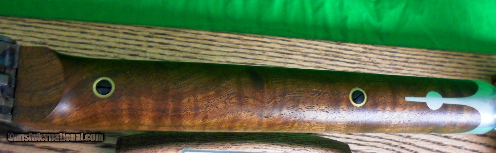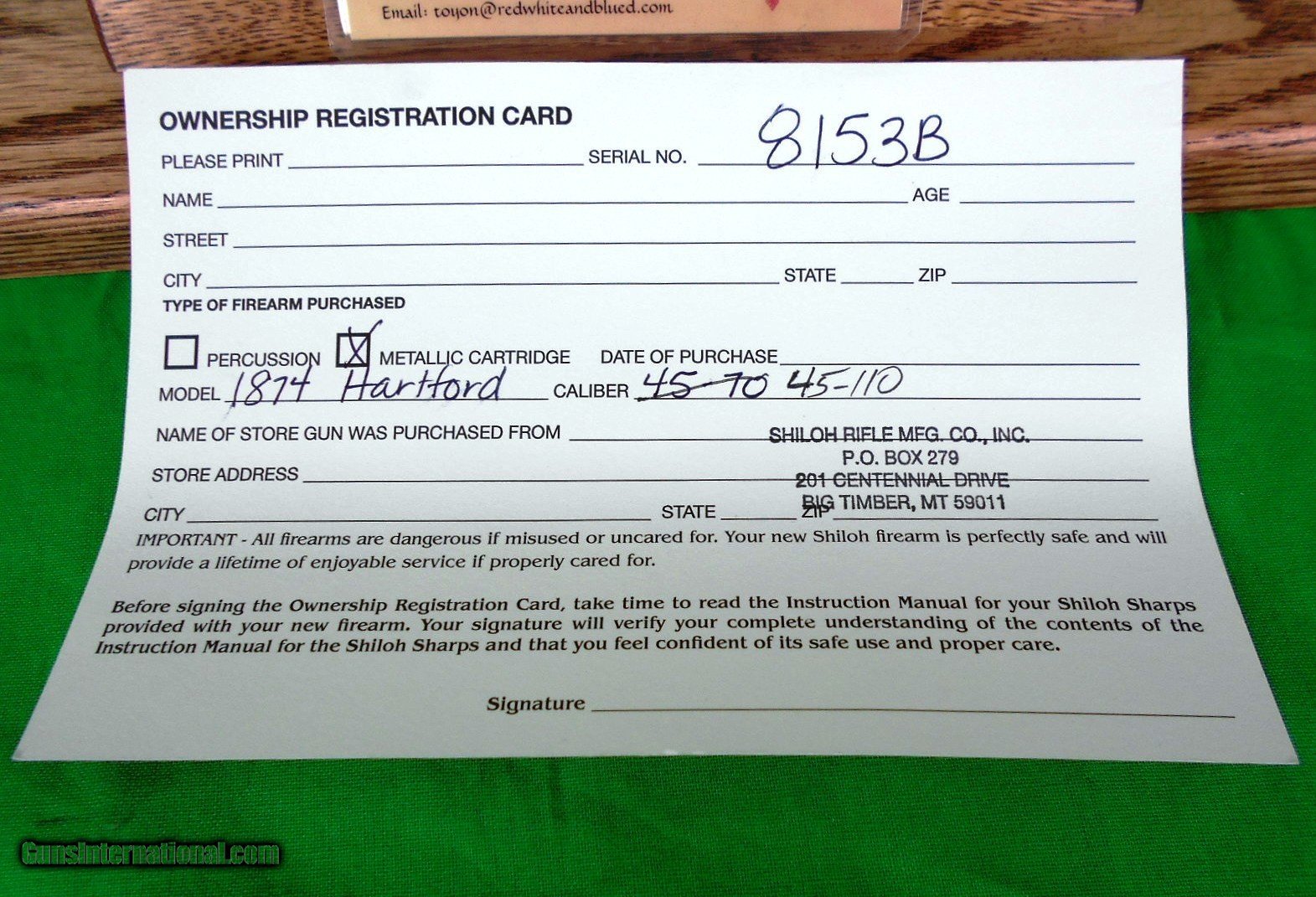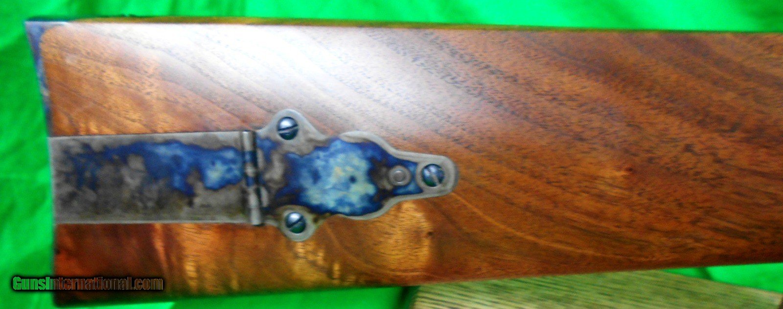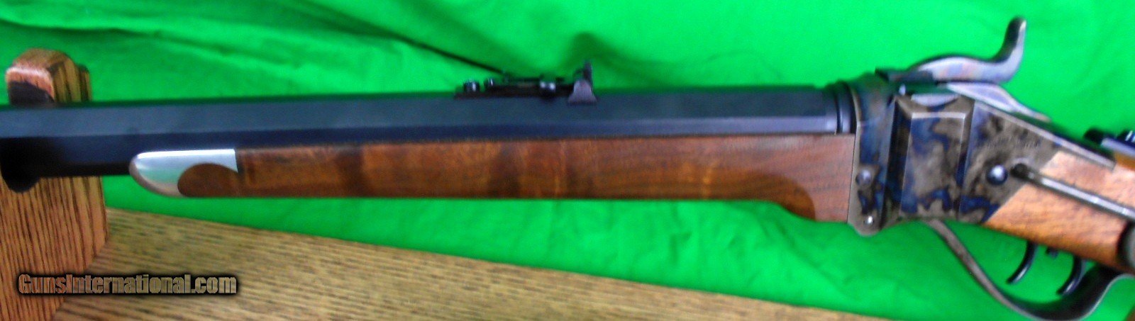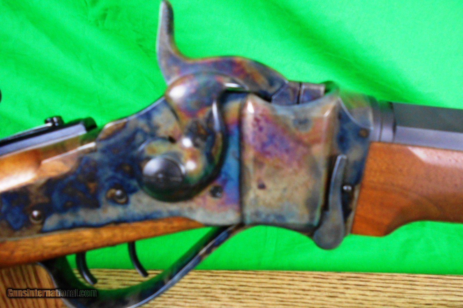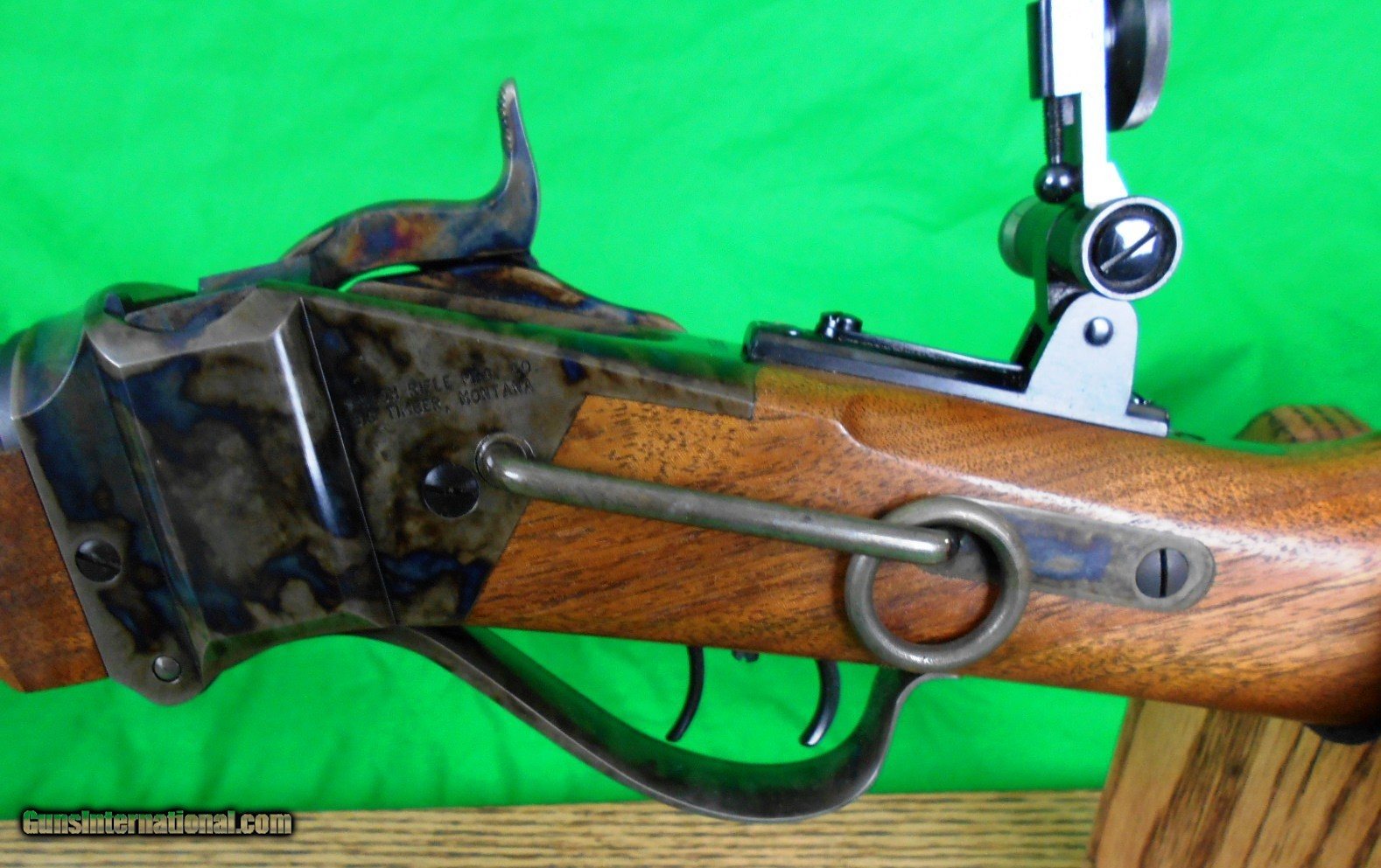 Description: Shiloh Sharps 1874 Hartford Model in 45-110 or 45 2-7/8. Straight buttstock with traditional steel buttplate, bone & charcoal case colouring, heavy 30" barrel with semi-buckhorn rear sight, Hartford Collar, brass escutcheons, Pewter Forend Tip, patchbox and saddlering. Shiloh #111 front globe sight and MVA #100 Long Range Rear sight. Rifle shows small amount of use but is in like new condtion except for the standard scratches at the breech. Rifle was rechambered from 45-70 to 45-110 before it left the factory. Registration card and barrel markings reflect this. Rifle comes with all factory paperwork. Please feel free to ask questions or for additional pictures. Firearm is for sale locally. Shipping and insurance will be determined for buyer - please remember this is a heavy rifle - price reflects a cash discount - add 3% for Mastercard/Visa/Discover - payment arrangements must be made within 3 days of end of sale SOLD Manufacturer: Shiloh Sharps Caliber Info: 45-110 |