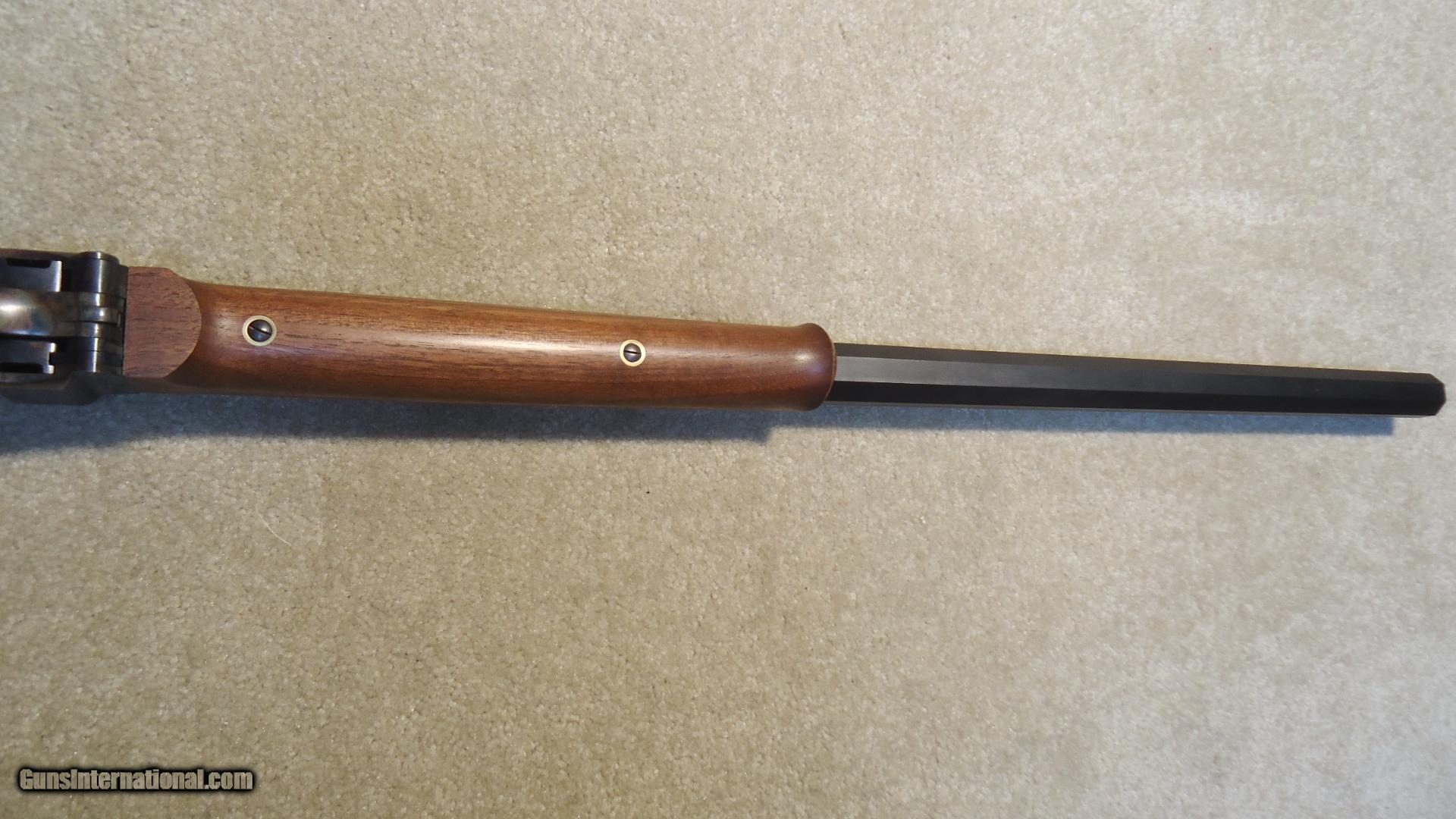 Description: SHILOH SHARPS 1874 SADDLE RIFLE, MADE IN BIG TIMBER, MONTANA, CALIBER .45-100 (2.6" CASE), 28" HEAVY OCT. BARREL, about new condition with either hand selected standard walnut or semi-fancy walnut in the butt stock- straight grain with some nice fiddle back throughout, accent line on the cheek piece, checkered steel shotgun butt plate, brass escutcheons, has a full buckhorn Lawrence rear sight plus a new semi-buckhorn sight (these list in the catalogue at $65) as well as a #111 globe front sight that will take inserts plus an MVA base that will accept any of their staffs, it is also drilled ant tapped for an MVA short B-5 scope and has the case colored blocks installed, double set triggers, very recent manufacture, comes with 95 new correctly head stamped Starline brass cases, weighs approx. 11 1/2 lbs. SOLD Manufacturer: Shiloh Rifle Mfg. Co., Big Timber, MT Model: 1874 SADDLE RIFLE Serial Number: 6XXXB Caliber Info: .45 2.6 Condition: like new Barrels: 28" heavy oct |