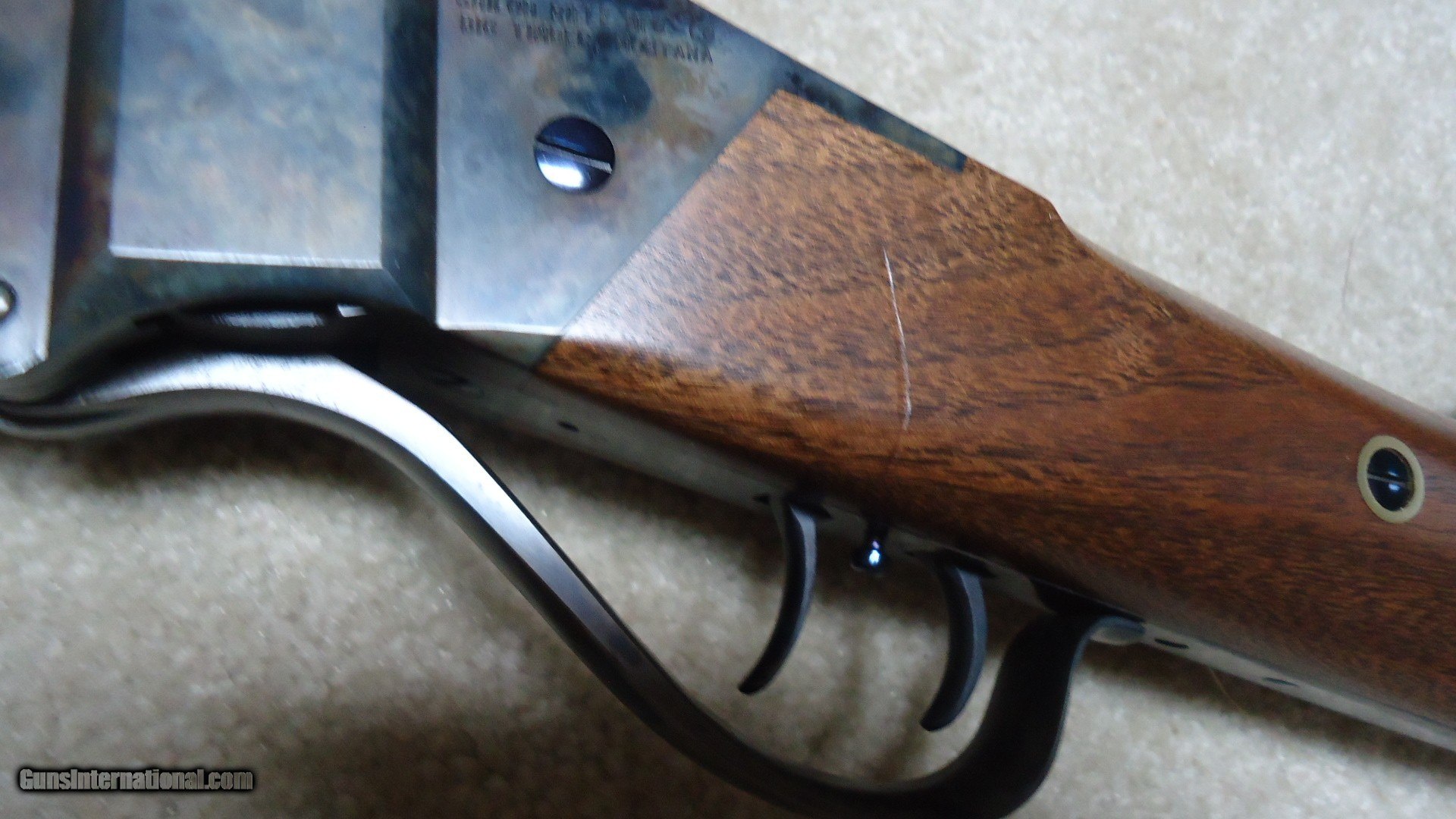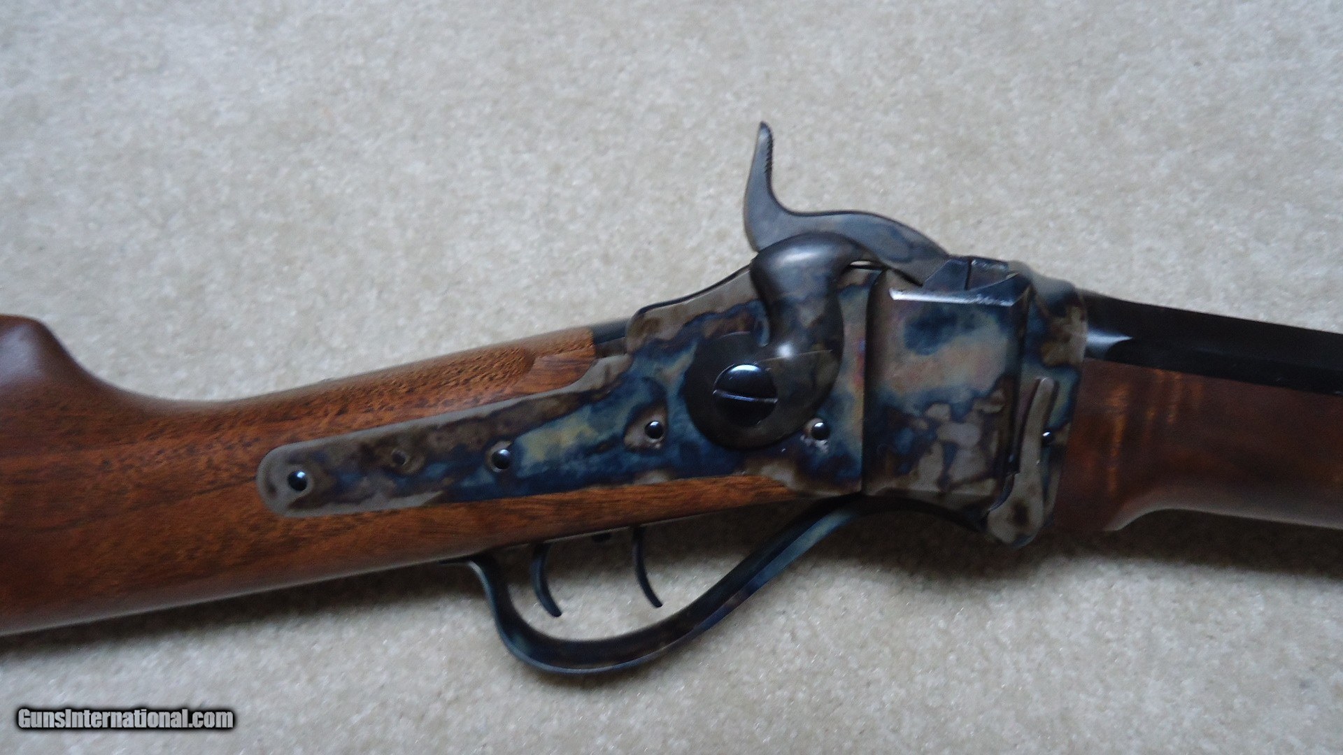 Description: Shiloh Sharps, Big Timber, Montana 1874 Saddle Rifle, 45-70, 30" heavy octagon barrel, full buckhorn rear sight, extra fancy walnut, AA finish, steel shotgun butt plate, brass escutcheons, pewter tip, accent line on the cheek piece, bone and charcoal pack harden case colors, polished barrel, polished fire blued screws. NOTE: This rifle is brand new and unfired, but in handling from the factory there is a small "indentation" line in the wood about an inch from the receiver on the left side. It is super minor, NOT a scratch and is very shallow- you'd have to look for it to see it. For this I am reducing the price by $100......................$4307.17 (#11255-A) (NOTE: I HAVE BEEN A SHILOH SHARPS DEALER SINCE THE 1990s. I can custom order you a rifle and usually have it in about 6 months.) SOLD Rifle Caliber: .45-70 Government Manufacturer: SHILOH RIFLE Model: 1874 SADDLE RIFLE Serial Number: 88XX B Barrel Length: 30 Condition: NEW IN BOX |