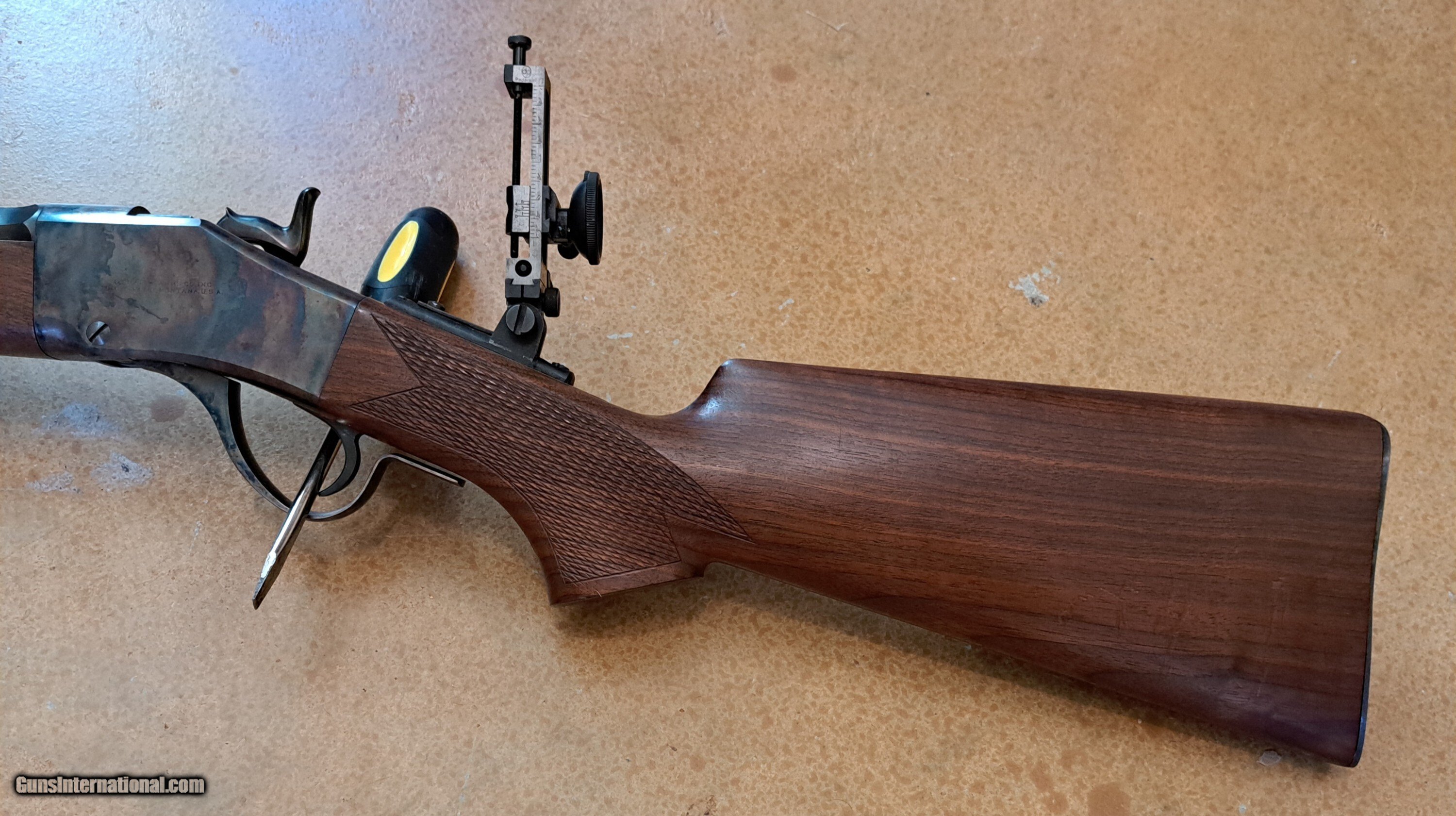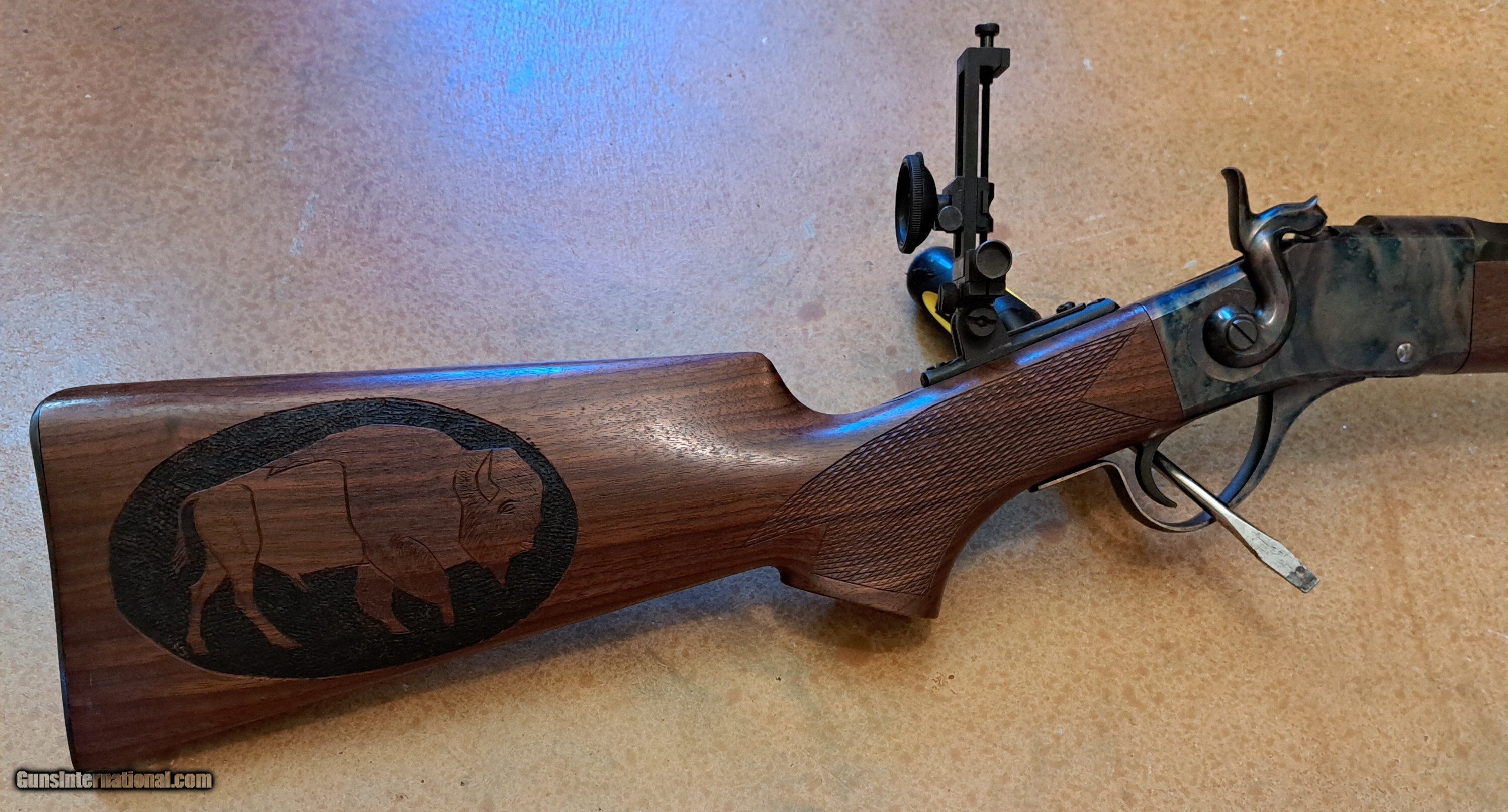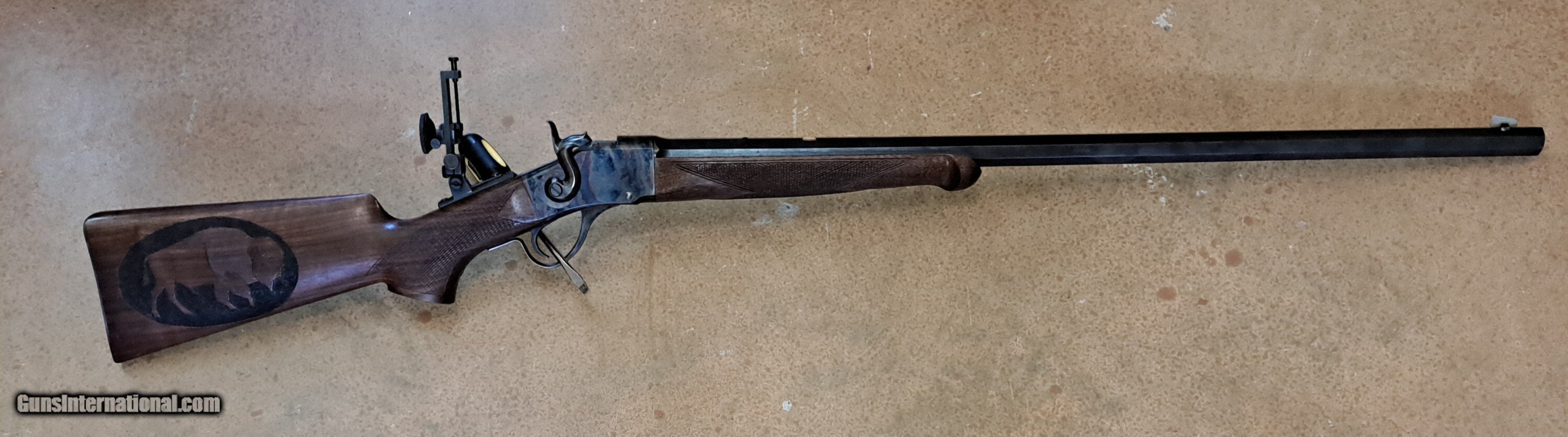 Description: Used, but not abused, C. Sharps Model 1875 in desirable mid-range .40-65. It has a heavy 30" straight taper octagon barrel with excellent bore. Bluing would rate maybe 98%. Silver blade front sight and vernier tang sight with adjustable aperture. No rear barrel sight. Extra screw hole for some previous aftermarket rear sight. Excellent case colors on receiver. Smooth action. Stocks are overall very good plus with excellent checkering. There is a stylized bison carved into right side of buttstock. Some safe rash on left side. Checkered steel buttplate. LOP is 14 1/8". Rifle weighs 9.7 lbs. I will soon have a large supply of brass, bullets, wads, and die set that can be purchased separately. Rifle only, $1500 + Shipping to your FFL. Price: $1,500.00 Contact Seller |