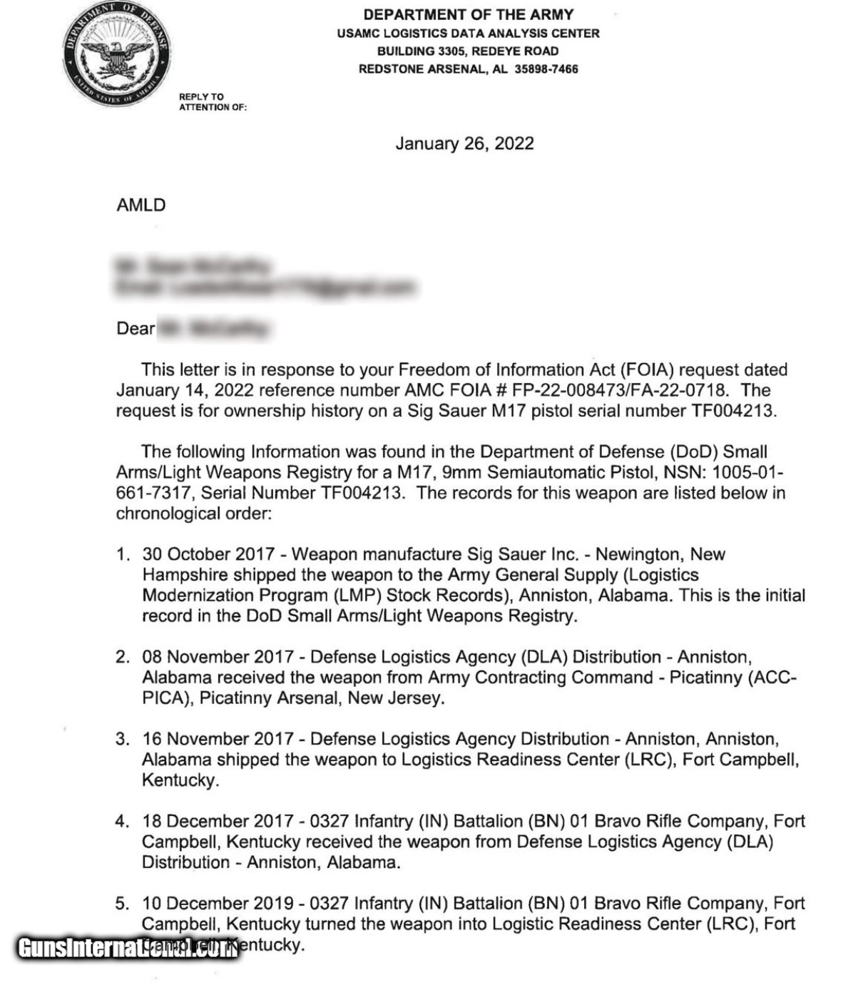U.S. Army Issued SIG Sauer M17 Pistol with Box and FOIA Letter
