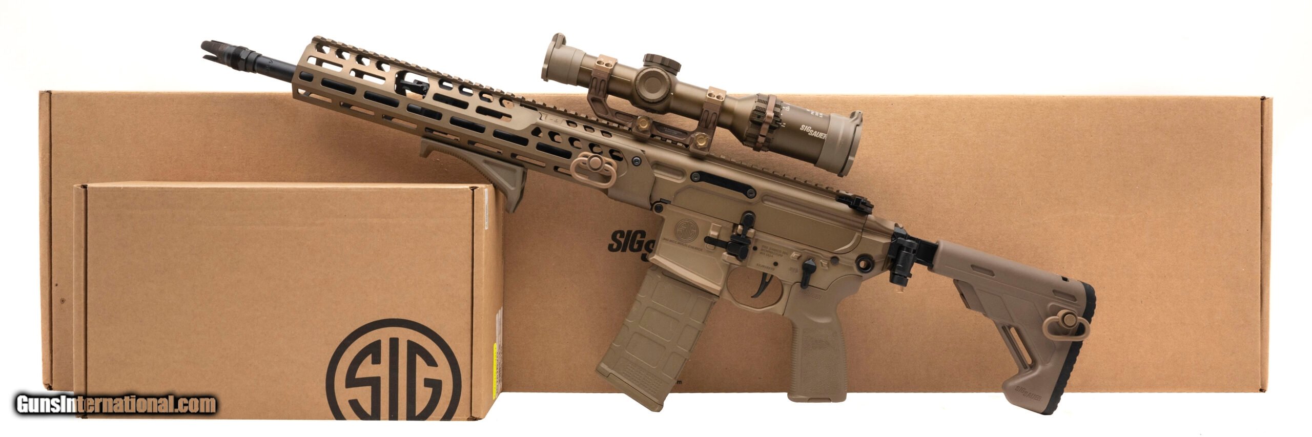 Description: "SN: 63J058920. Modern production 5.56 NATO with an 16"" Cold Hammer Forged Barrel and flash hider. Bore is bright with excellent rifling. Semi-Auto Rifle with a Sig TANGO6T S-VPS 1-6x Scope, Short Stroke Piston Operating System and Adj. Gas Block. Gen II NIR FDE Cerakote Finish is in excellent condition. Stock and pistol grip are in excellent condition. Overall condition is excellent comes with box and extra Sig Sauer folding stock. SOLD |