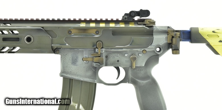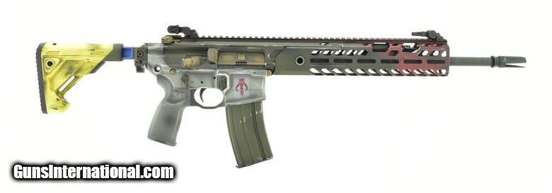 Description: Sig Sauer MCX 5.56mm caliber rifle. Sig Sauer MCX chambered in 5.56 with flip-up sights and side folding stock in custom Boba Fett finish by Blown Deadline.