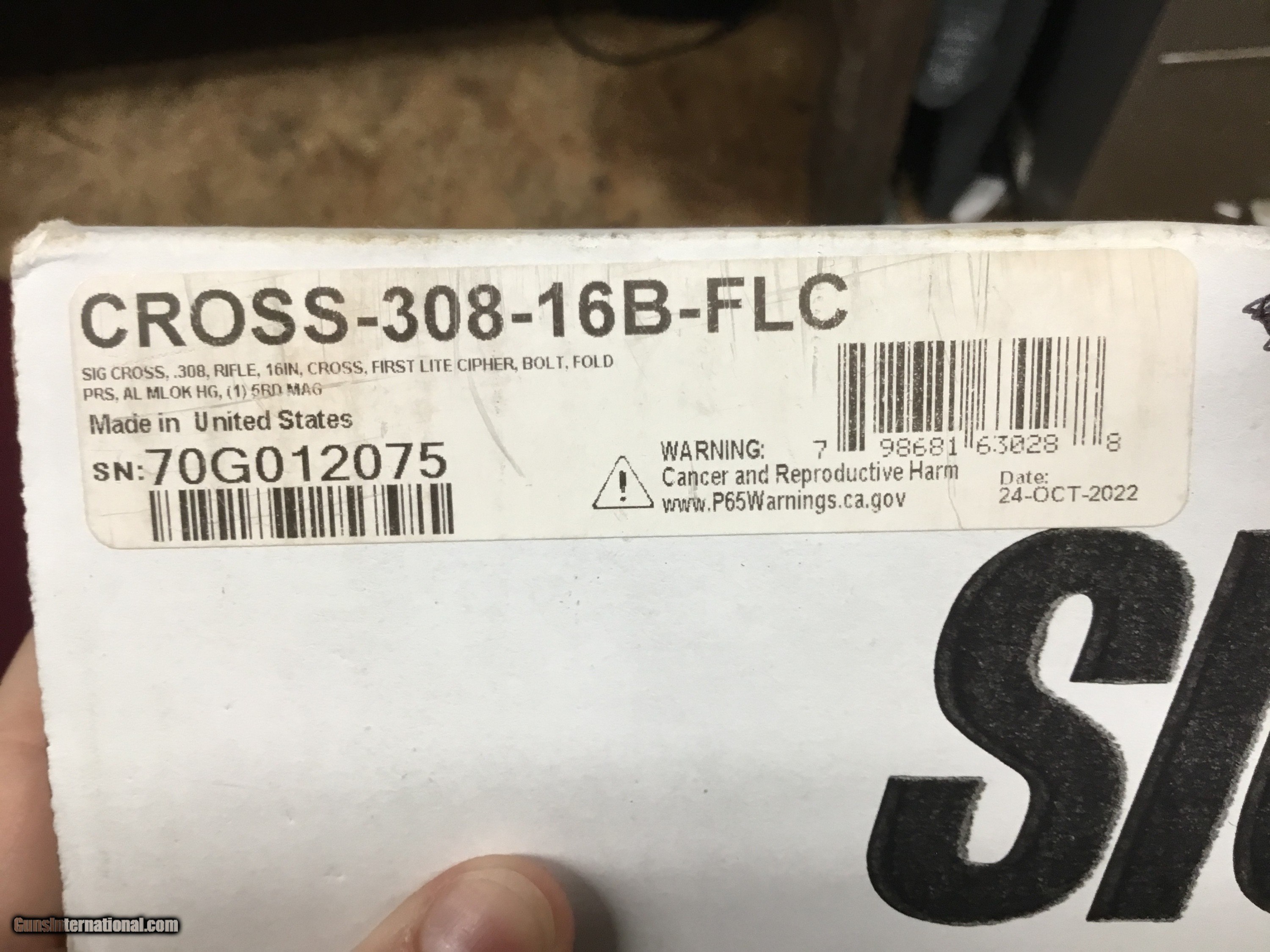Description: NICE Sig Sauer Cross 308 Winchester 16" Rifle is LIKE NEW IN THE BOX. Chambered in 308 Winchester........... has a 16 inch barrel length.......includes a 5 round magazine. Features First-Lite Cipher Camo, a Sig Precesion Adjustable Folding Stock and Black Polymer Grip, with a Armokote Metal Finish. $1,399.00 $36.00 to ship and insure If you are WEST of the Mississippi shipping will be $10.00 extra Thank you for looking at our items. If it is listed on the site, we still have it in the shop. If you wish to buy, hit buy it now and call the shop to pay. We are open Monday thru Friday 10:00am-5:00pm EST ...........Ask for Bree....... (803) 874-1060. Please CALL the shop first if you are in California. You need to verify you can have this weapon, since we DO NOT accept returns from California. NO INTERNATIONAL SALES. SOLD Rifle Caliber: .308 Winchester |