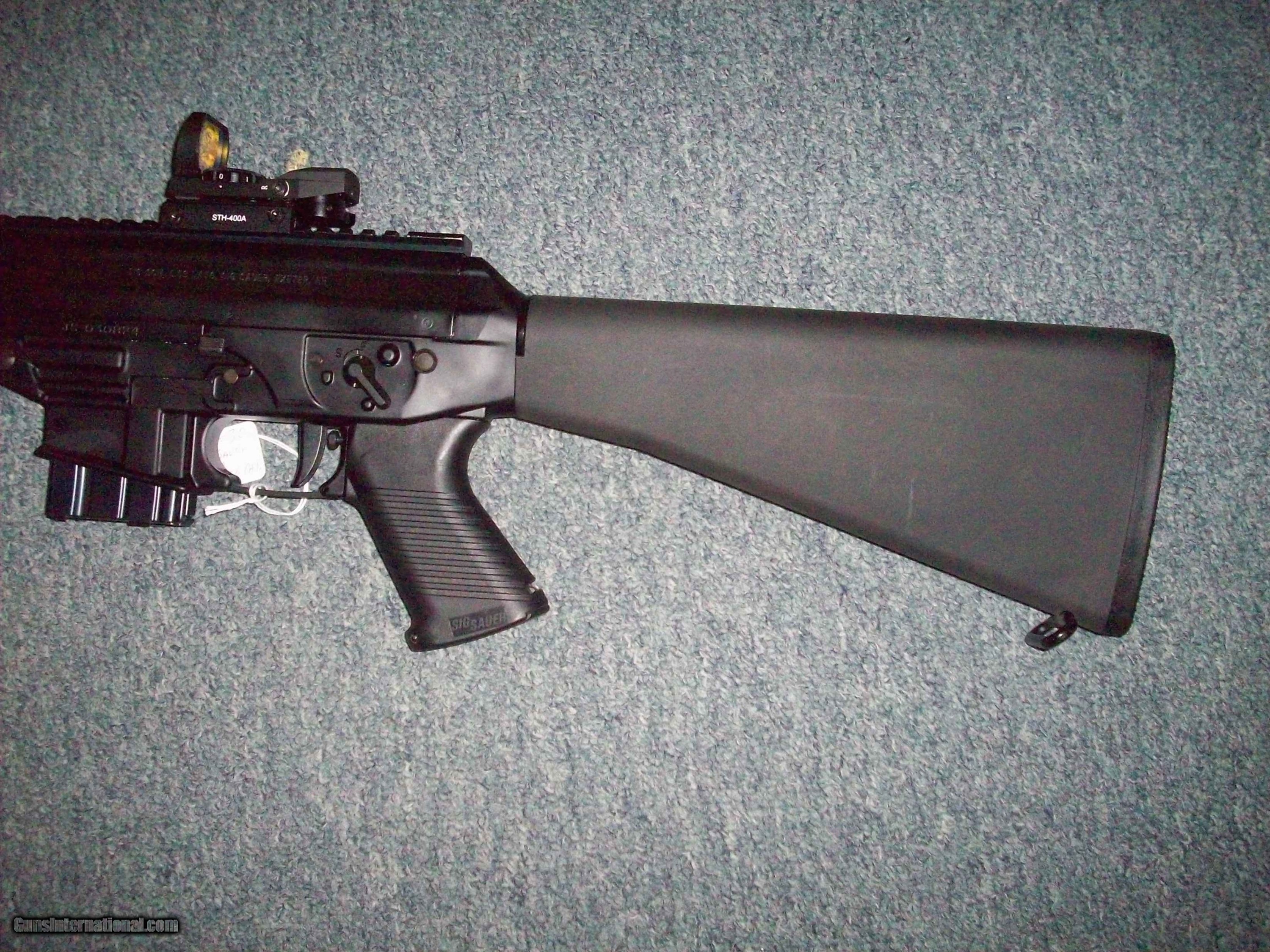Description: This 5.56/223 1cal. rifle is a Sig Sauer SCM model. 16" barrel, 10 shot mag., lower accessory rail, Sig Helo sight. Target crowned muzzle. Picatinny top rail. Condition 99%. Rub mark right side of receiver. Comes in Sig hard case. $800.00. rmgrigol SOLD |