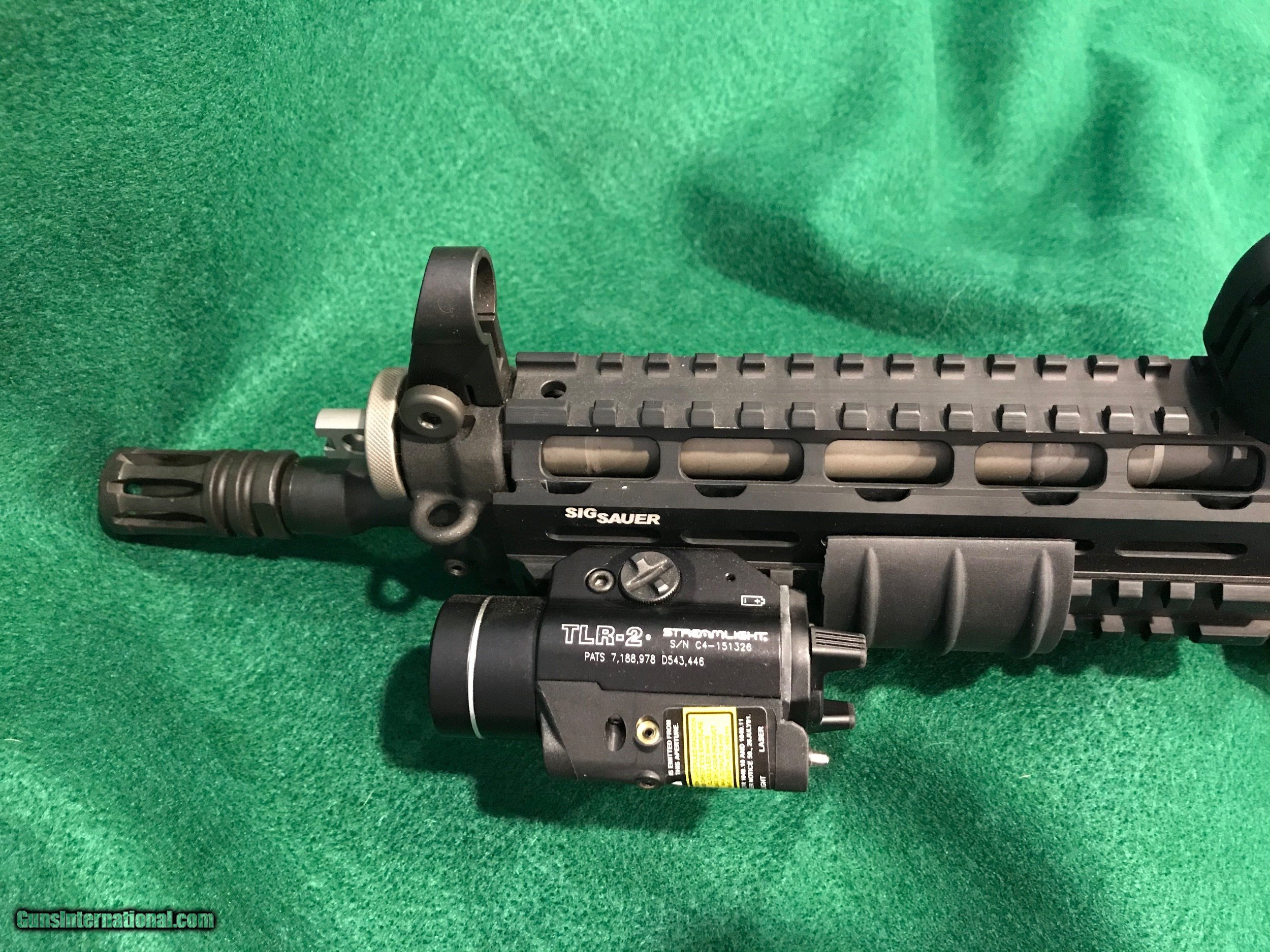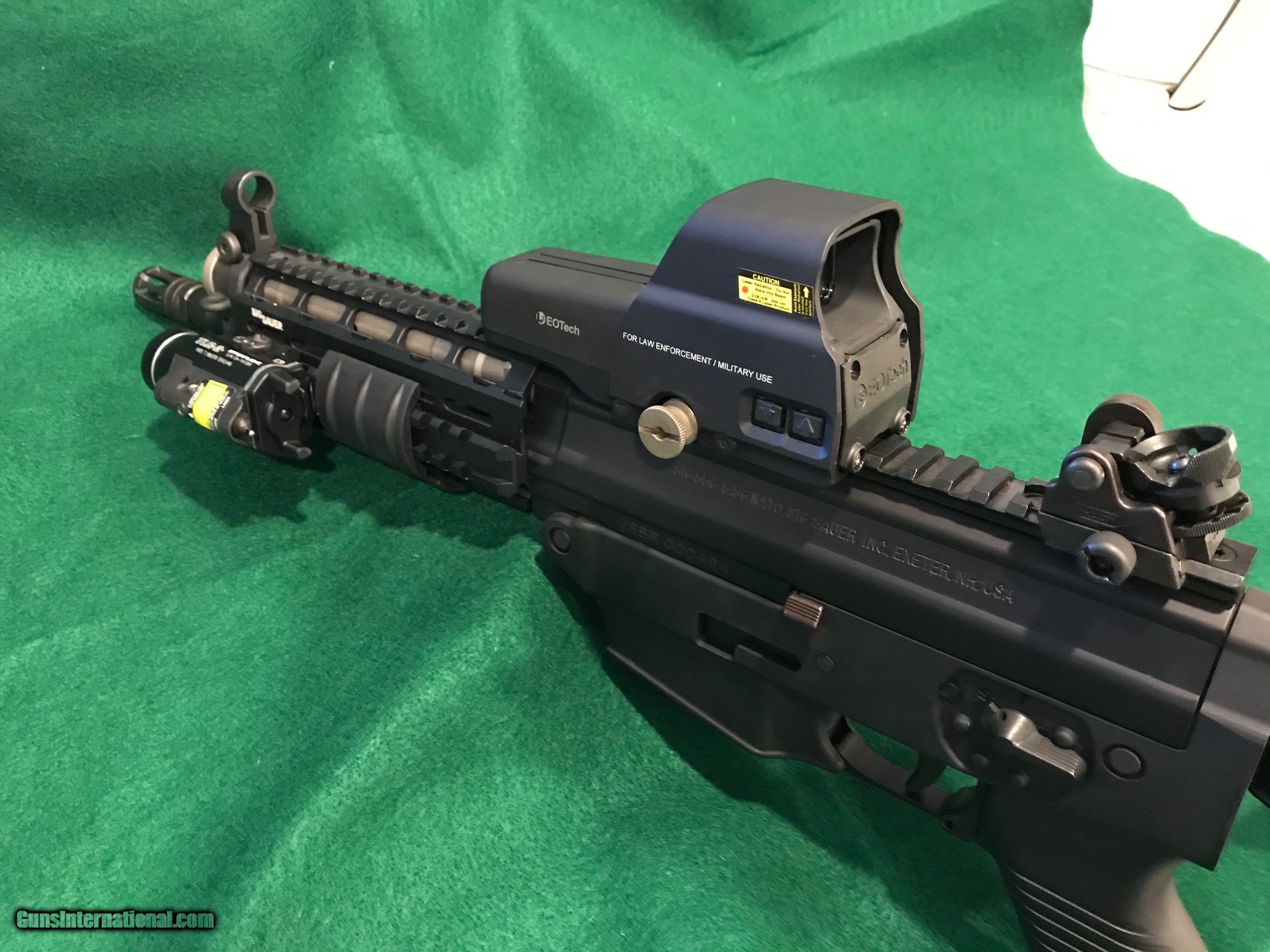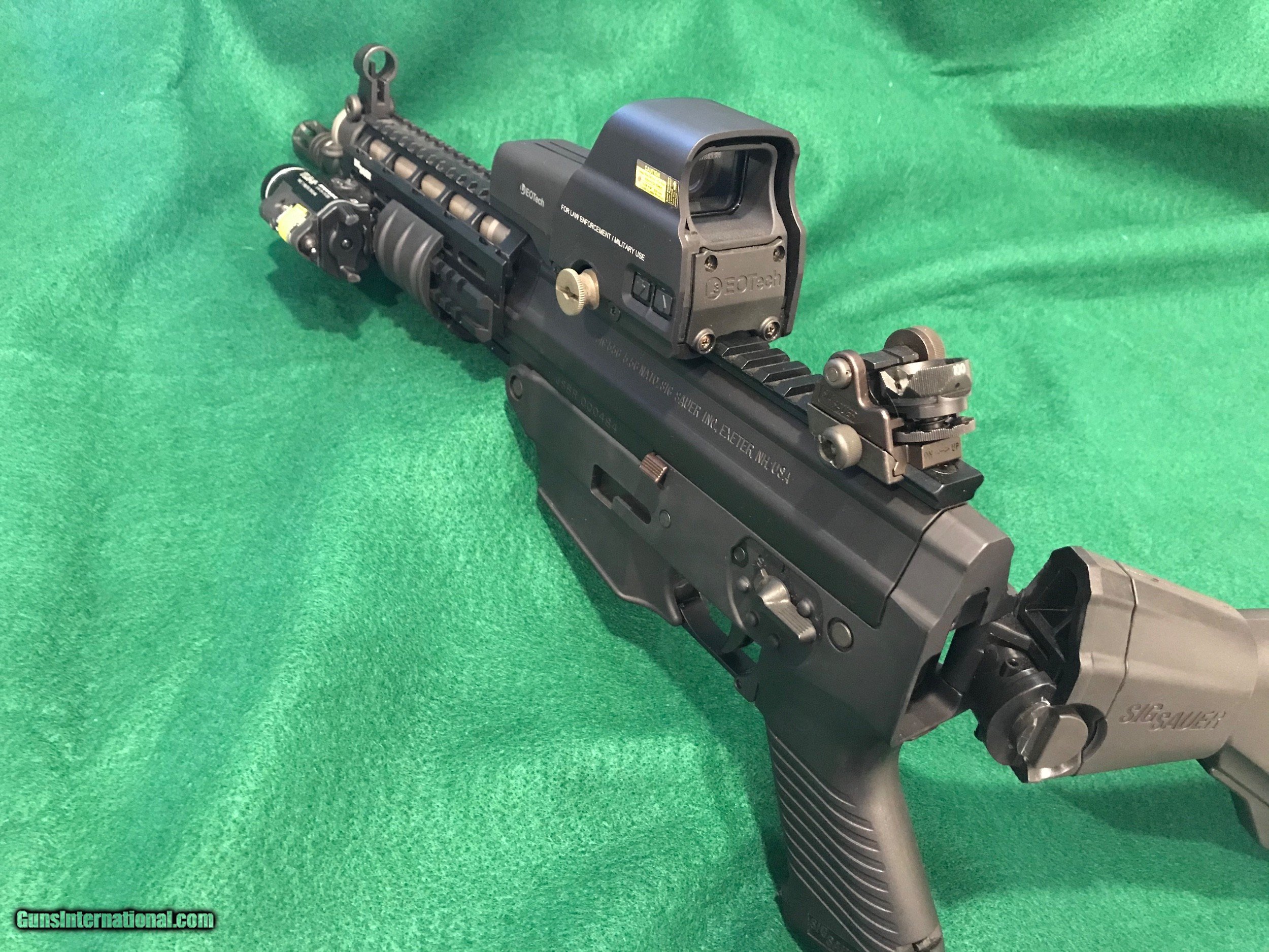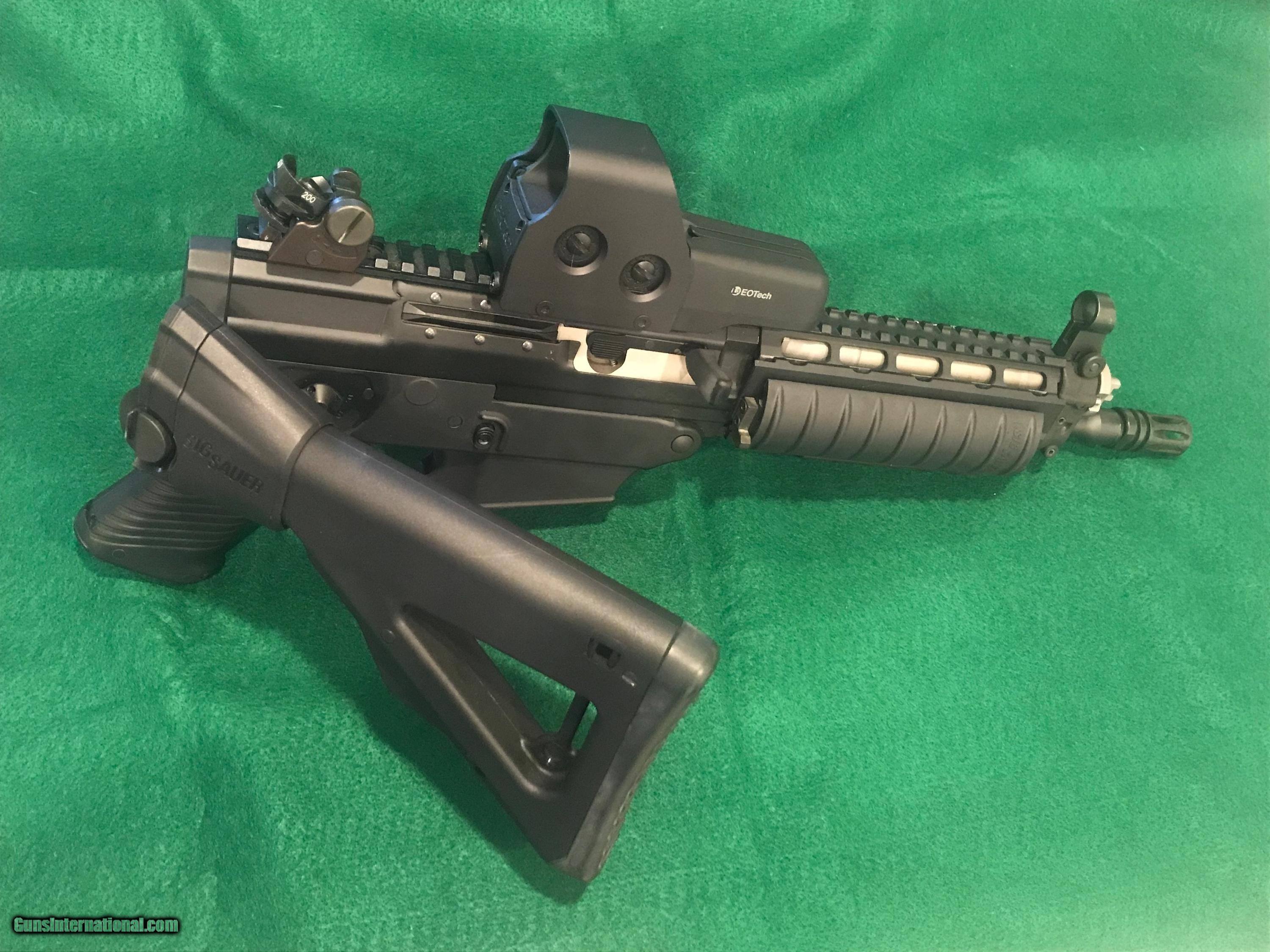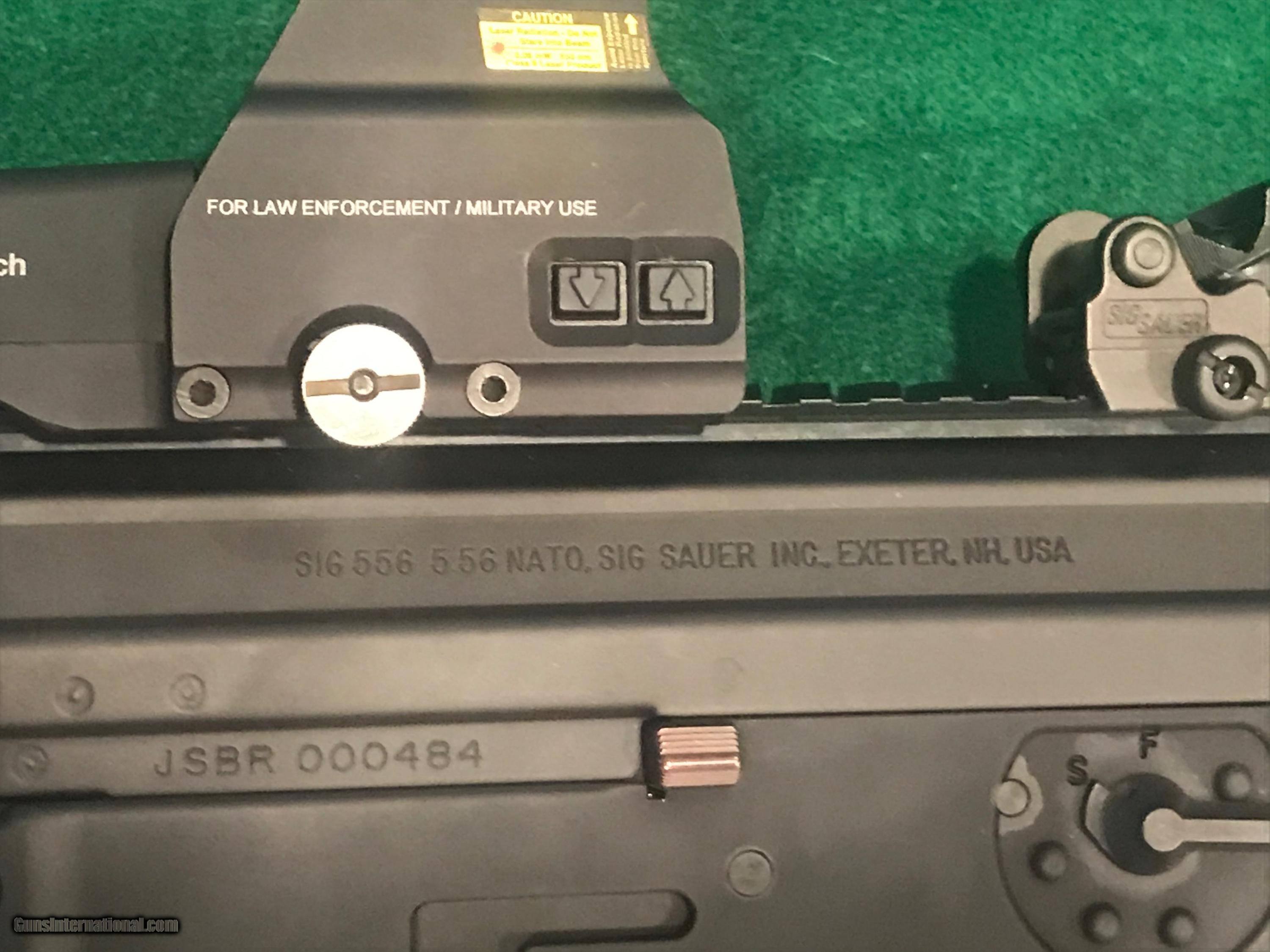Description: *REDUCED*. SIG SAUER SIG556405 SBR - CLASS III This is a new SIG SAUER SIG556405 "Short Barreled Class III Rifle, chambered 5.56 with a 10" barrel. It has a black finish with a quad rail, Folding Collapsible Stock and adjustable EOTECH Sight. Comes with an attached TLR-2 STREAMLIGHT, 4 clips and a Soft Sided BLACKHAWK! Case w/Strap. $50 S&H "MUST BE SHIPPED TO A DEALER WITH FFL & CLASS III LICENSE SOLD Rifle Caliber: 5.56x45mm NATO Manufacturer: SIG SAUER Model: SIG 556405 SBR CLASS III Condition: Excellent Stock: Collapsible Stock Finish: Black Sights: Adjustable EOTECH Extras: TLR-2 STREAMLIGHT Case: Soft Sided BLACKHAWK! Case Item Location: Florida |