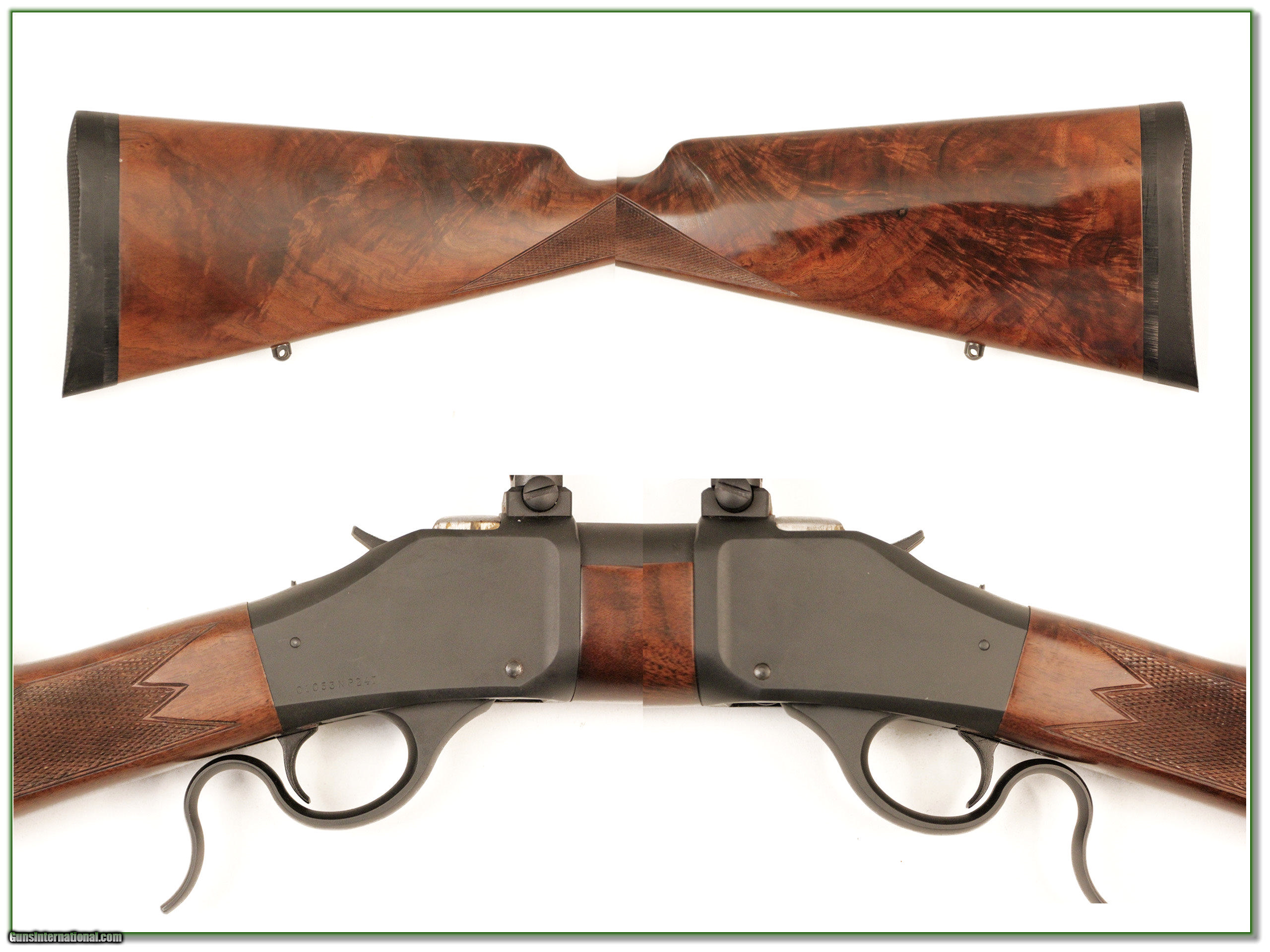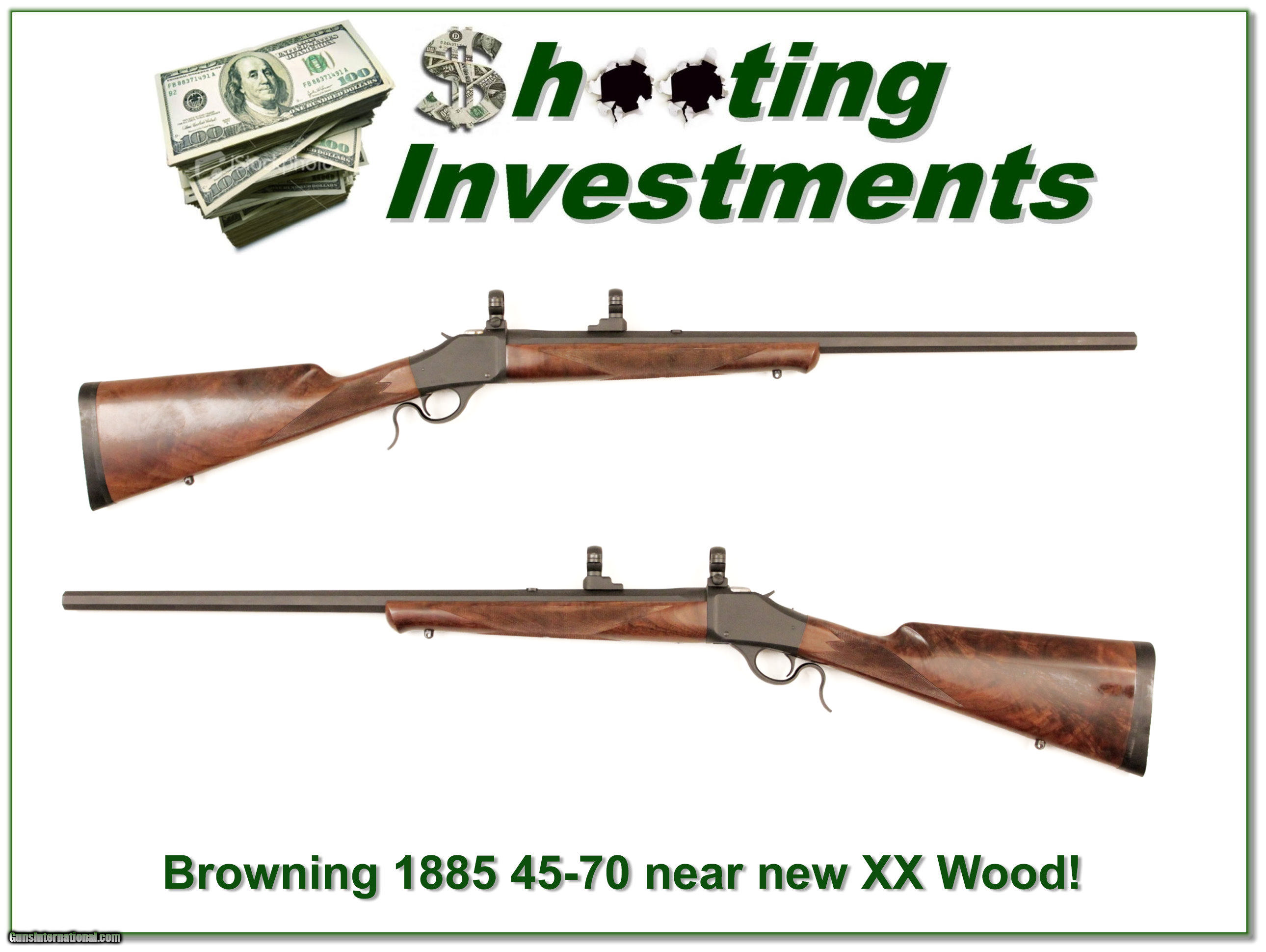Description: This Browning 1885 is chambered in the hard hitting 45-70. The blue is mint with octagonal barrel. And look at the wood! It is much nicer than most with only a couple marks. It is a real Shooting Investment! Shipping and insurance is $35 or $15 more if you want it shipped in a new Plano hard case. Please email me with any questions or larger pictures. (I now consign quality firearms only 10%! Let me know if you have any you would like to sell!) [16-0352] Payment: Payment is by Money Order, Cashiers Check or Personal Check. I can now also accept MasterCard and Visa with a 3% convenience fee. PayPal can be used for some items but never firearms. Please let us know if you would like to pay via PayPal. Shipping: The shipping charge will be listed in each description. It is $35 for most guns. Some heavy guns or those insured for over $2000 will be higher. Shipments to Alaska and Hawaii are higher because air shipment is required. Most firearms are shipped within 5 days of receipt of payment. We prefer shipping at the beginning of the week to avoid firearms in transit over weekends. We package all shipments carefully and insure them for the full purchase price, rounded up to the next $100. In the unlikely event that damage occurs, it is important that you save all packaging material for the claims process. Optics are shipped Priority Mail and most other non-firearm shipments are shipped First Class. Returns: Our return policy is simple. If for any reason you are not pleased with your purchase, you may return your item for a refund. The only exception is ammunition, it cannot be returned. It is important to us that you are happy. Guns cannot be fired or dissembled before returning them and must be returned in the same condition as received. Notification of a return must occur with-in 3 days of receipt at your dealer. Shipping, convenience and dealer fees are not refundable and are the responsibility of the buyer. Lay-a-way: If needed, we offer a 60 day lay-a-way option on most firearms. It is 1/3 now, 1/3 in 30 days and 1/3 in 60 days. Lay-a-way firearm sales are final. Consigning your firearms with Shooting Investments: We will help you get top dollar for your firearms. While most local guns shops charge 20% or more, our fee is only 10% with a minimum of $50. At your local gun shop it might take months to sell. Selling on-line provides instant access to thousands of interested buyers. You won’t find any other on-line dealer willing to sell your firearms for only 10% or listing every gun on 4 separate s. Selling through an House typically costs the seller 15% and the buyer an addition 15% (so 30%) and you have to wait several months to sell and longer to receive funds. If properly priced, we will sell your firearms in a week or two. Send us an email or give us a call and we’ll explain how easy it is for you to get top dollar. Trading: We collect guns and usually just trade for guns we want to add to our collections. We often sell guns for others wanting to purchase one of ours. We find this the most fair to both of us. Our Commission is only 10% and we hold the gun you want until yours sells. Please contact us if you want to sell one of yours to buy one of ours. Help for California Buyers: We are happy to ship to California. It is the buyer’s responsibility to make sure any item you buy is legal in your state. We are also happy to help with your purchase of a firearm from someone other than us. If you see a gun you would like to buy but the seller can’t or won’t ship to California we can help. You buy the gun and have it shipped to us. We’ll then ship it to your California dealer. The cost for this service is only $30 + shipping. Let me know if we can help! SOLD |