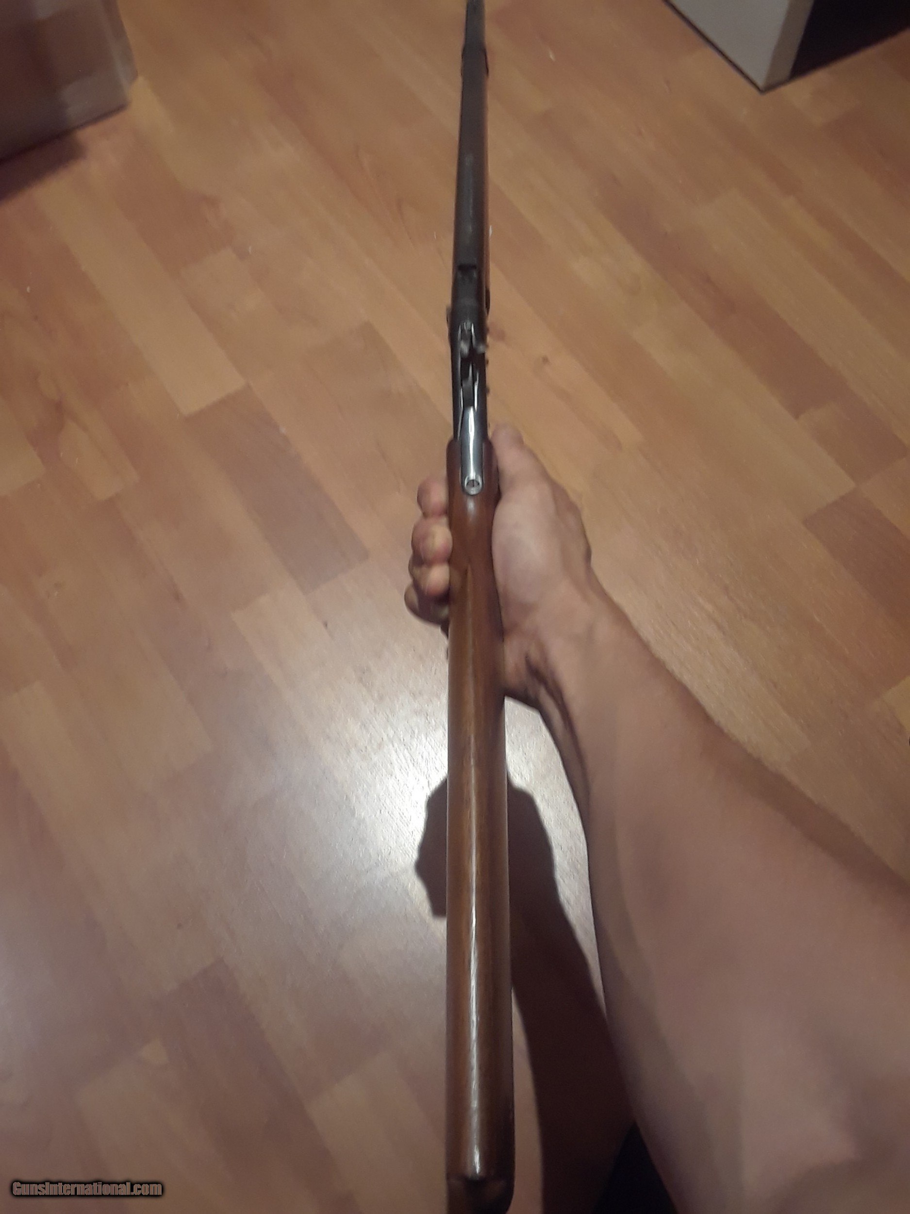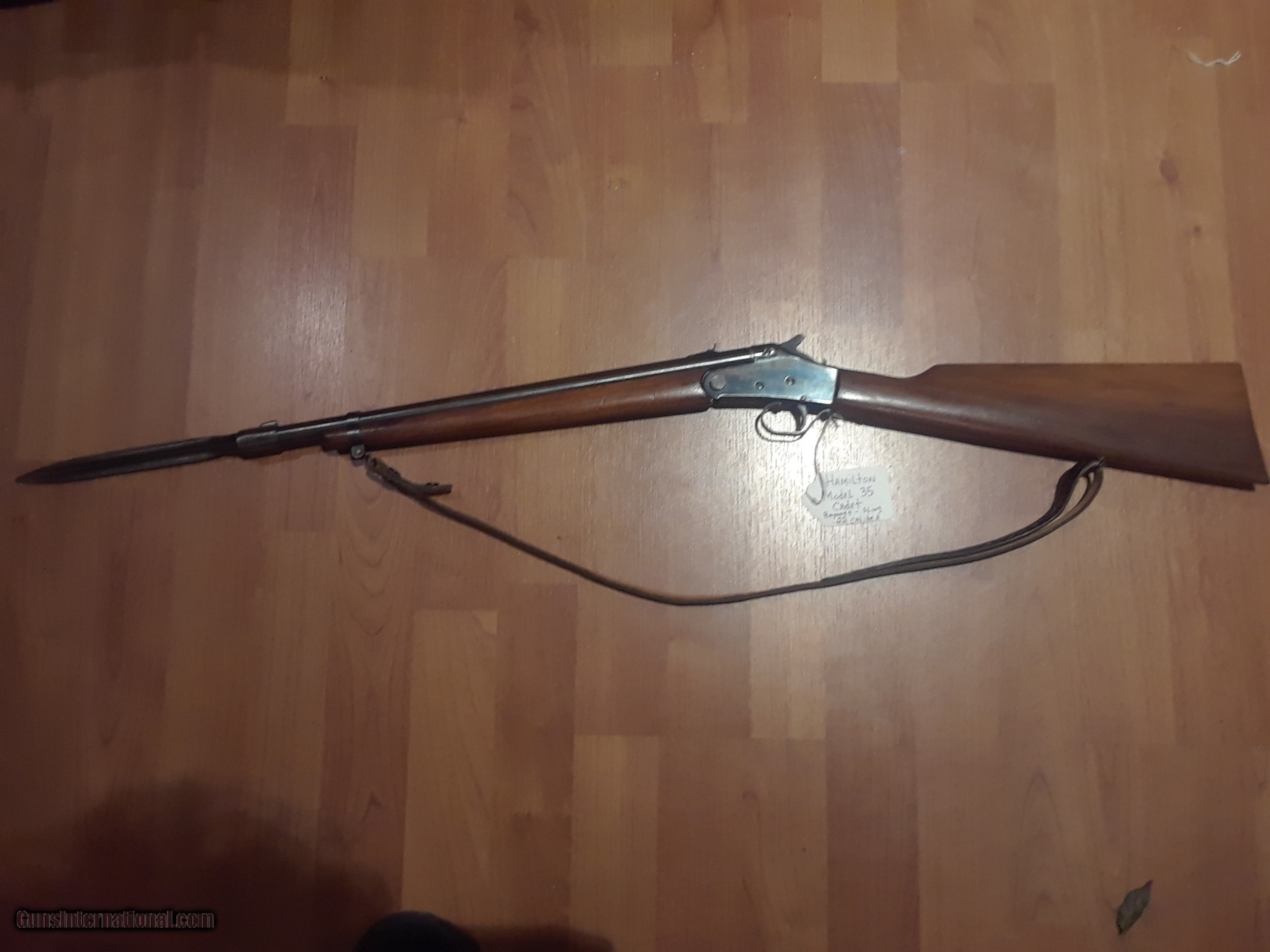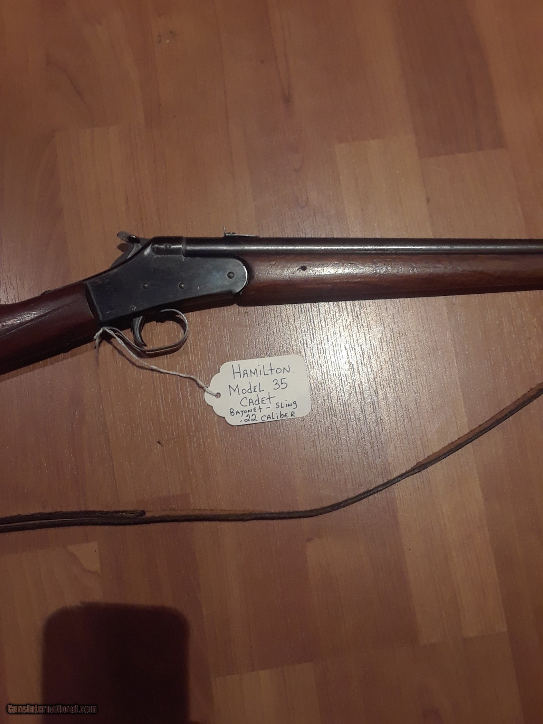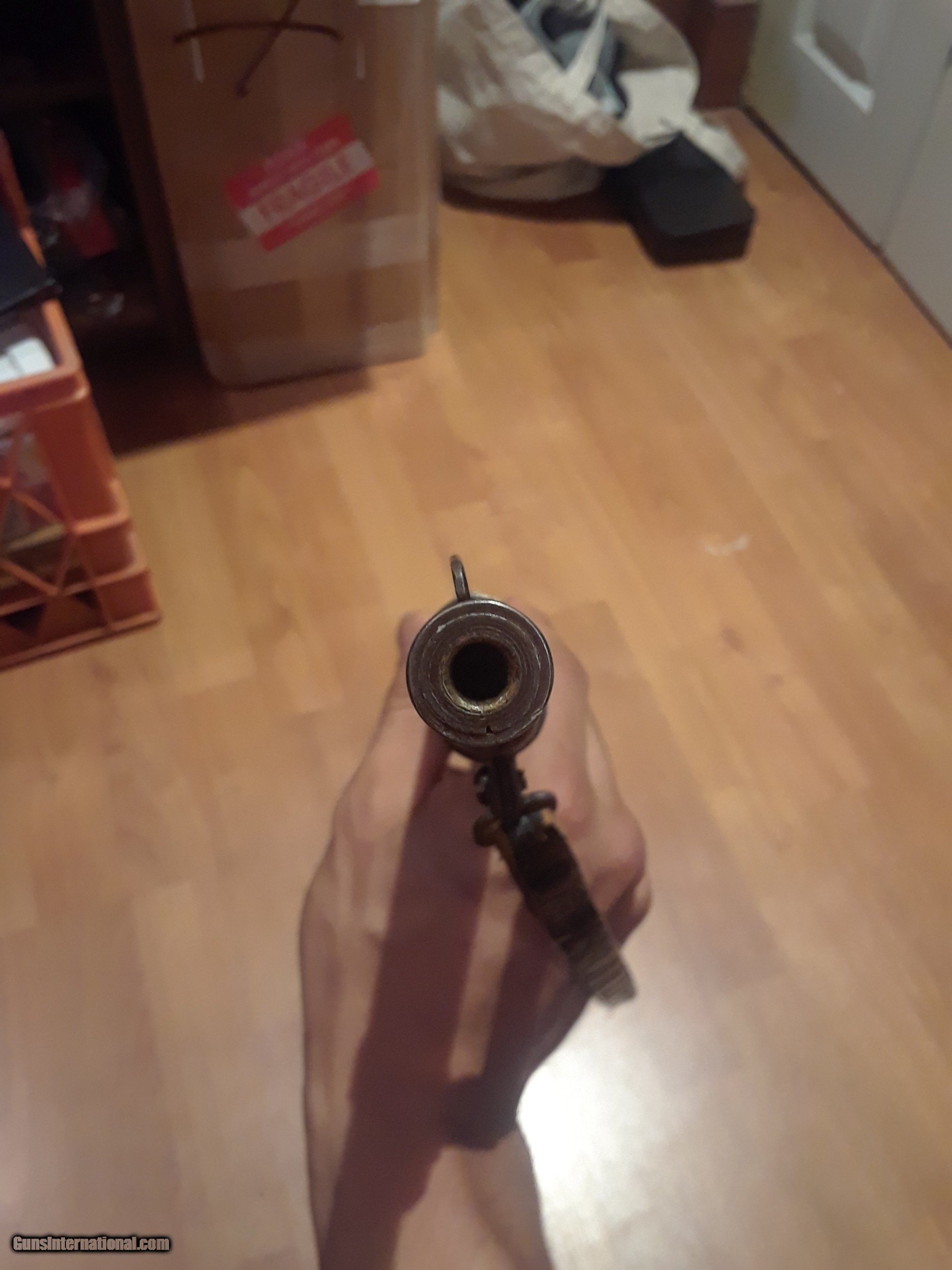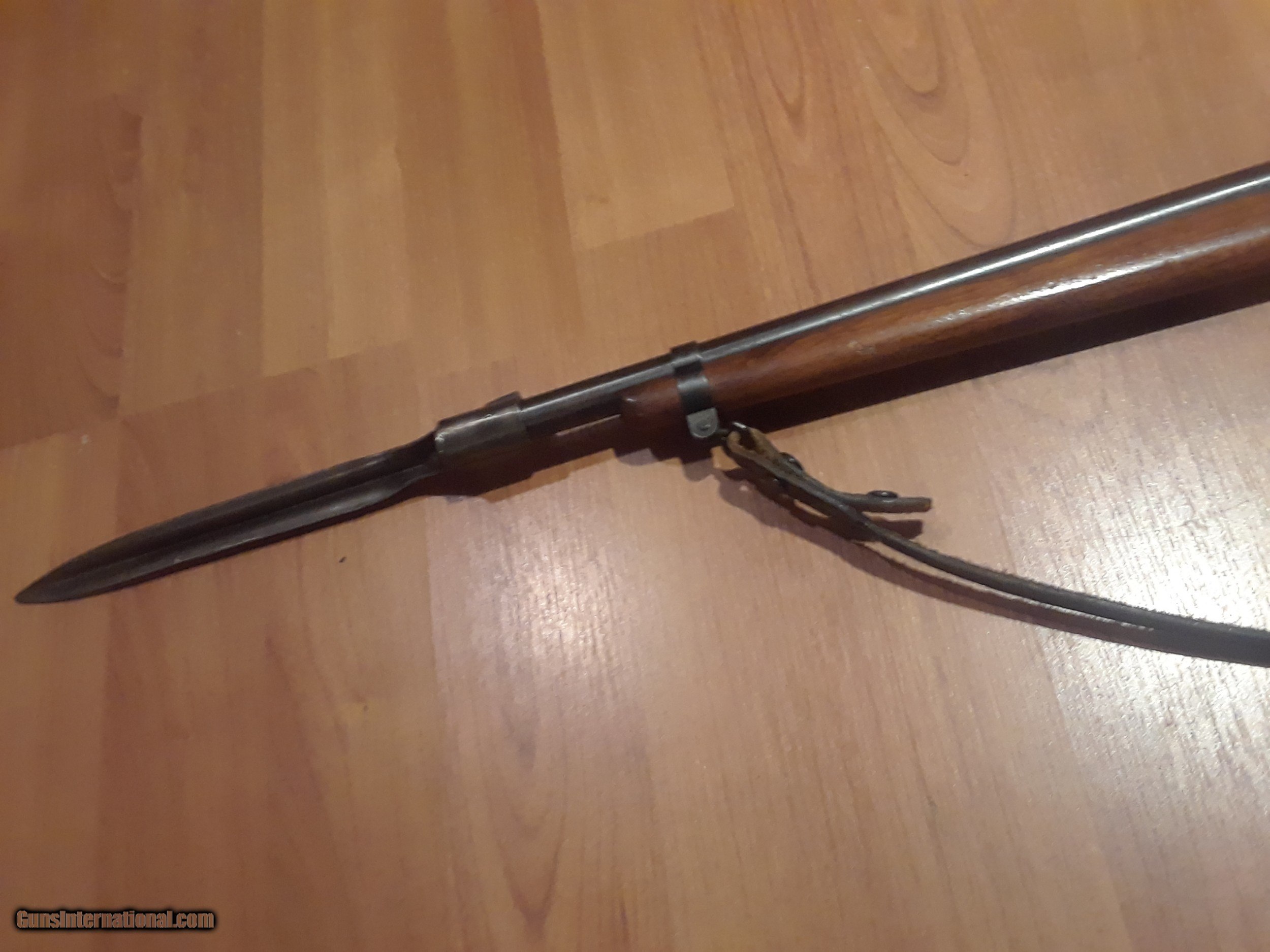 Description: Musket style with sling and bayonette. Excellent bore. Wood finish is excellent. Blue 70% plus. Hard to find gun in hard to find condition with accessories. SOLD Curio/Relic: Yes |
