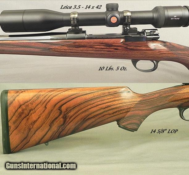 Description: Penrod - Tucker (Mark Penrod & James Tucker): A Complete and Total Custom 22-250 on a FN Mauser Solid Bottom Single Shot Action finished in 2011, This is all Penrod Metal and all Tucker Stock Work, 24" Krieger barrel, No open sights, Profiled Leupold type scope bases, Leica 3.5 - 14 x 42 scope, 2 position Chapman bolt sleeve safety on the right side, Excellent adjustable Blackburn trigger, Excellent custom trigger guard bow by Blackburn, Full custom bolt handle, Checkered bolt stop release; Heat blued extractor body, bolt stop spring and trigger bar, The action is detailed with excellent polish & finish inside & out that all has the touch of Mark Penrod, A pure James Tucker classic stock using a very nice piece of English walnut with excellent color & contrast, Shadowline cheekpiece, Full wrap around point pattern checkering with a mullered border, Jerry Fisher Steel grip cap, Ebony forend tip, Double screw tiedown sling eyes, 10 lbs. 5 oz., 14 5/8" LOP over a 5/8" pad; Penrod blueprinted the barrel and action, squared the action and squared up the bolt face, The action is finished to meticulous detail, The original blue remains at 99%, The original stock finish is at 96%, The checkering remains at 100%, The bore is excellent plus. The piece will shoot 5/8" 5 shot groups at 100 yards. The FN action is an original solid bottom single shot and not welded or made into a solid bottom. This is a very nice American Classic bolt rifle by a couple of guys that have made their mark as doing top drawer custom gun work. ////////////////////////////////// James Tucker lives in Medford, Oregon and is one of America's best stockmakers, he is pure classic in style and his inletting is almost perfect. I don't like the word perfect but this is getting very close. He is also an instructor and has shared his passion with many people looking for the right direction. Mark Penrod lives in North Manchester, Indiana and operates as Penrod Precision. He does excellent metal work and is known all across North America for precision work with accuracy from 22's on up. He is a competitive shooter as well. SOLD |