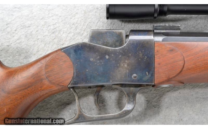 Description: This Meacham Model Hoch is a single shot falling block action rifle in .32-40 Win. Cal. It has a 30 inch heavy octagon barrel. It is outfitted with a Weaver Scope. No iron sights. The butt stock is a smooth grip walnut pistol grip with a raised cheekpiece. The forearm is a smooth grip walnut Schnabel style. The receiver and butt are case colored. .32-40 Winchester SOLD Chambers: Single Shot. Metal Condition: Good. Some minor handling marks and surface blemishes. Wood Condition: Very Good. Some minor handling marks. Bore Condition: Excellent. Barrels: 30 inch heavy octagon. Stock Dimensions: LOP 13 inches. Fore End: Smooth grip walnut Schnabel style. Butt Pad: Smooth case colored Schuetzen style. Weight: 13 lb. 12 oz. Sights: Weaver CT36 Micro-Trac Scope. Item Location: Richfield, WI |