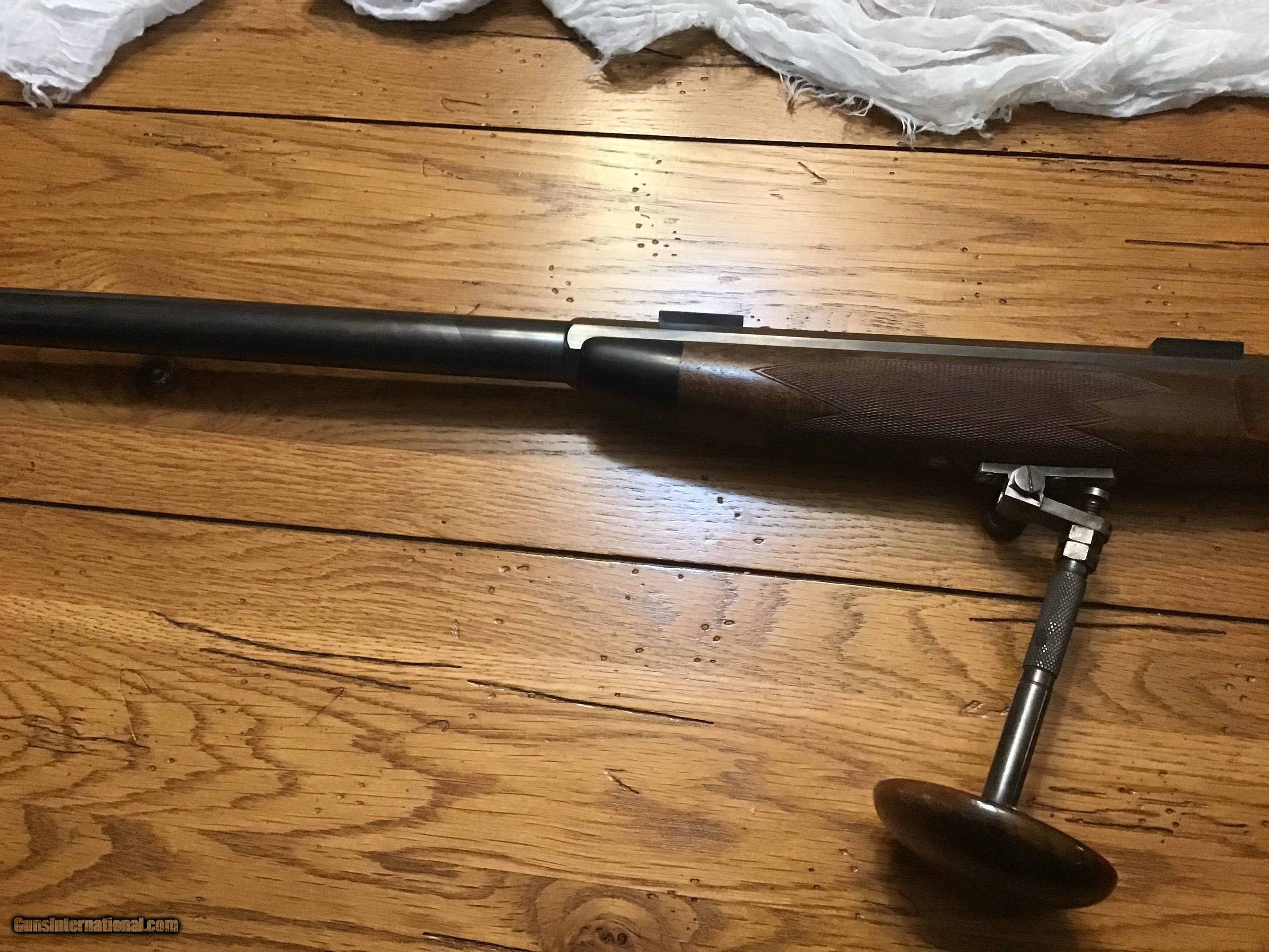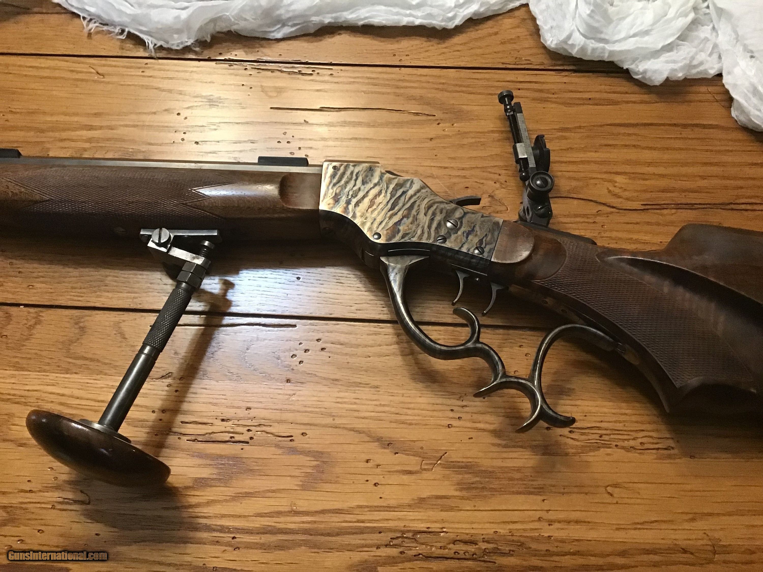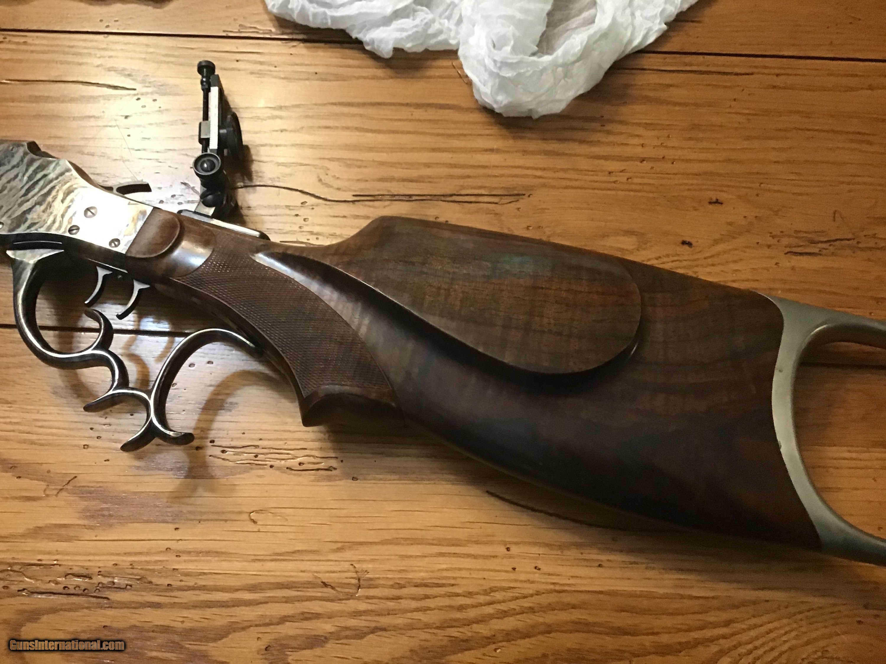 Description: A replica of Stevens Pope or Stevens 44 in 32-40 . Schutzen style with appropriate butt stock and midrange sight on tang . Badger barrel with .315 bore and .321 groove diameters . Palm swell with adjusting screw . Hard to tell if she’s ever been fired , at least very little ! TEO stamped under forearm, along with Big Timber Montana etched in barrel . Overall excellent condition ! $1850.00 delivered to most of 48 thanks for looking SOLD |