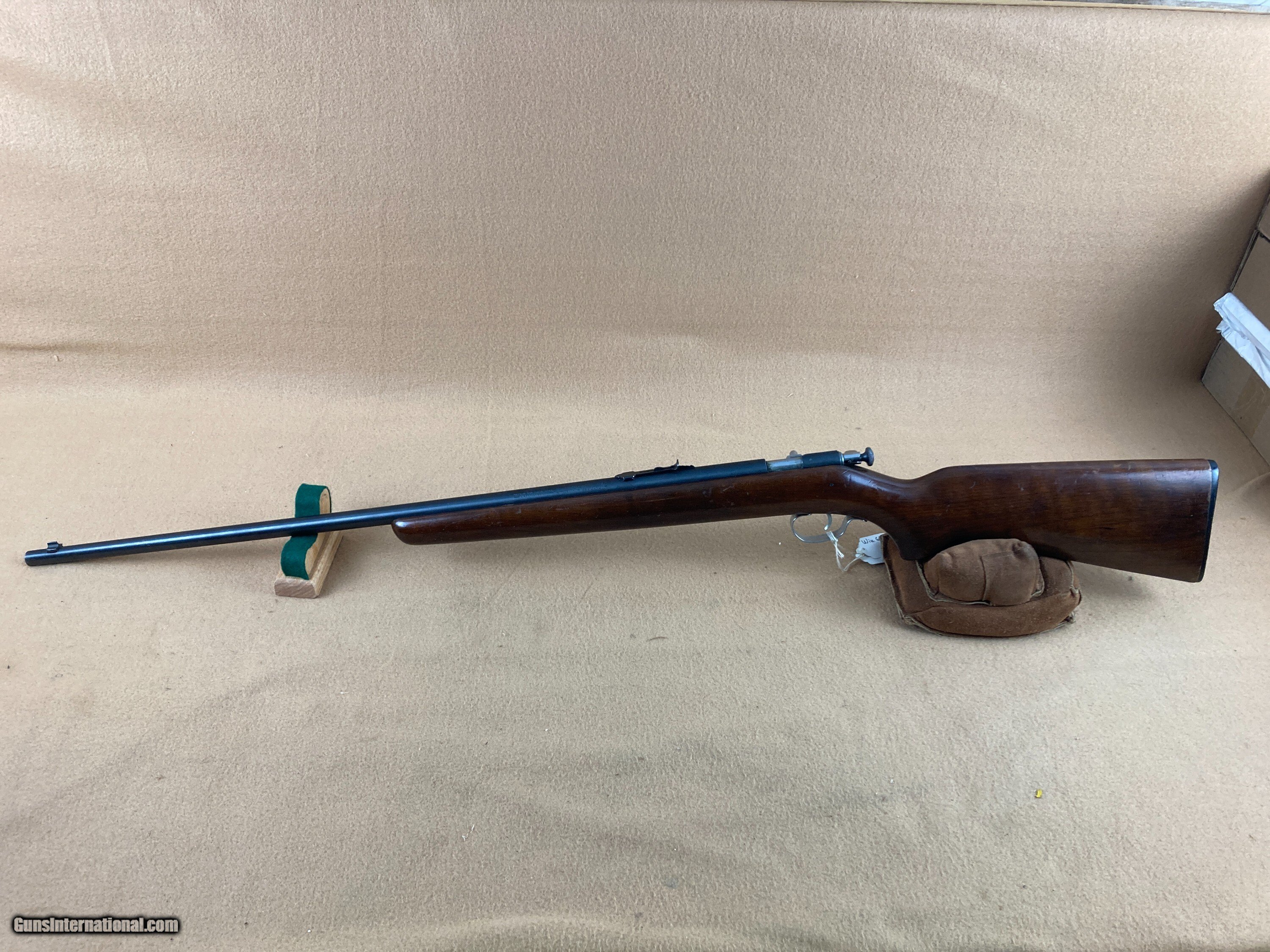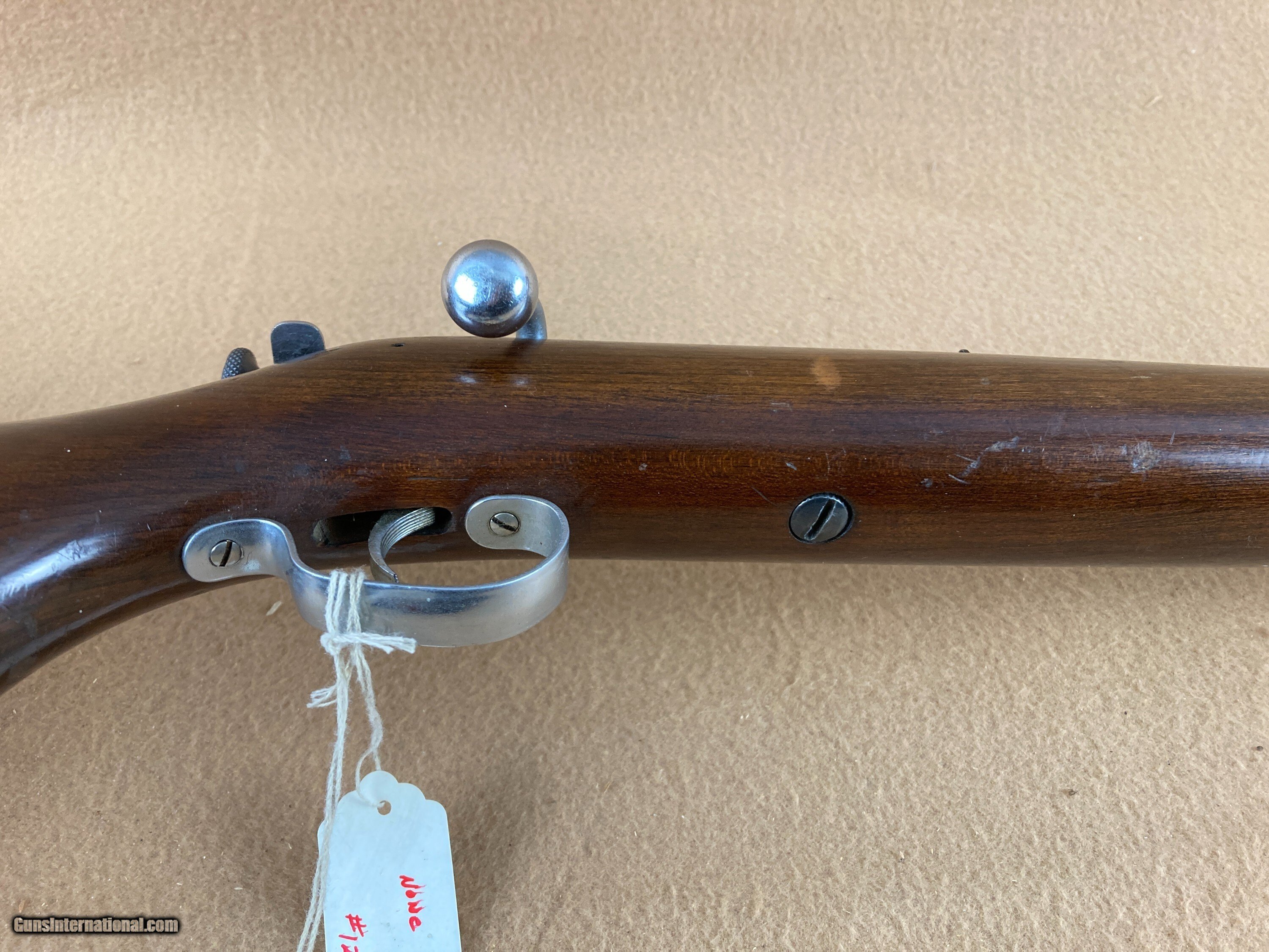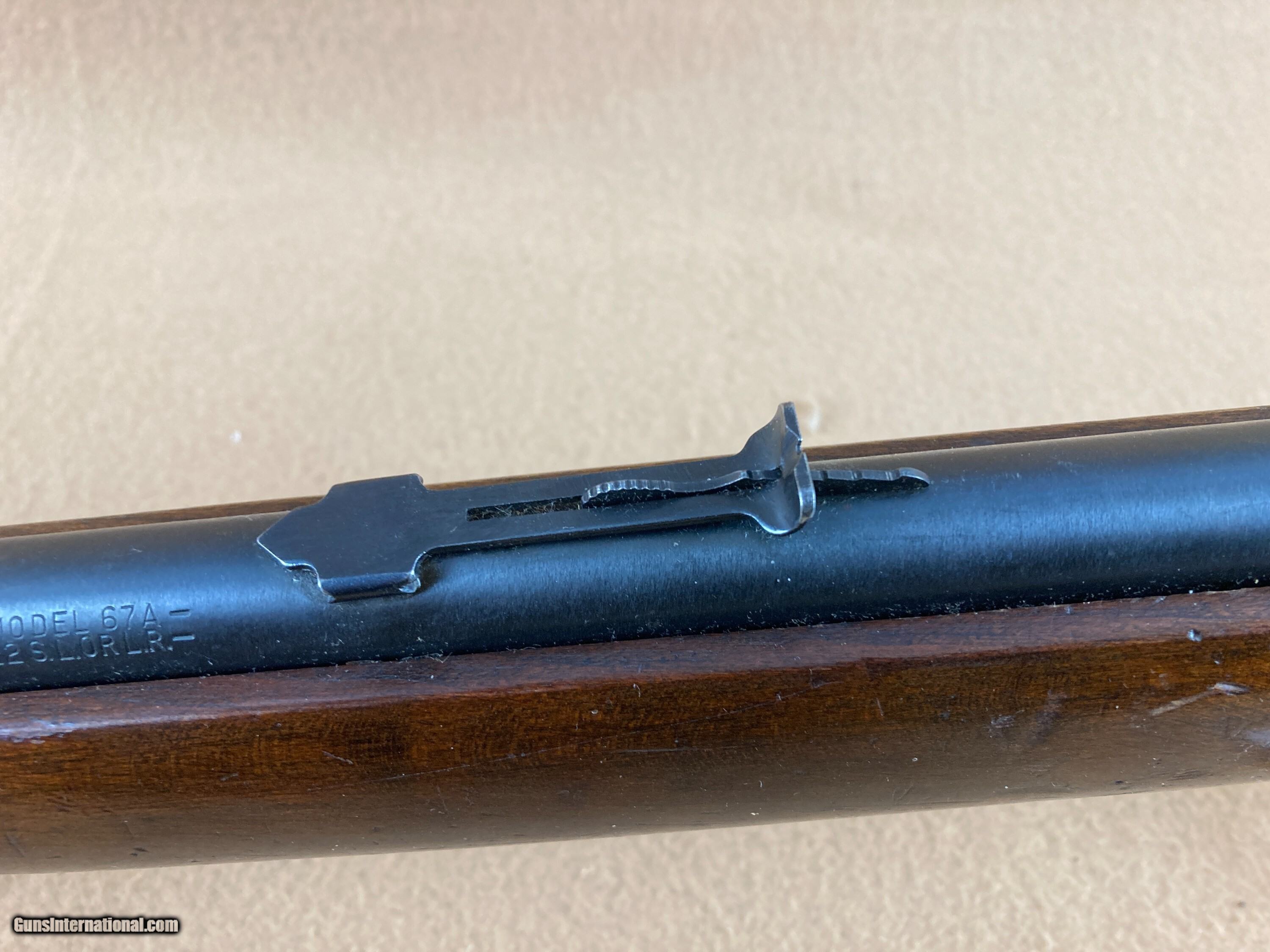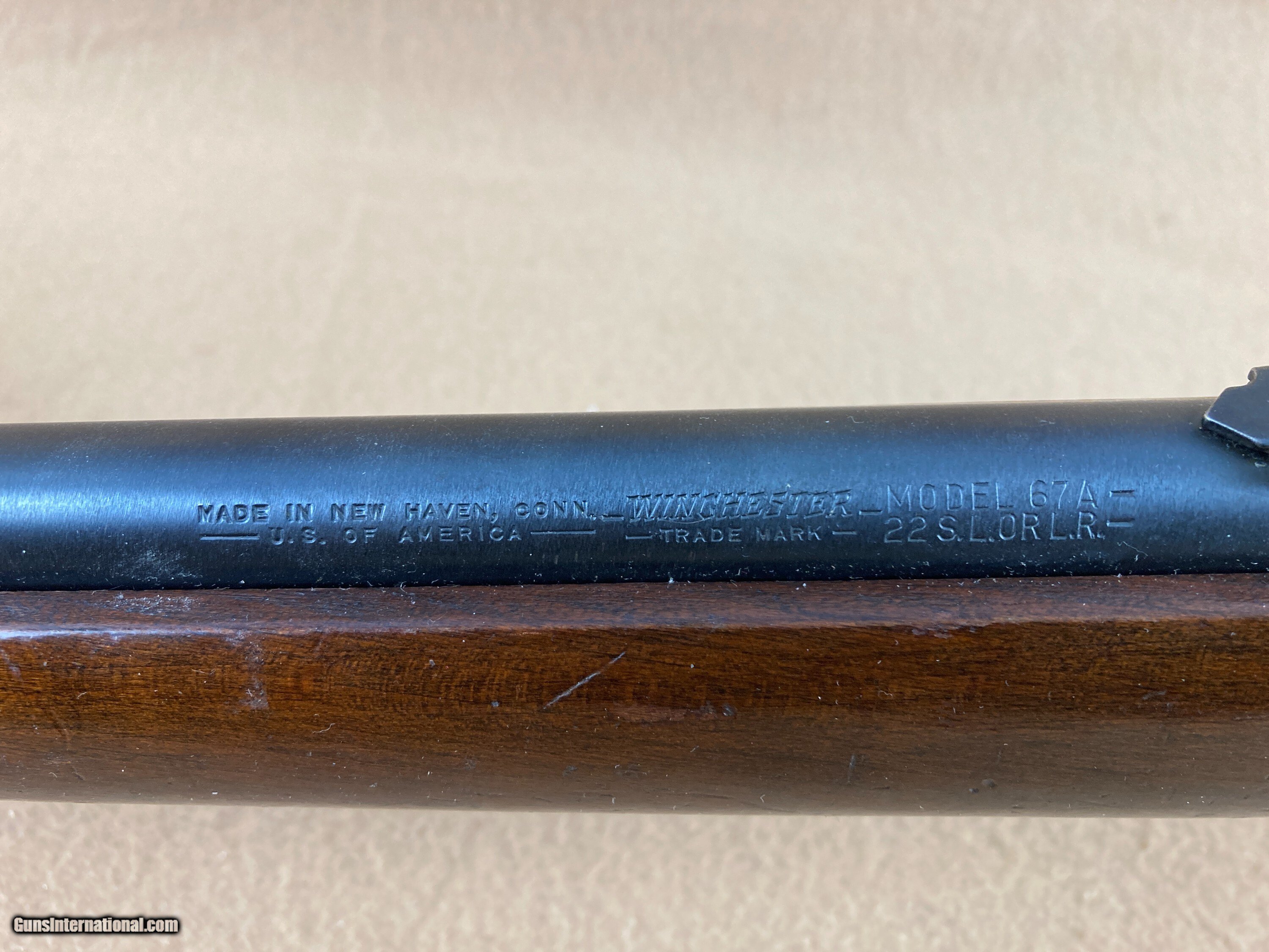 Description: Fabulous Winchester model 67A in .22 Short, Long, Long Rifle Caliber. This model was first introduced in 1934. The barrel markings according to “The Winchester Hand Book by Madis”, indicates it to be a later model. The model 67 and 67A had no serial numbers on them, making it hard to pin down the year this weapon was produced. Last year of production was 1963 according to a Google search. The bore is bright and shiny with beautiful rifling, has no visible pitting. Overall bluing rates at 90%, with some handling wear and dings. The wood is very nice with the expected scratches and dings and no visible cracks. Plastic butt is complete with no cracks. The chrome bolt, trigger and trigger guard are in beautiful condition with no rust. Please review photos as they are part of the description. I have had this rifle in my collection for many years. I have no young children to give this rifle to. The rifle would make a great trainer or first rifle for a child as it uses economical .22 ammunition. I do not shoot my collectable weapons. The rifle is sold as is with no warrantee. All used weapons should be checked by a gunsmith before firing. The weapon will be shipped to your FFL of choice. Curio/Relic: Yes Rifle Caliber: .22 Long Rifle, .22 Short, .22 Long Manufacturer: Winchester Model: 67 A Serial Number: none Barrel Length: 27 Condition: very good Metal Condition: very good Wood Condition: very good Bore Condition: excellent Barrel Type: round Action: bolt action Triggers: single Stock: Pistol Grip Butt Pad: plastic Finish: blue Weight: 5pounds Sights: original Manufacture Date: 1934-1963 Item Location: Oregon Price: $295.00 Buy Now Pay with