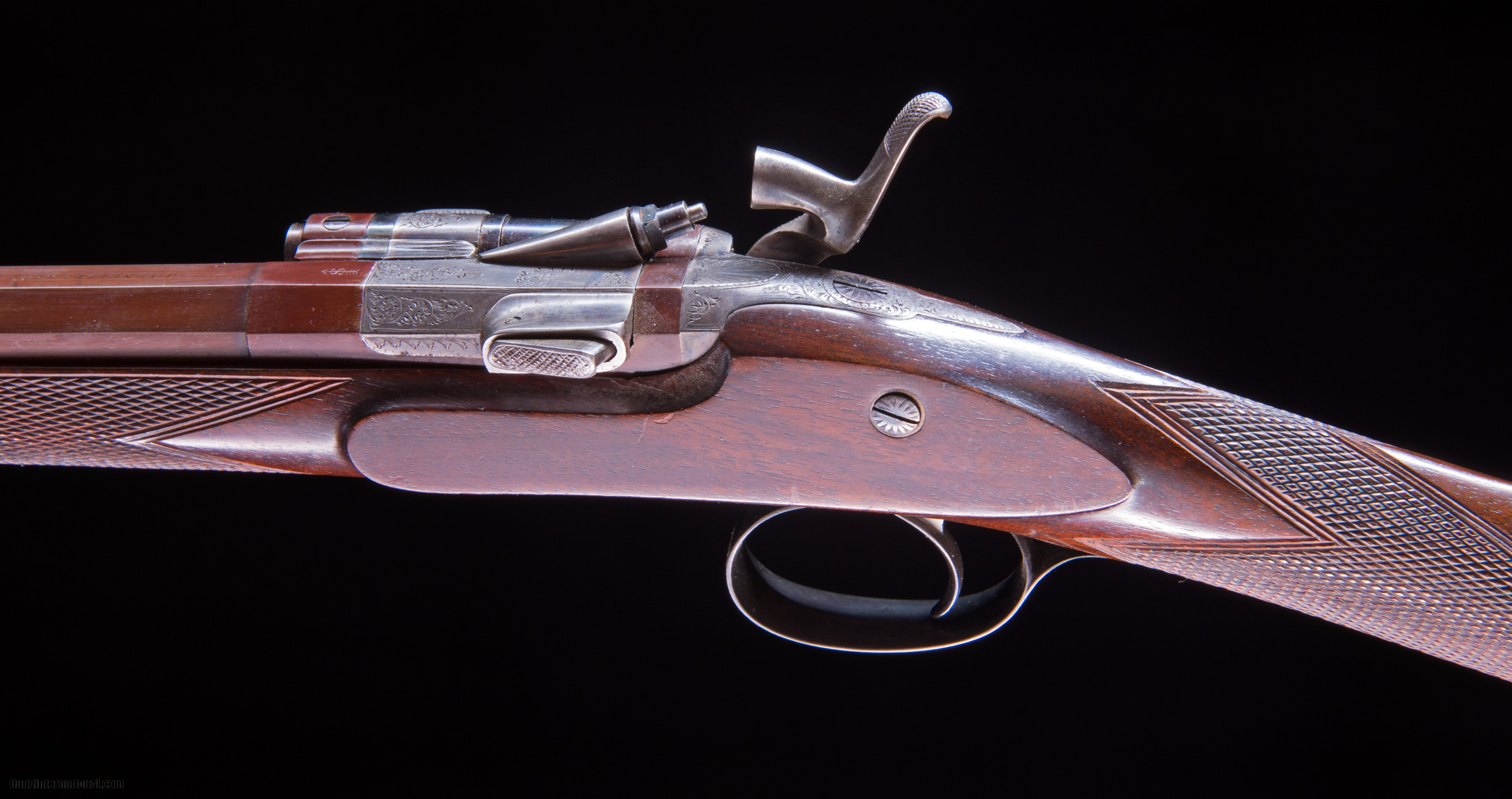 A truly elegant rifle, and even more, almost a work of art, and as the English like to say "Rare as rocking horse shit. *** Note: To see this gun with high resolution photos and a zoom-in feature, go to the vintagedoubles main site and search for the gun ID: 3308 or browse the main site to see our full gun collection.