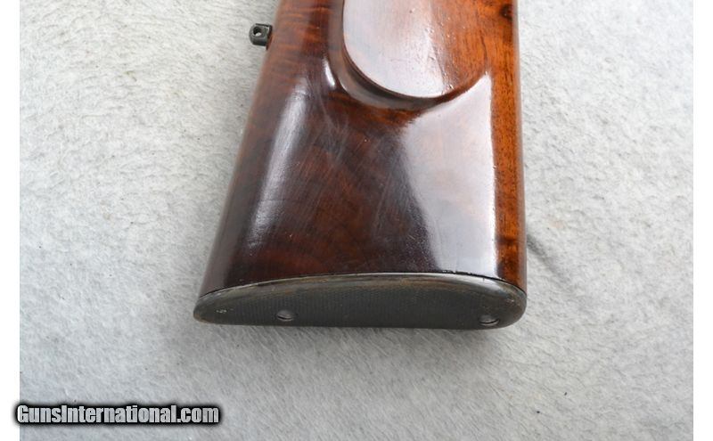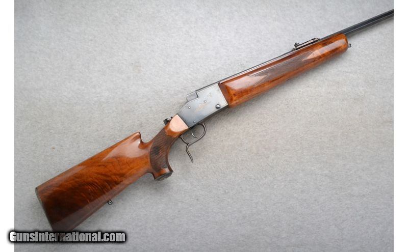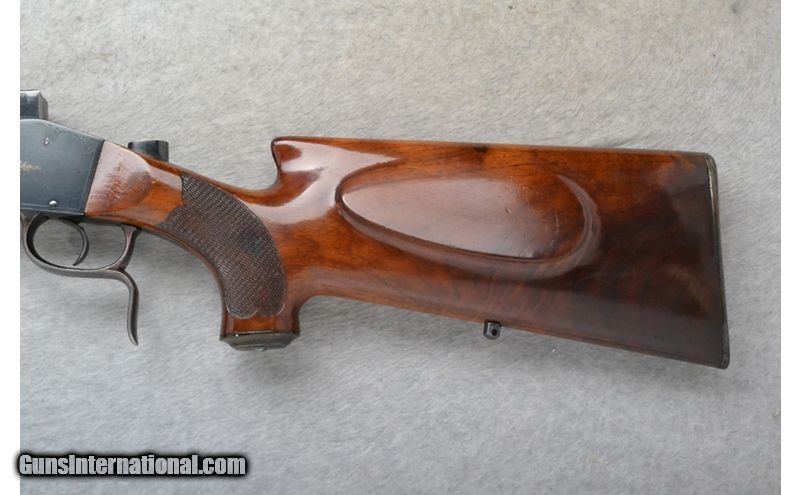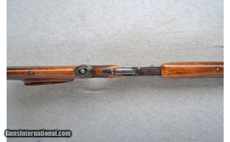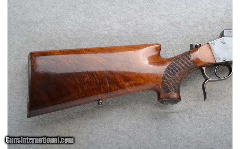 Description: This FR Langenhan Falling Block Model is a single shot lever action rifle in .22 Long Rifle Cal. It has a 28.5 inch octagon barrel. A blade front sight and an adjustable notch middle sight. The butt stock is a checkered grip walnut pistol grip with a raised cheekpiece and black cap. The forearm is a checkered grip walnut with finger grooves. The receiver is lightly engraved. S/N 7149. .22 Long Rifle SOLD Chambers: Single Shot. Metal Condition: Very Good. Some minor handling marks and freckling spots. Wood Condition: Good. Some light handling marks. Bore Condition: Excellent. Barrels: 28.5 inch octagon barrel. Stock Dimensions: LOP 14 inches. Fore End: Checkered grip walnut with finger grooves. Butt Pad: Checkered plate. Weight: 8 Lb. 0 Oz. Sights: Raised blade front. Adjustable notch middle. Item Location: Richfield, WI |