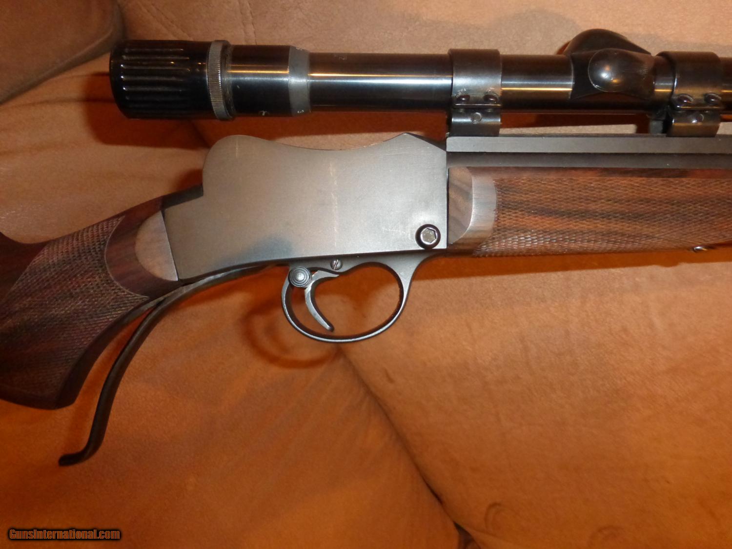 Description: Custom Martini rifle in 22 K Hornet. AAA Walnut stock & forarm. Fine checkering. European style. Ebony forarm tip. Custom safety. Nice trigger. Barrel is sporter weight, 22" mint bore. Buttstock is 13 1/2" LOP. Has vintage 7/8" Weaver 3-6x scope with vintage weaver interlok tip-off rings. This model can be cleaned through the chamber by drop-out of block assembley. Great little gun with style. Buyer pays shipping. C&R ok. SOLD Curio/Relic: Yes |